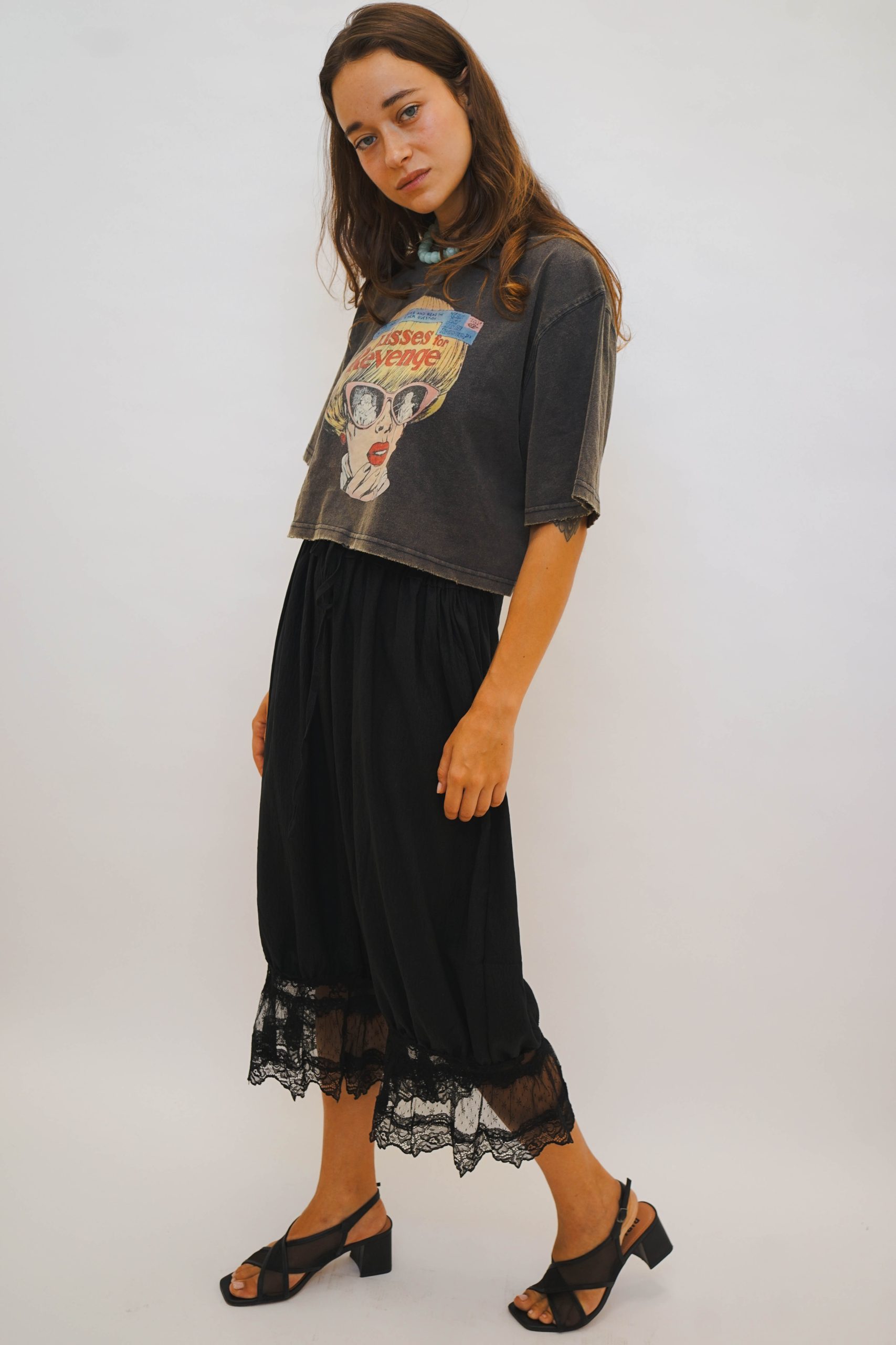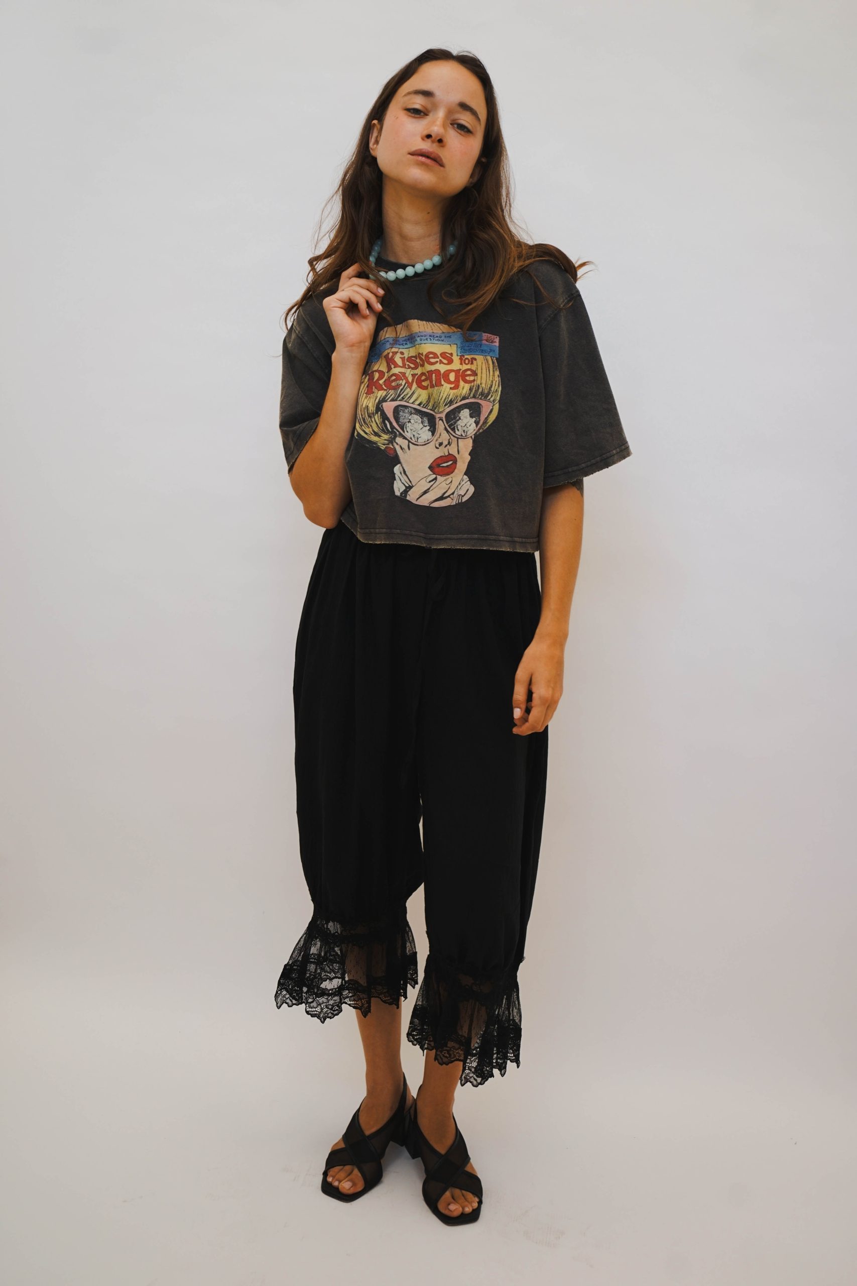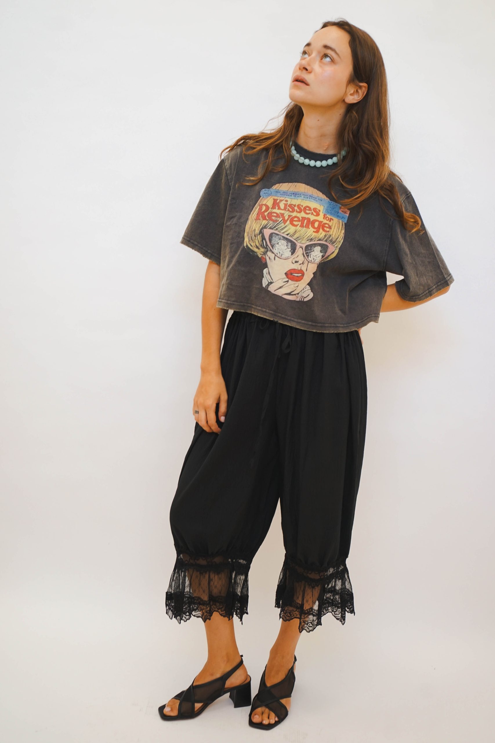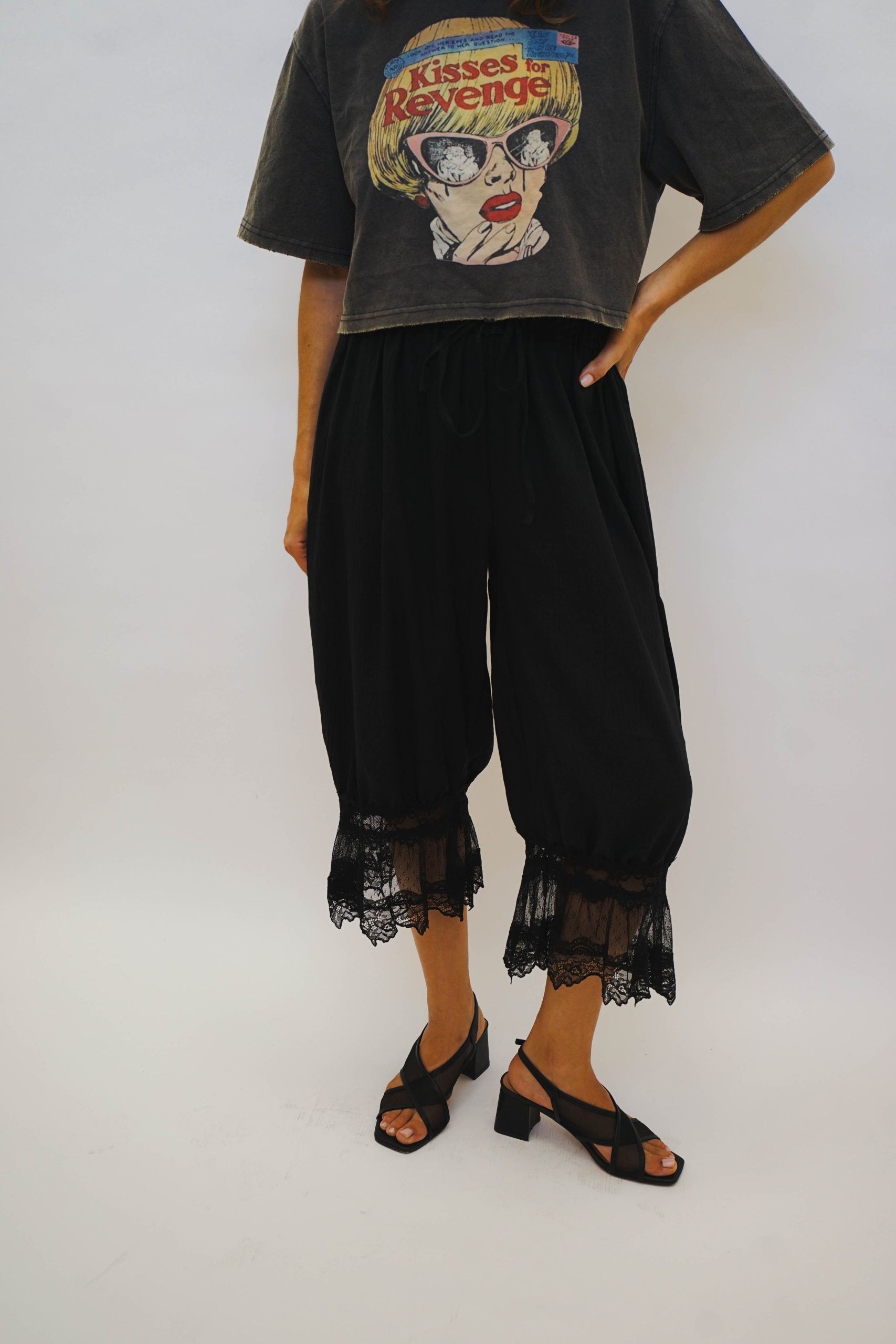 מכנס בגזרת בלון רומנטית ונפוחה, באורך של שלושת רבעי, עשוי מבד קליל ונושם שמתאים במיוחד לעונות החמות. הגומי במותן ובקרסוליים מאפשר התאמה נוחה ומראה מחמיא. הקצה התחתון מעוטר בבד מקומט שמוסיף טאץ’ ייחודי.