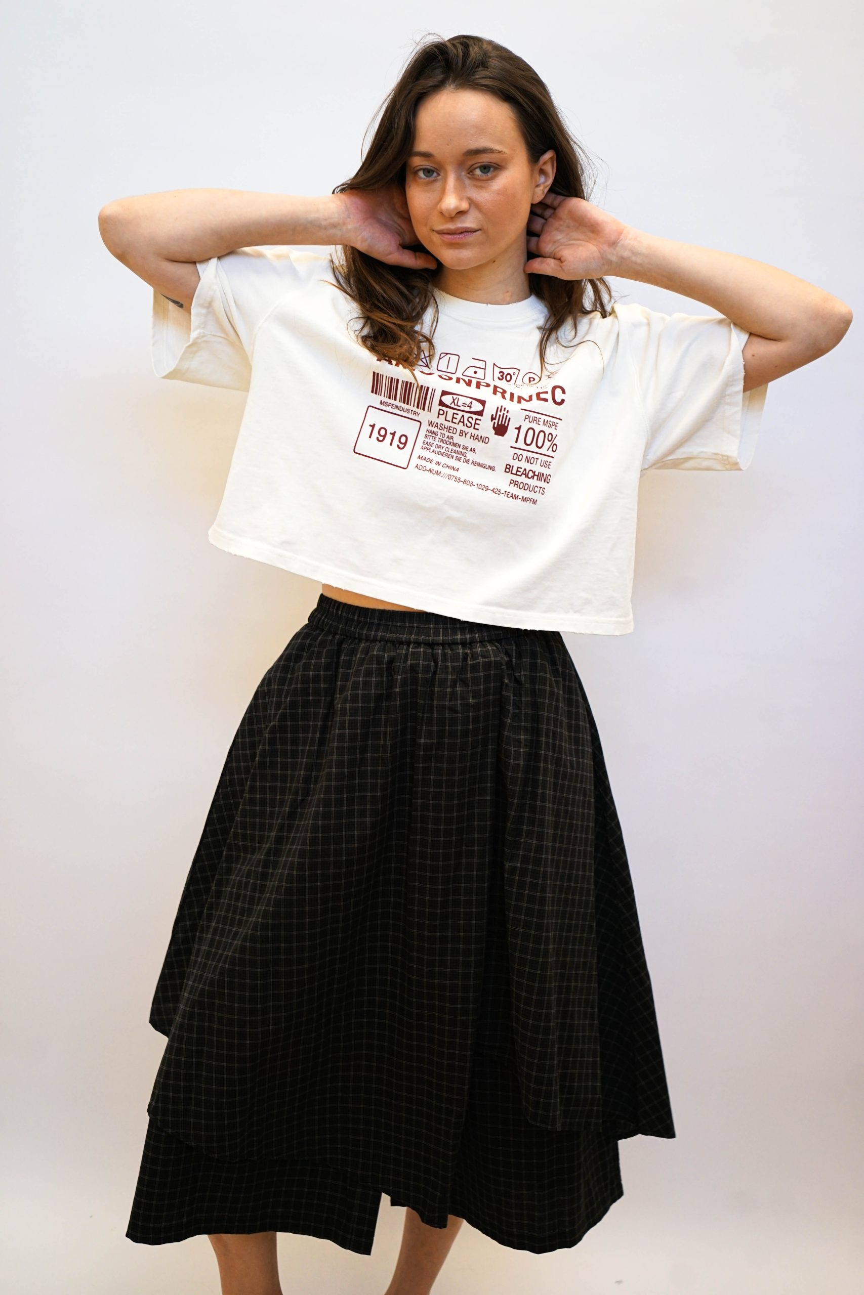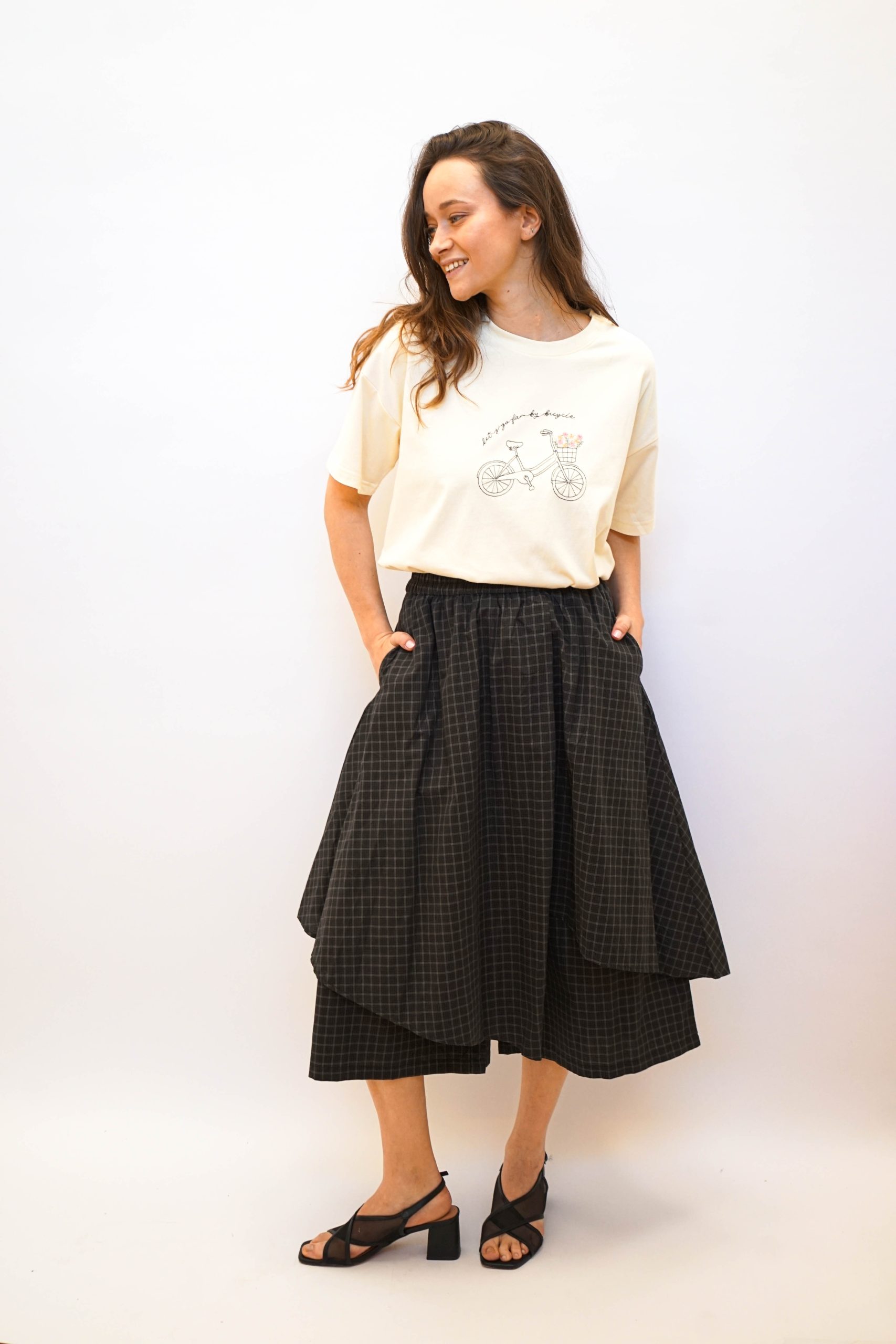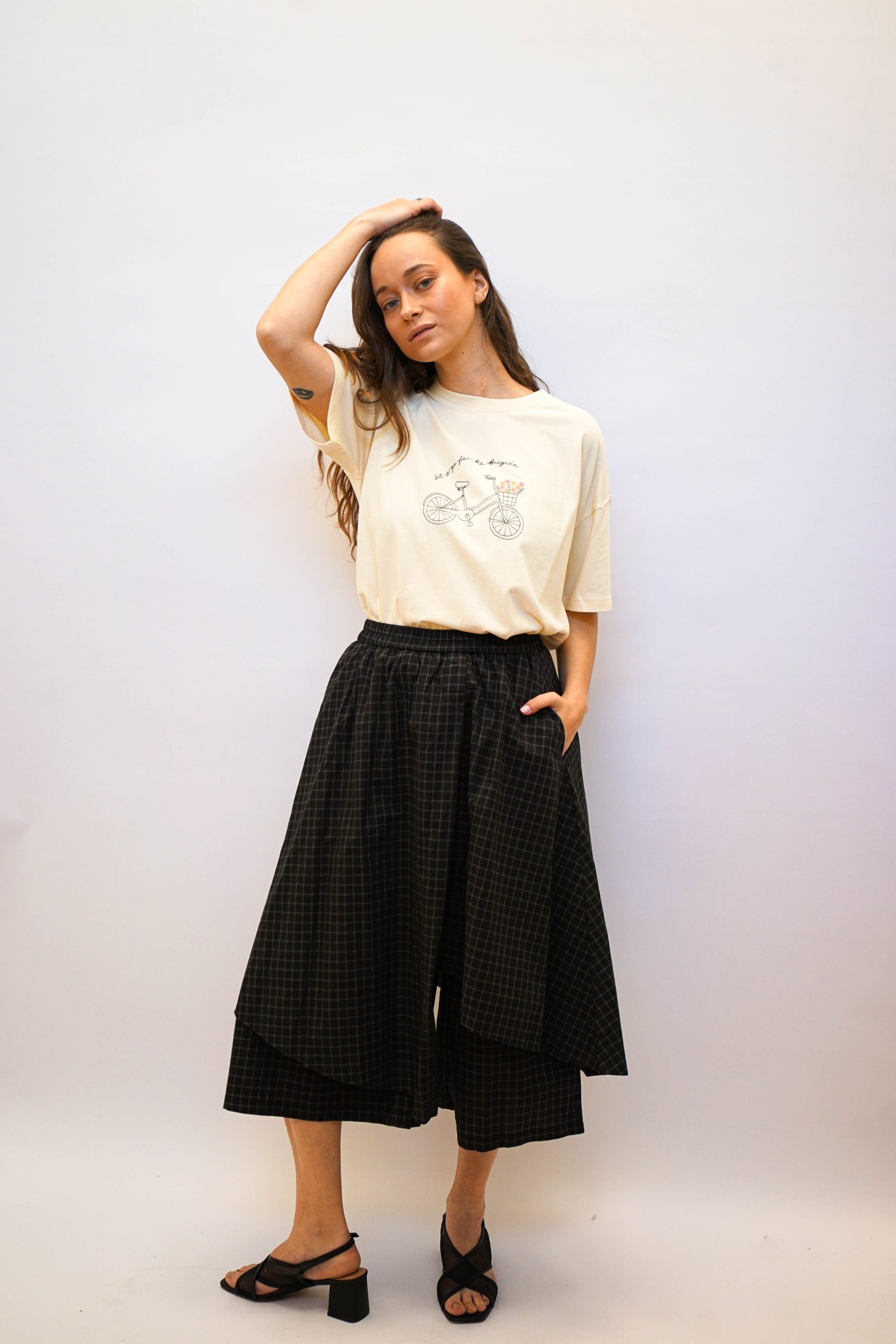 חצאית שיבוץ דק לבן על שיבוץ קטן שחור זית גומי קשירה במותן עם שרוך קשירה שחור. חצאית גזורה באלכסון. ומתחת מכנסיים למראה קוריאני רחוב מושלם. ניתן לשלב עם טי אופני העיר טי קרופ או חולצה מכופתרת בד 100% כותנה. היקף: 1 מטר אורך: המכנסים 82 החצאית 71