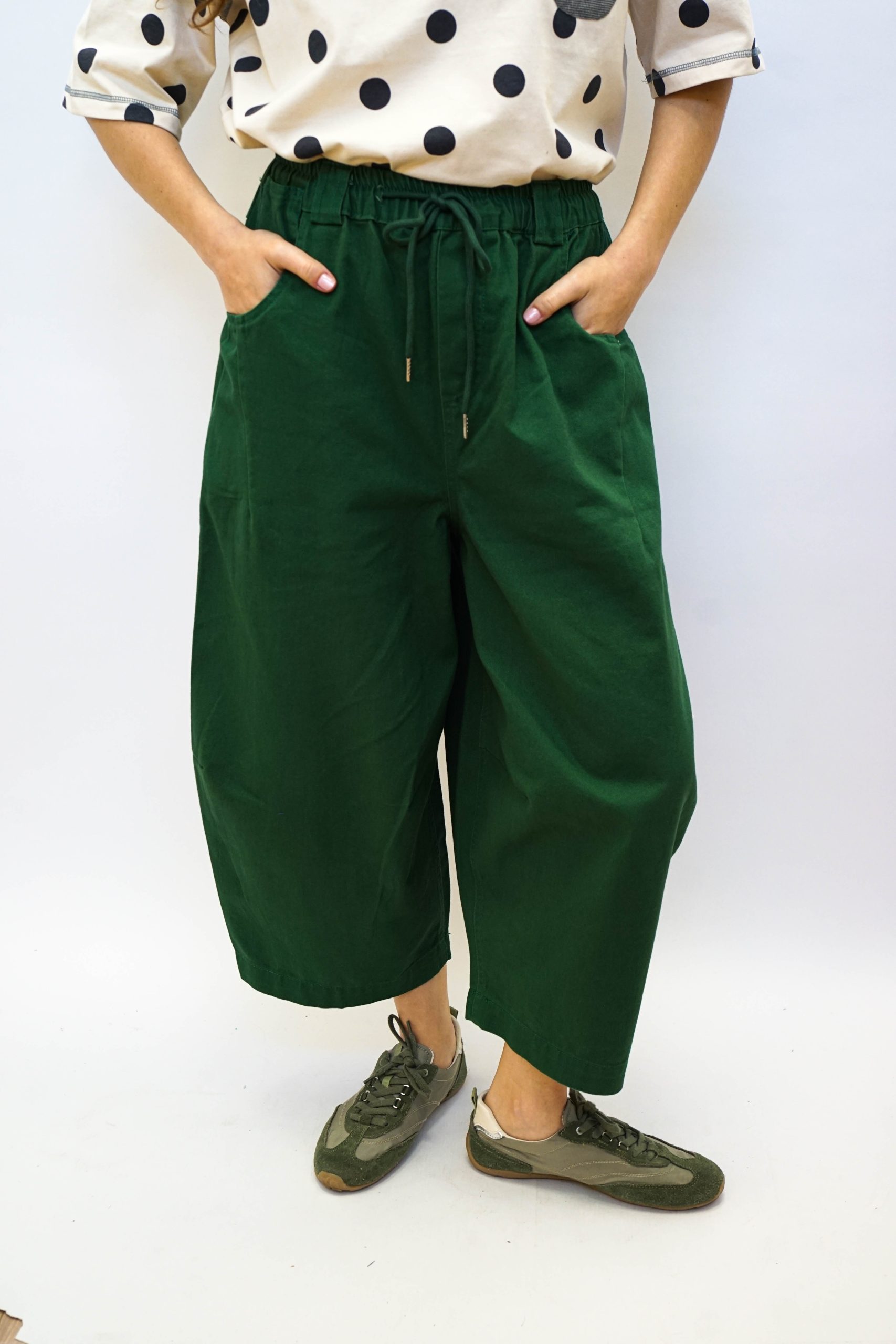מכנסיים בגזרה רחבה ומשוחררת (בארל). עם גומי ושרוך קשירה במותן בצבע המכנסיים. עם כיסים צדדיים עמוקים.וכיסים מאחור ניתן לשלב עם טי לירוי שחורה.או ווסט תותי בד 100% כותנה אורך : 90 היקף : מטר