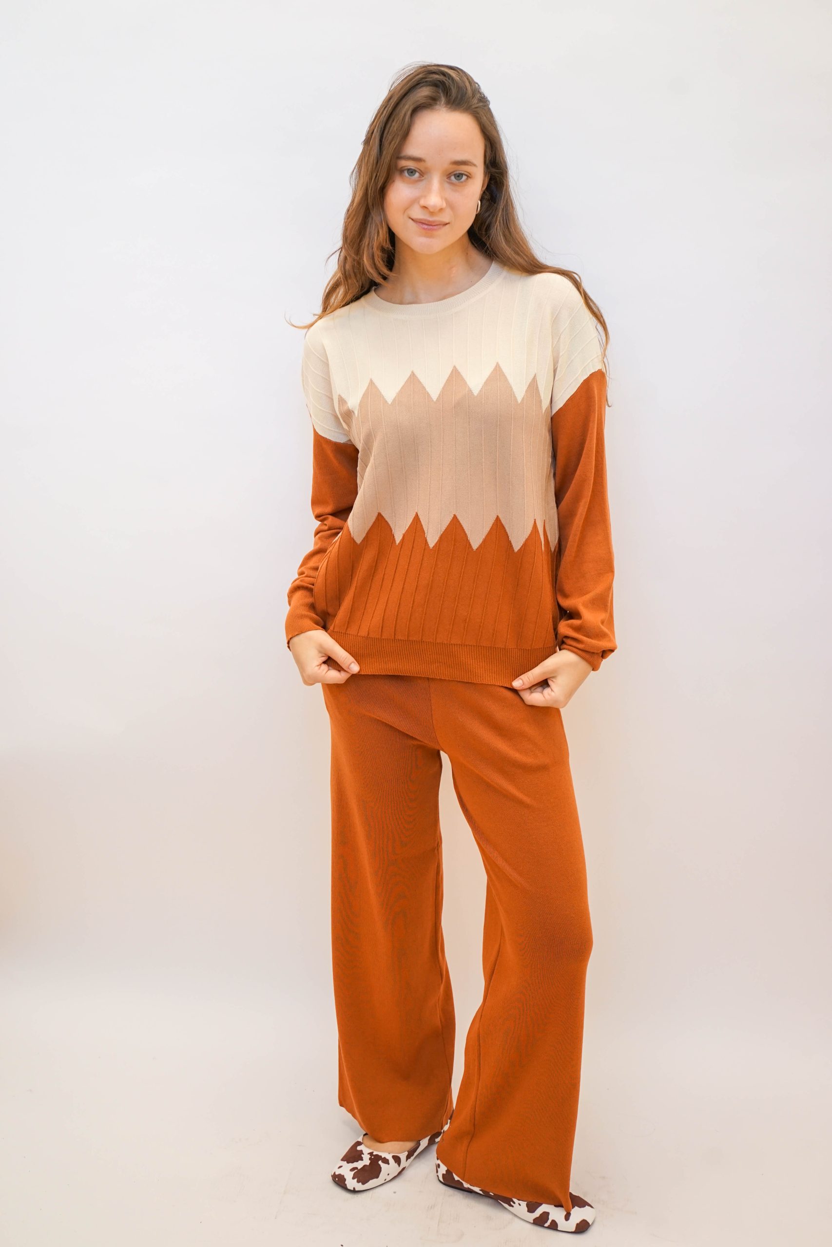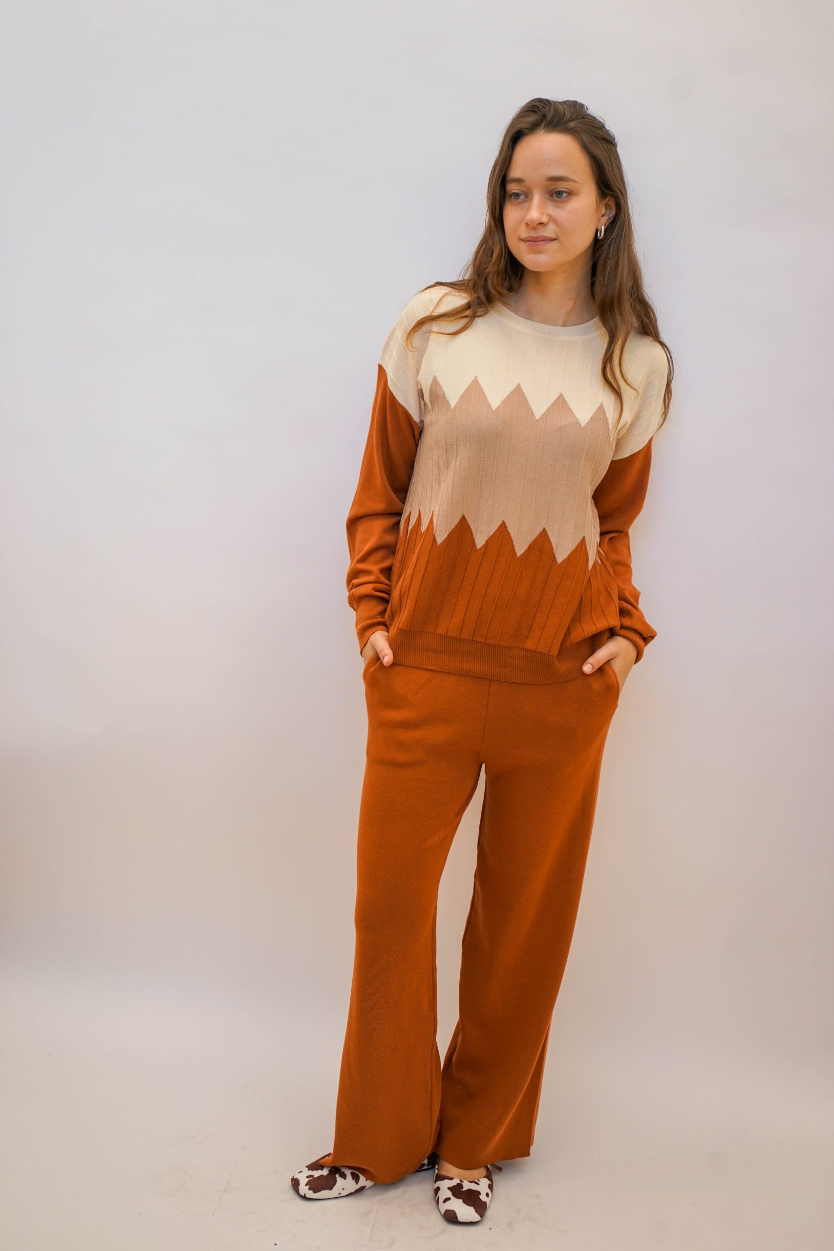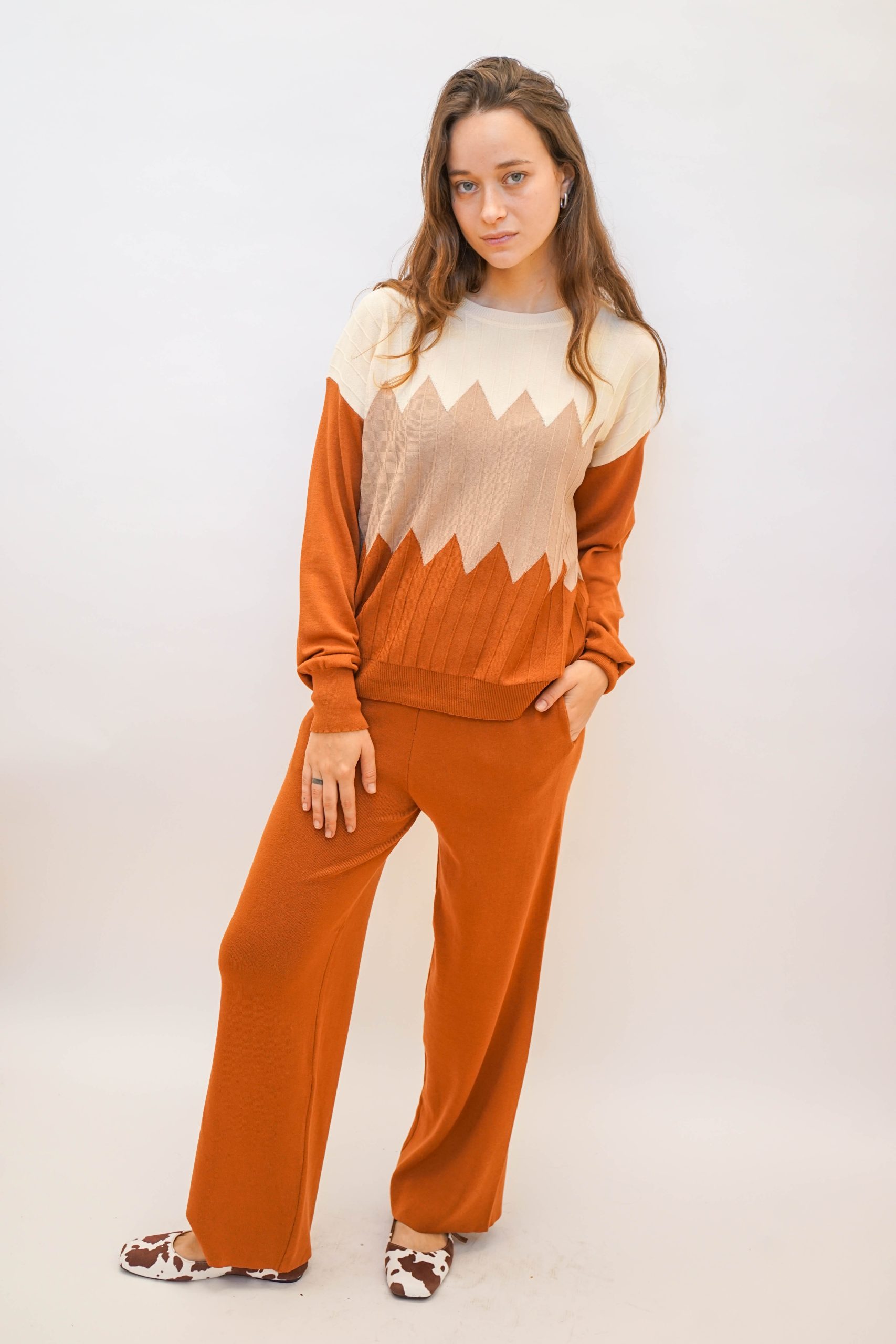 חליפה נעימה ללוק לא מתאמץ בגוונים חומים נטורלים. חליפה סופר נוחה מבדים נעימים בחלק התחתון והעליון. מושלמת ללוק סטייל לעבודה עם סניקרס ותיק צד צבעוני לקונטרס עם צבעי החליפה. מכנסיים – אורך : 101 היקף : 1 מטר ניתן פה לרכוש רק את המכנסיים
