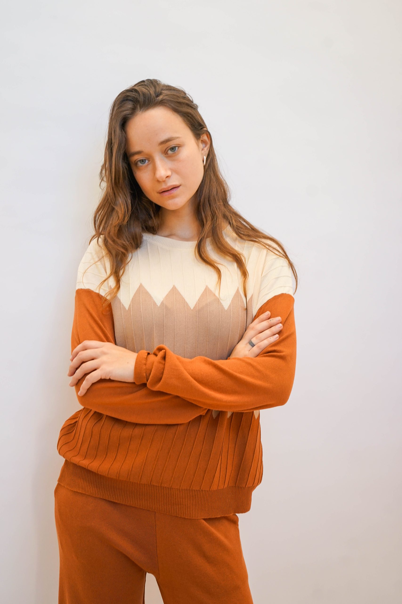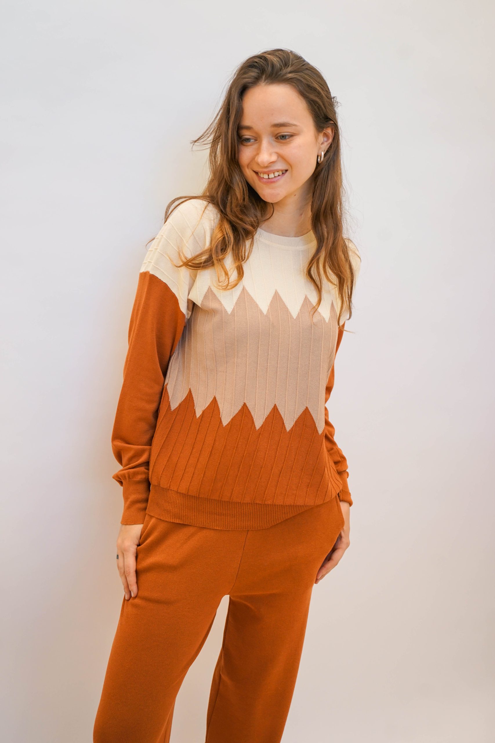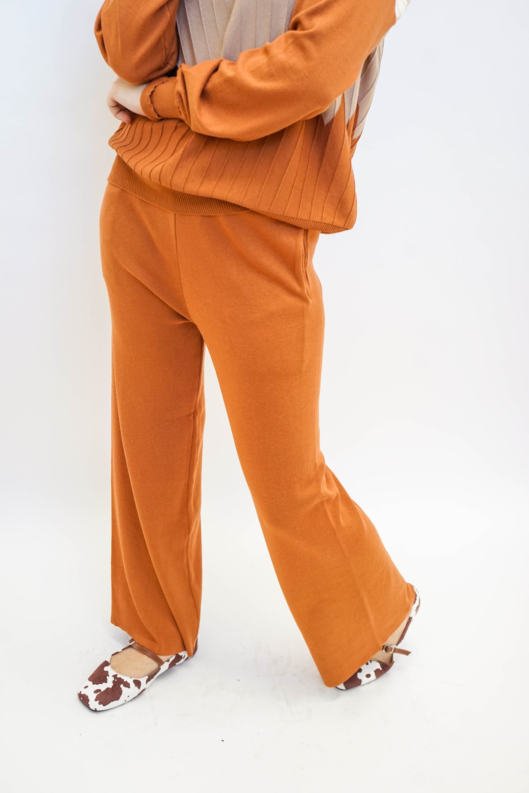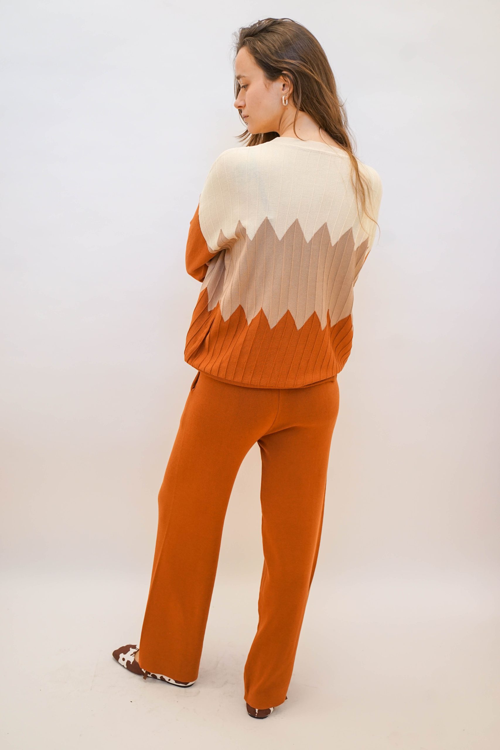 חליפה נעימה ללוק לא מתאמץ בגוונים חומים נטורלים. חליפה סופר נוחה מבדים נעימים בחלק התחתון והעליון. מושלמת ללוק סטייל לעבודה עם סניקרס ותיק צד צבעוני לקונטרס עם צבעי החליפה. מכנסיים – אורך : 101 היקף : 1 מטר ניתן פה לרכוש רק את המכנסיים