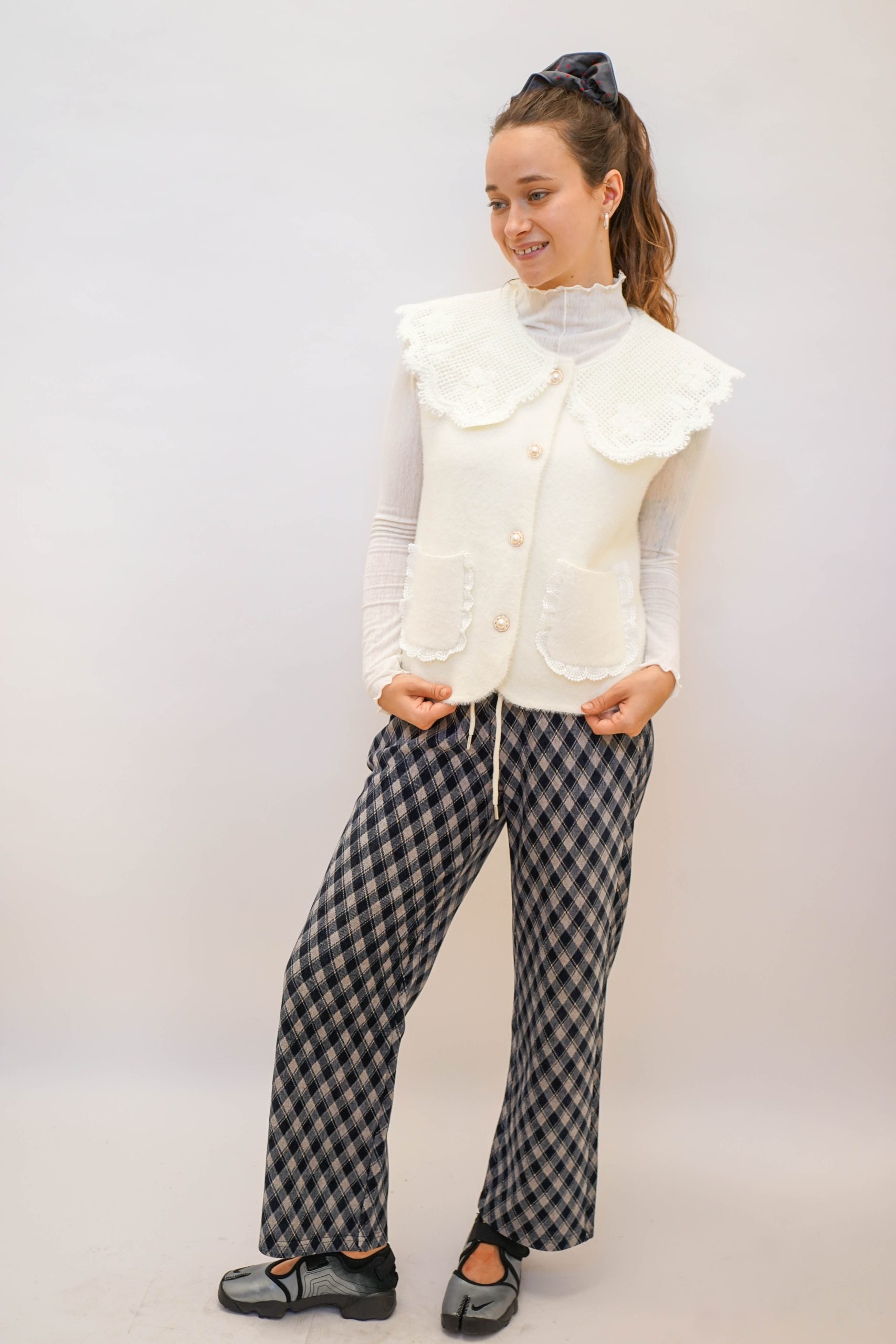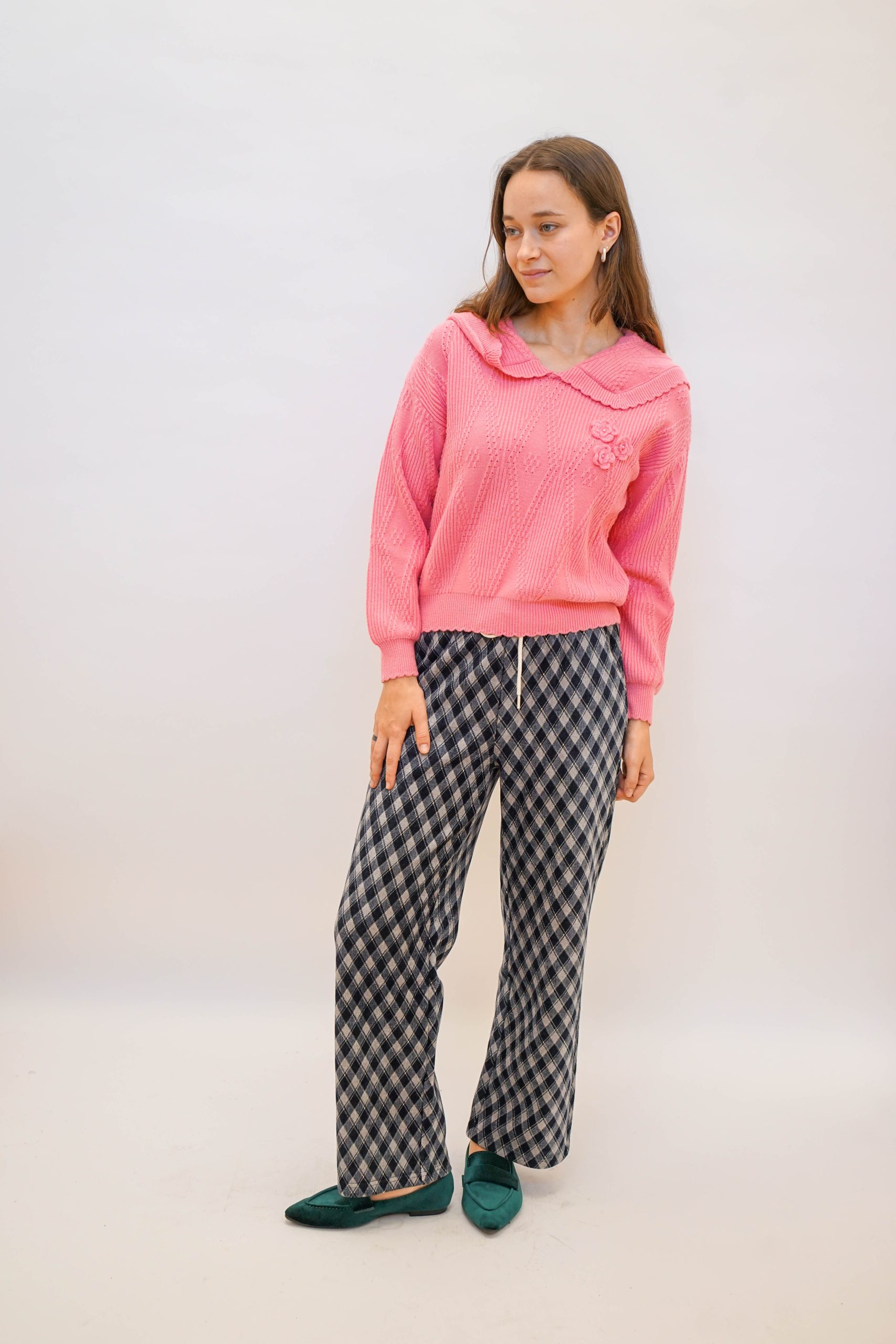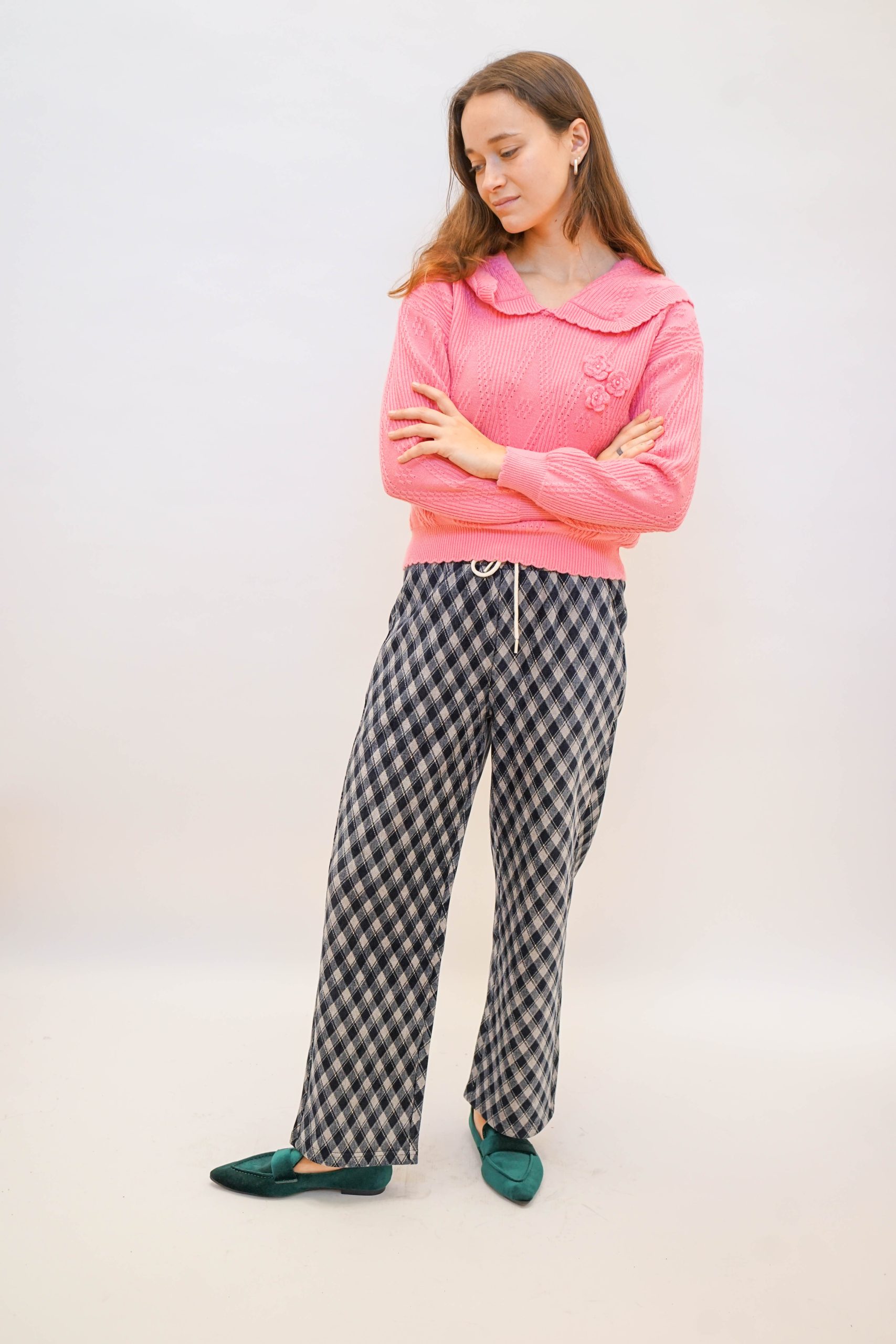 מכנסיים קורדרוי כחול אפור בפרינט מעויניים למראה שיקי מושלם. מכנסיים עם גומי שמשדרים סטייל בלי להתפשר על הנוחות שלך במהלך היום. ניתן לשלב עם טישרט או חולצה ארוכה בצבעי פלטת החורף-בורדו, סגלגל כהה או ירוק עמוק,עם ווסט לבן או סריג בז' לבן בתמונת עם חולצת ערב בצבע כאמל קטיפתי מושלם ג"קט חום או בז' עם סניקרס וסגרת פינה בסטייל.