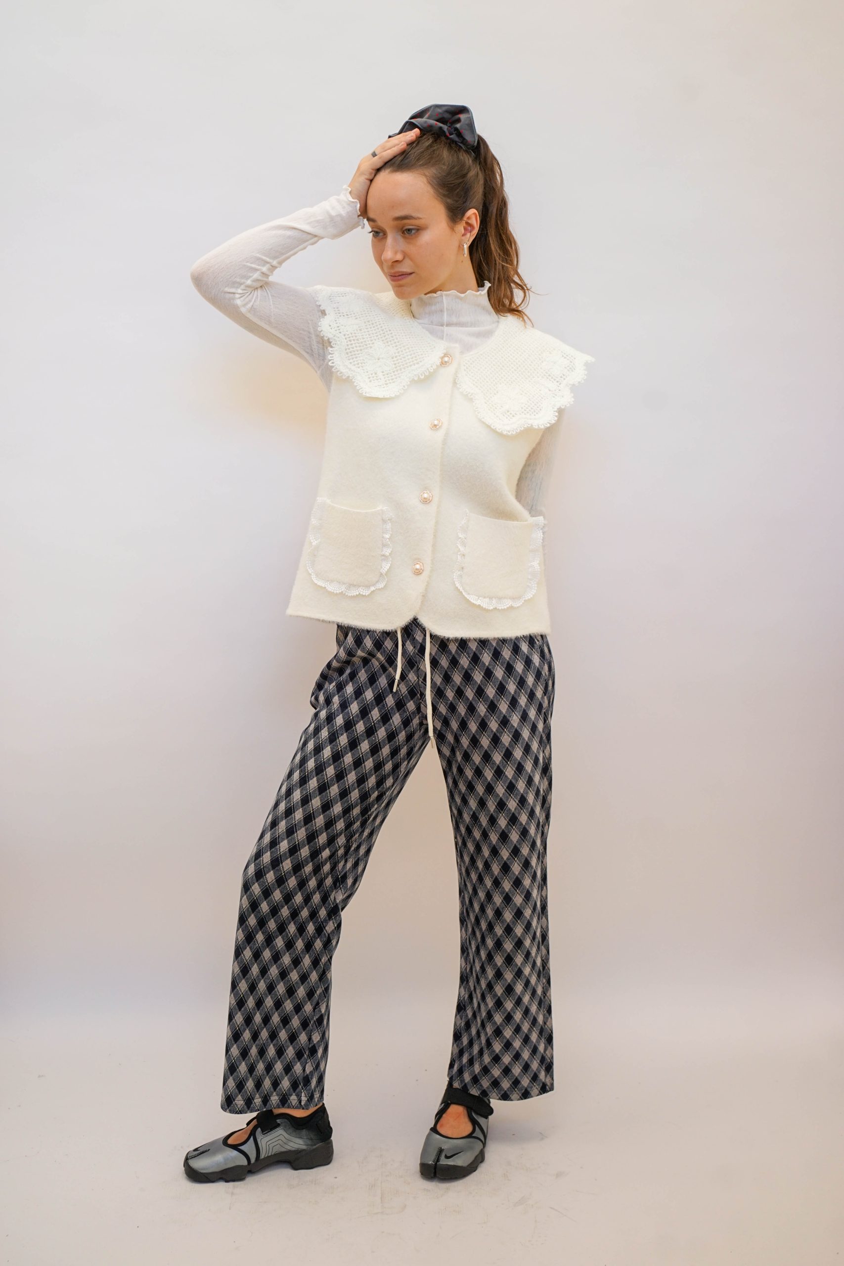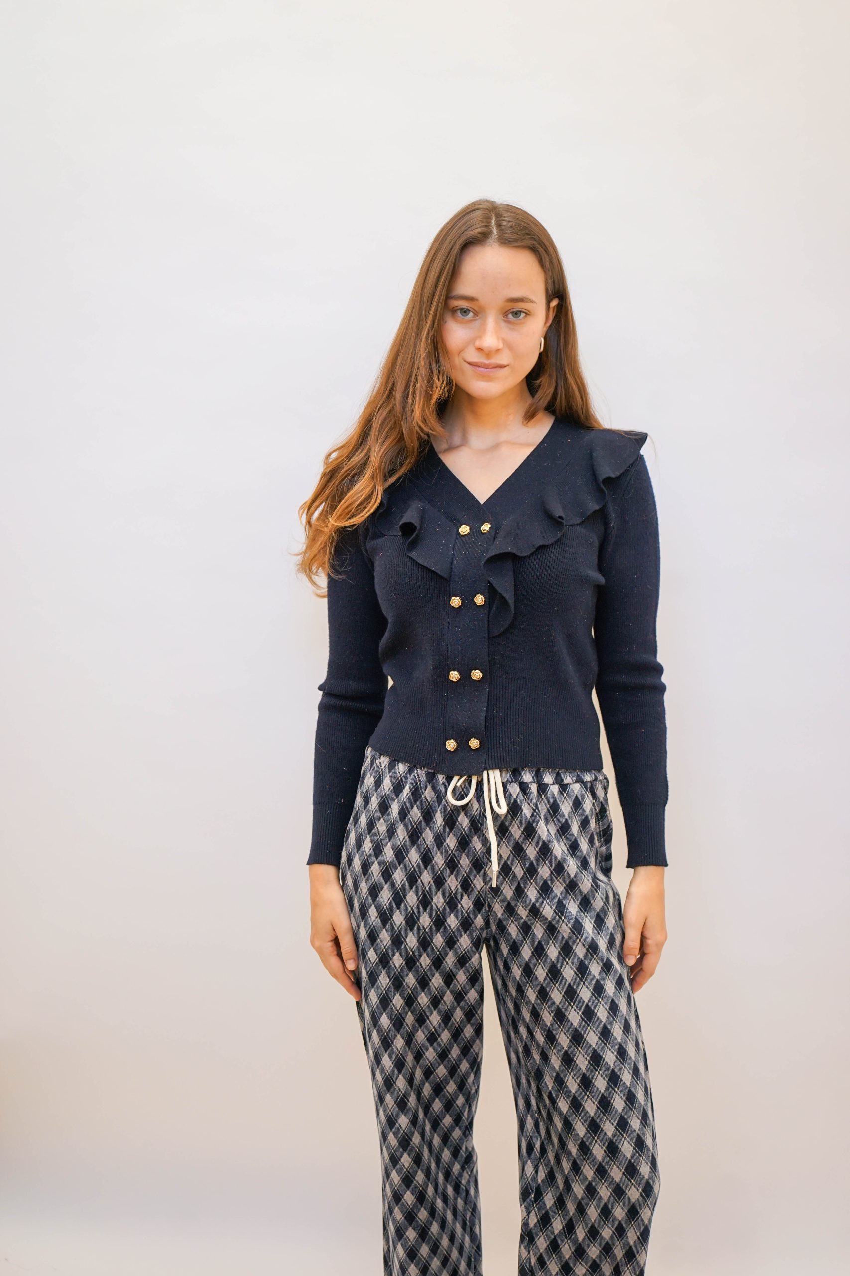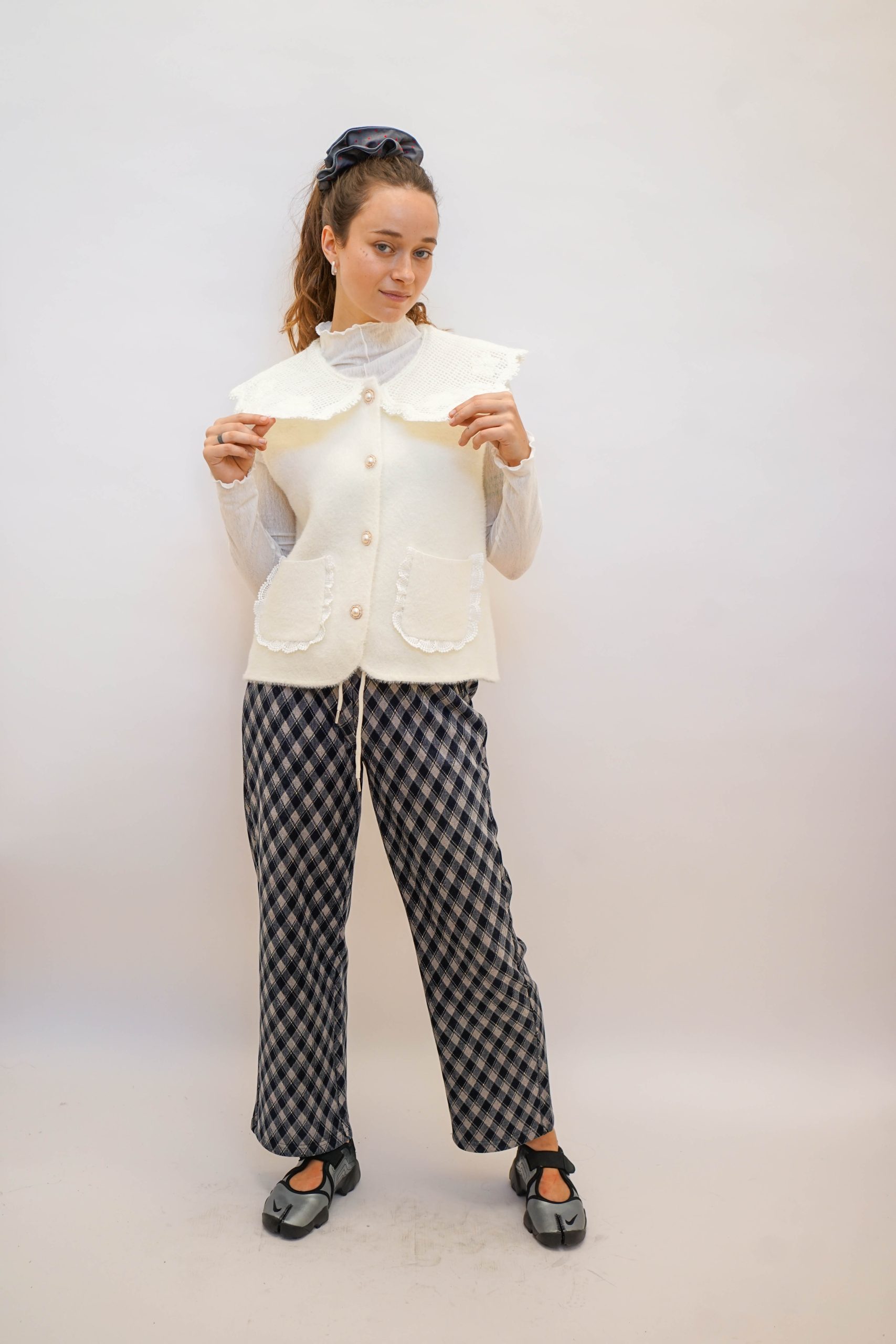 מכנסיים קורדרוי כחול אפור בפרינט מעויניים למראה שיקי מושלם. מכנסיים עם גומי שמשדרים סטייל בלי להתפשר על הנוחות שלך במהלך היום. ניתן לשלב עם טישרט או חולצה ארוכה בצבעי פלטת החורף-בורדו, סגלגל כהה או ירוק עמוק,עם ווסט לבן או סריג בז' לבן בתמונת עם חולצת ערב בצבע כאמל קטיפתי מושלם ג"קט חום או בז' עם סניקרס וסגרת פינה בסטייל.