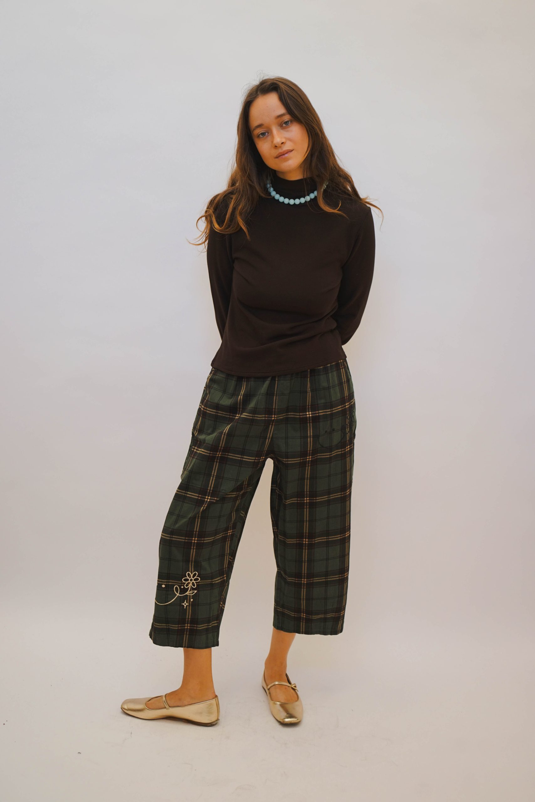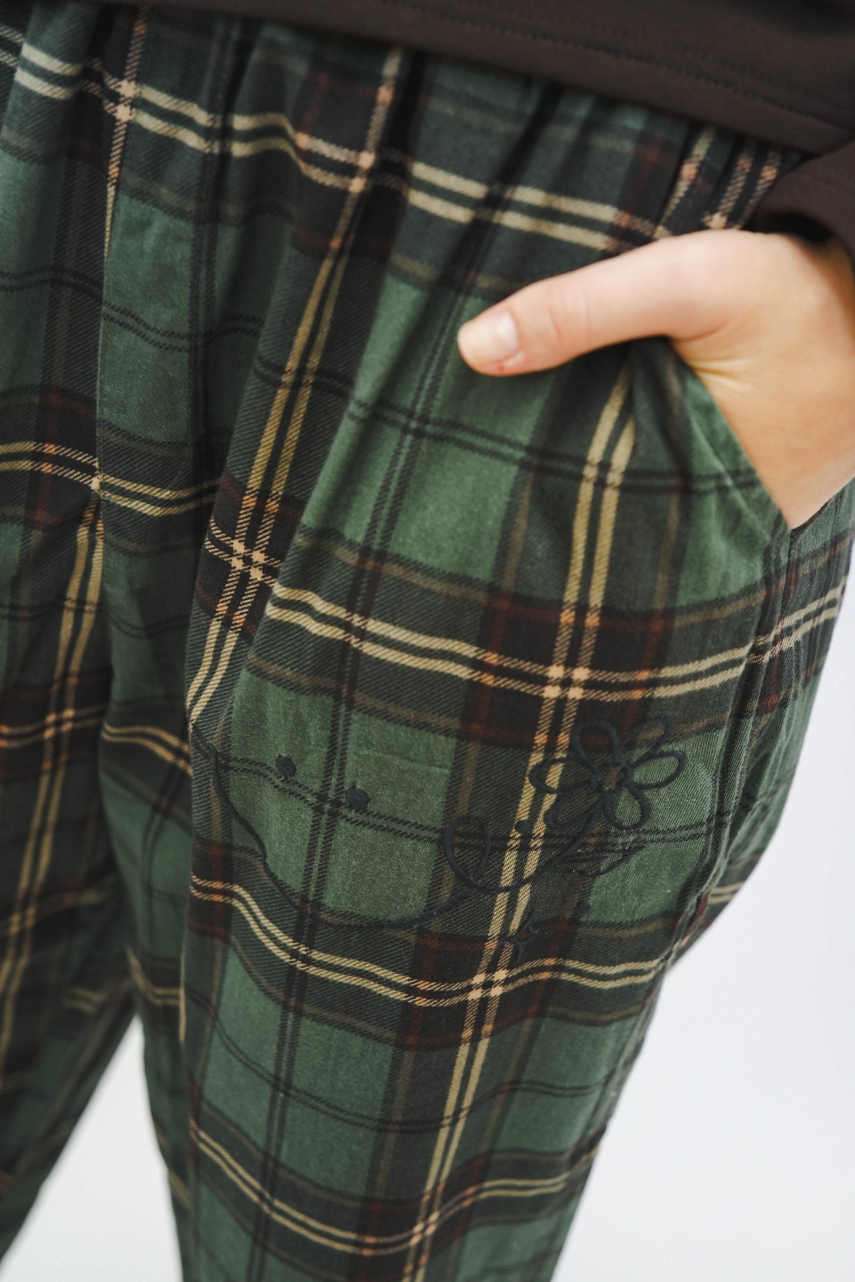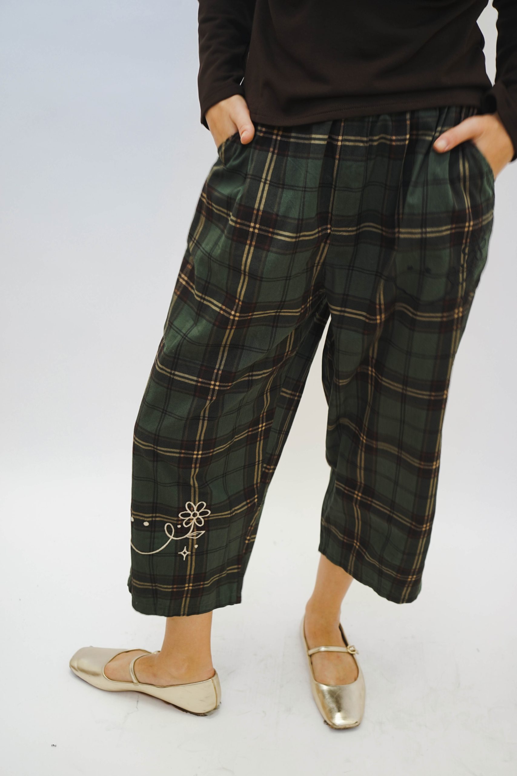 מכנסים משובצים בצבע ירוק חום ריקמת פרח מחייך ליד הכיס ובסיומת . בגזרה מעט רחבה נוחות ונעימות עם גומי במותן וכיסים מושלמות עם טישרט לבנה ג'קט ג'ינס או כל סריג אפור. לבן, שחור,חום ואפילו ורוד