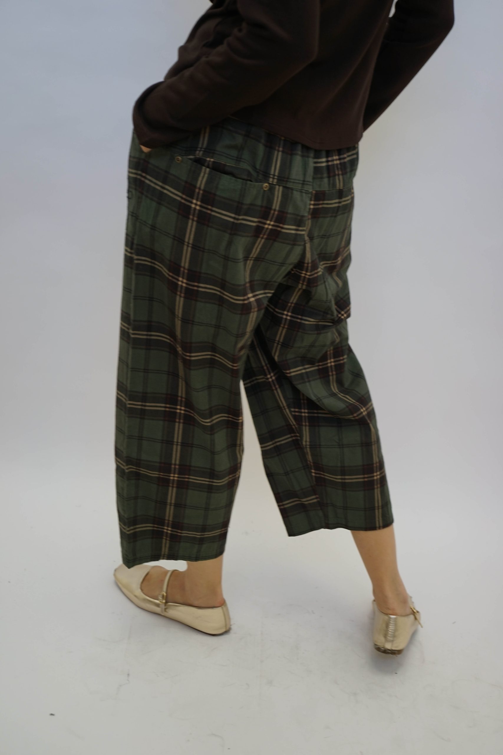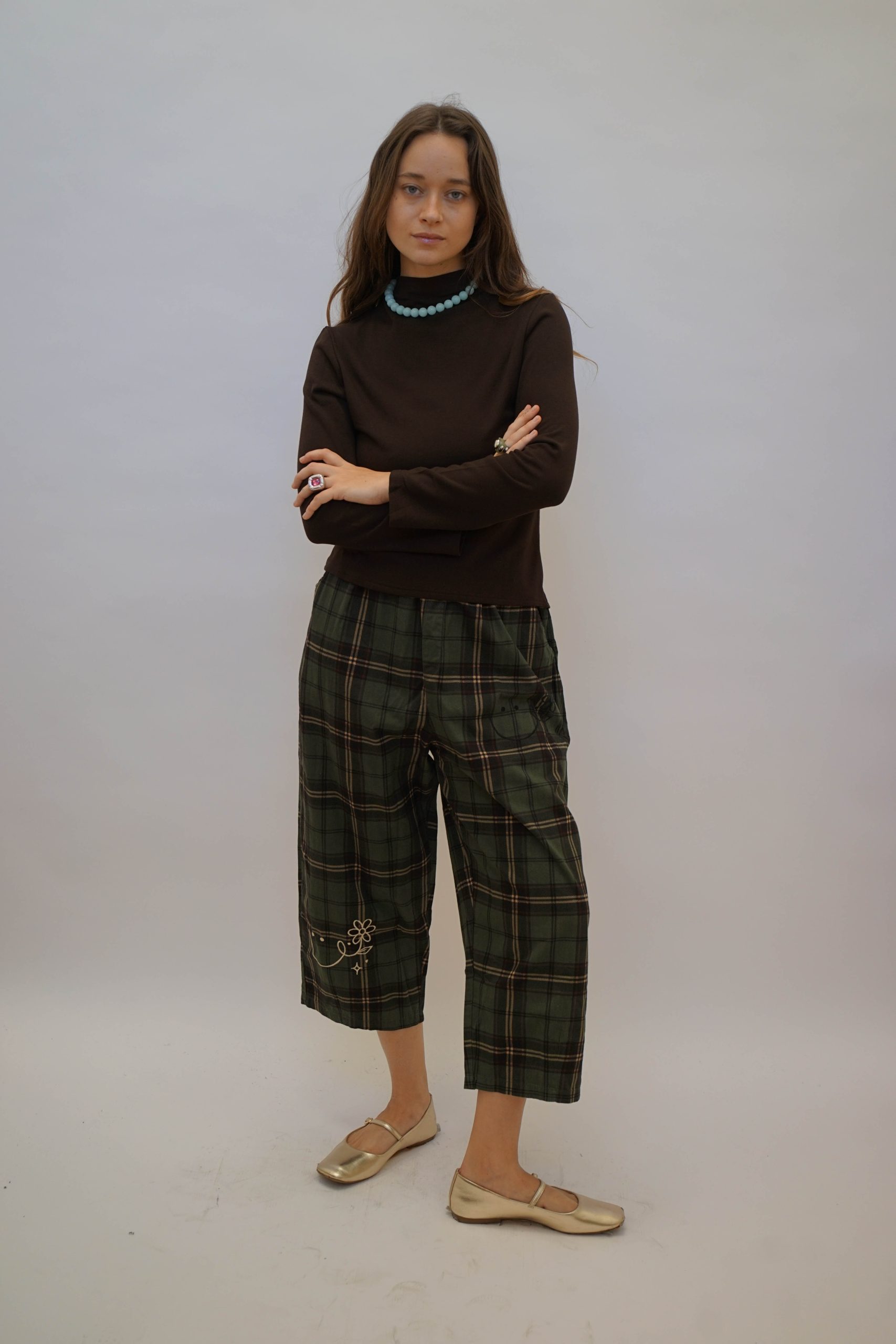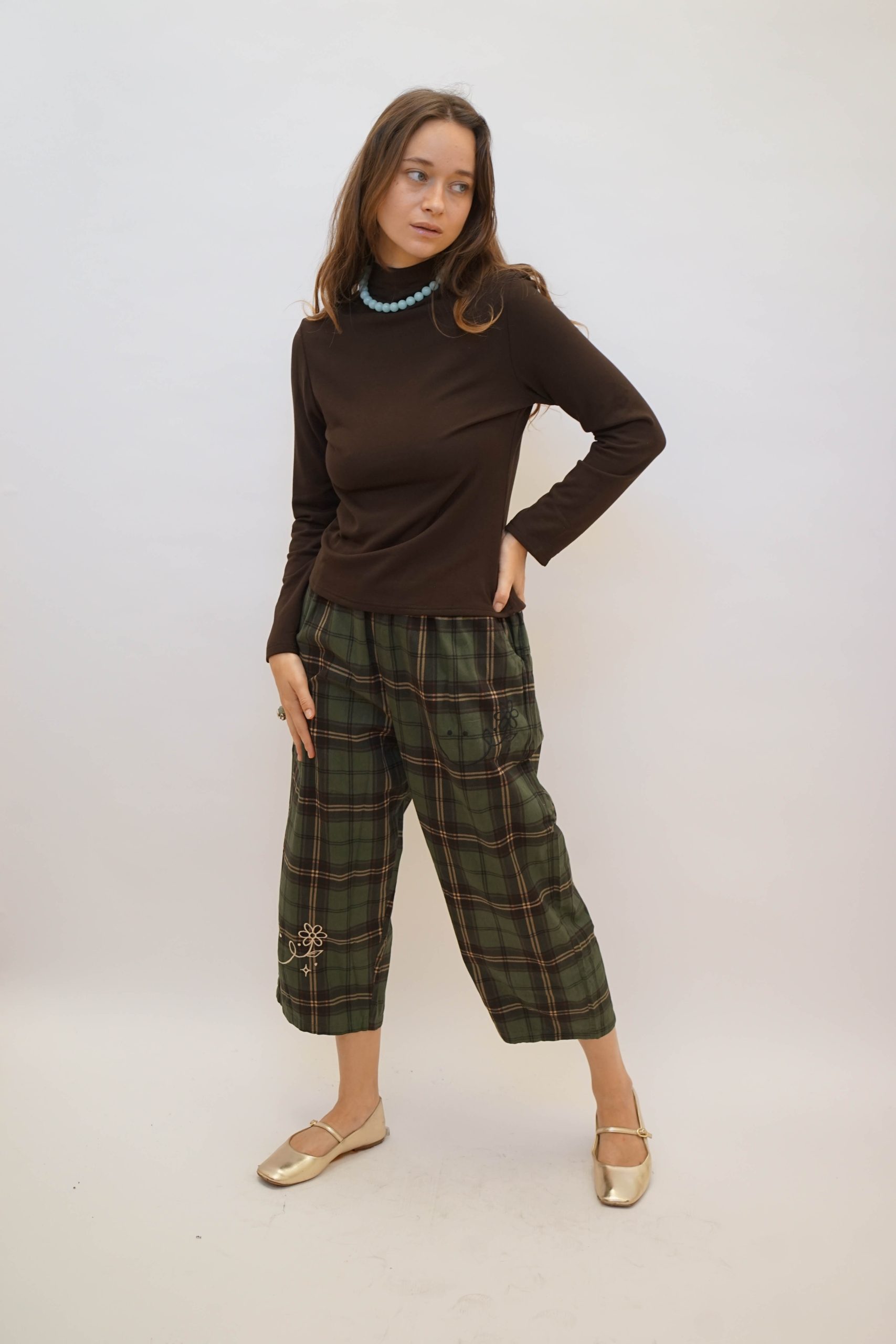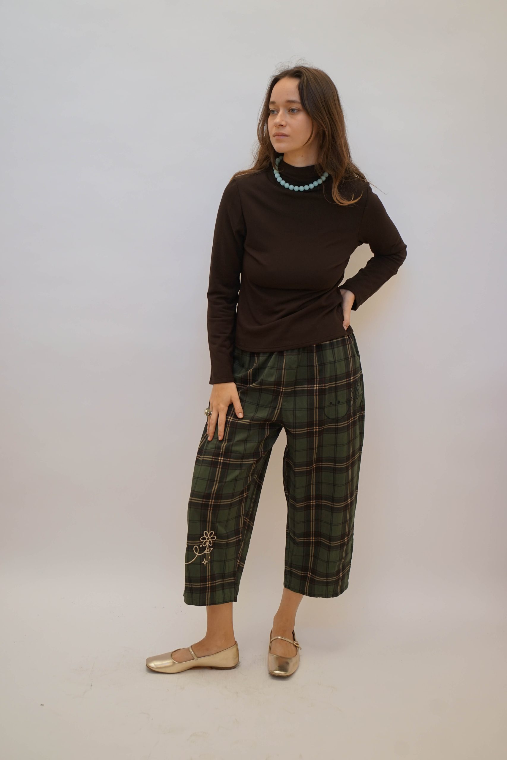 מכנסים משובצים בצבע ירוק חום ריקמת פרח מחייך ליד הכיס ובסיומת . בגזרה מעט רחבה נוחות ונעימות עם גומי במותן וכיסים מושלמות עם טישרט לבנה ג'קט ג'ינס או כל סריג אפור. לבן, שחור,חום ואפילו ורוד