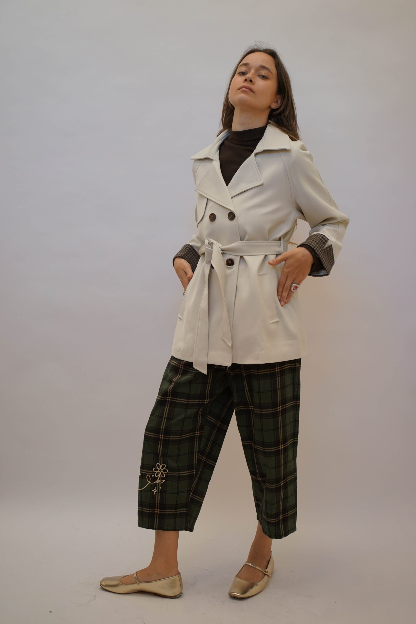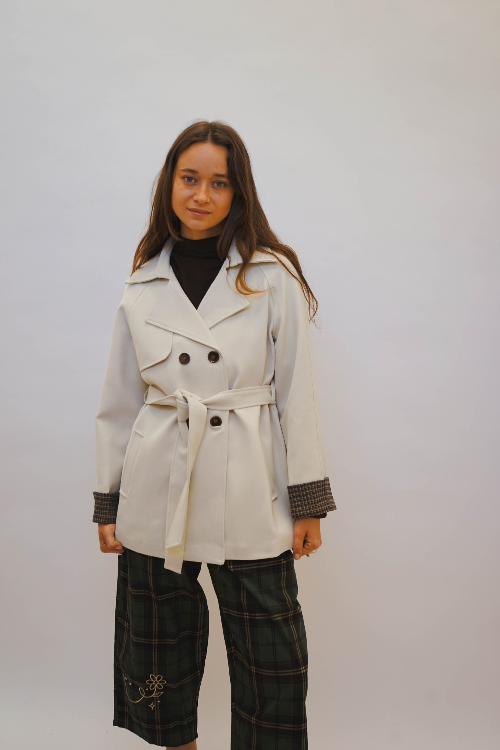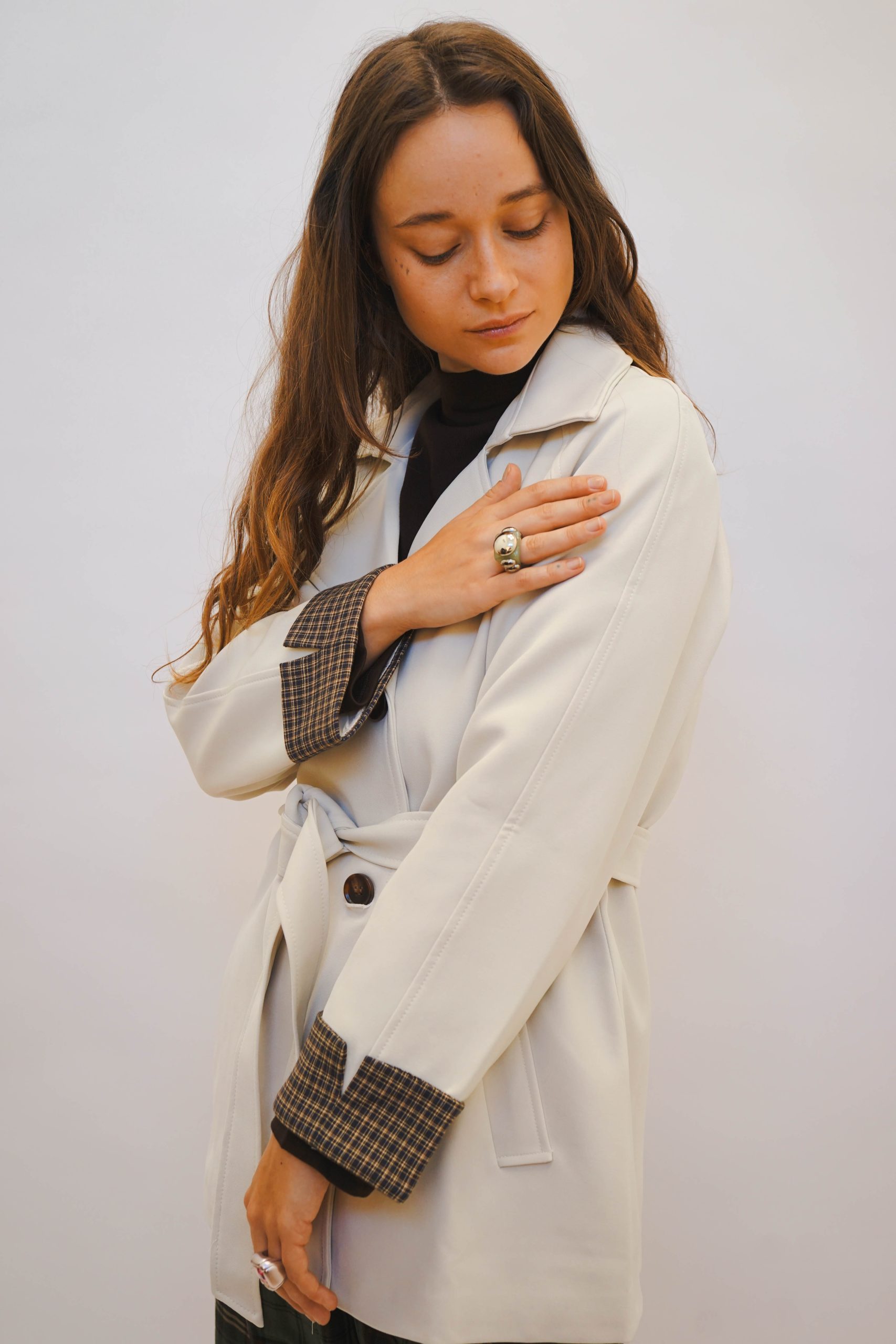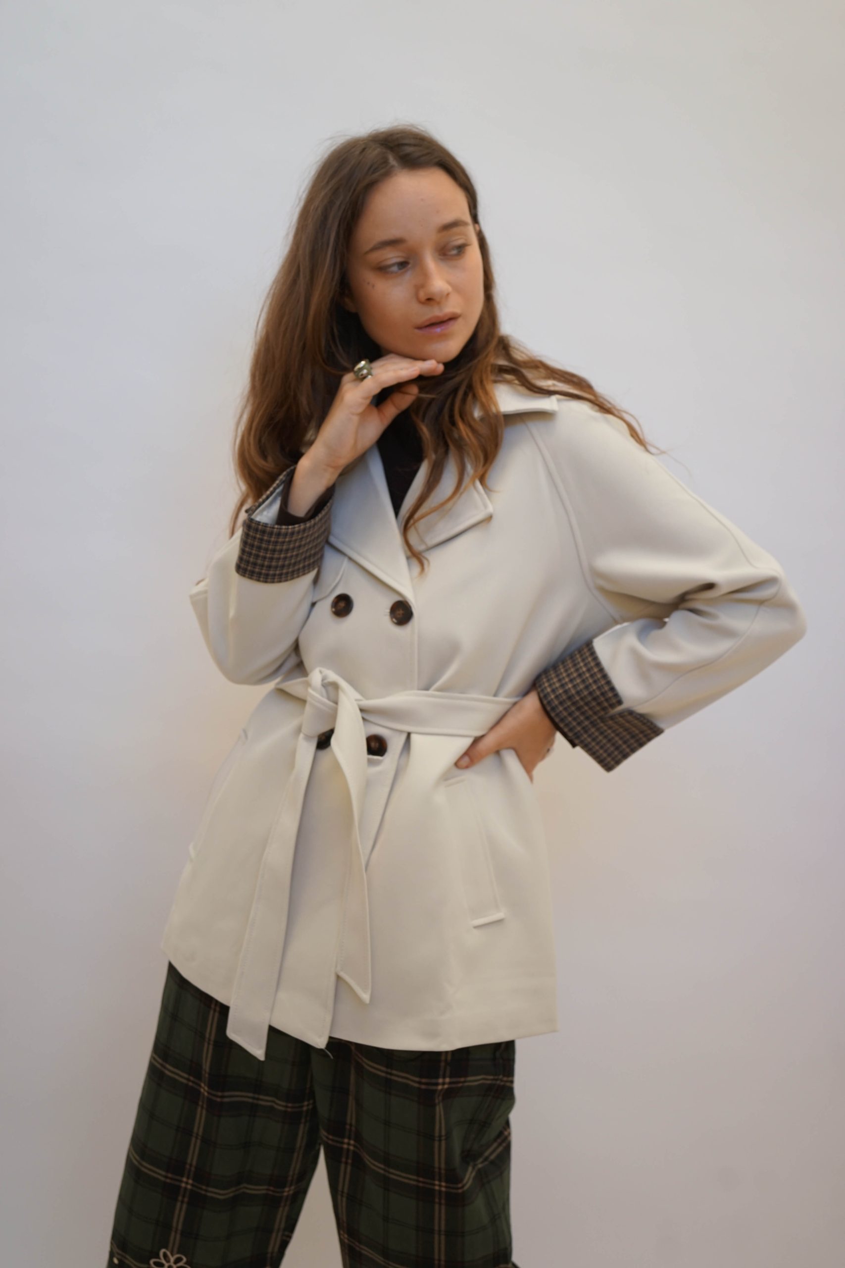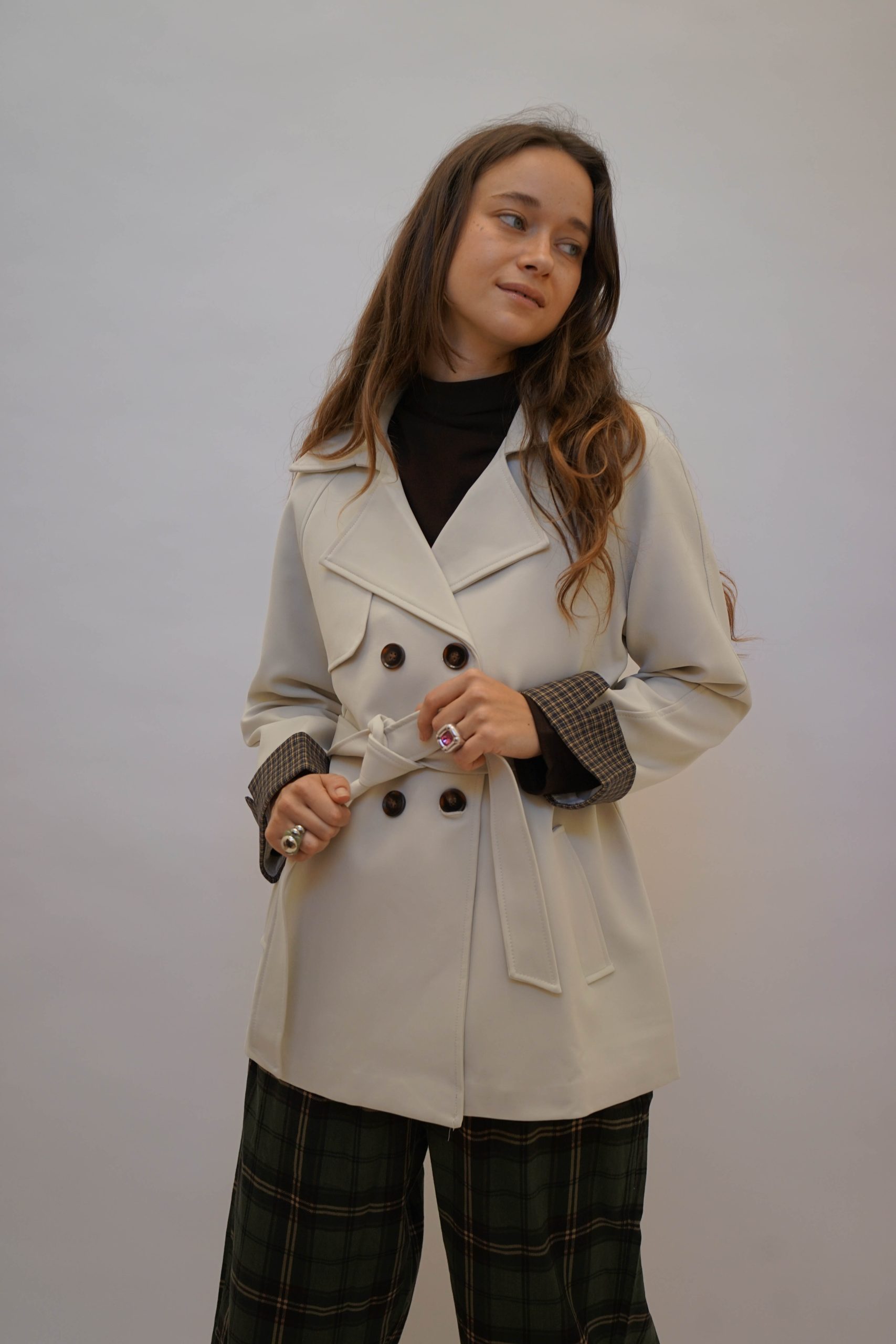 מעיל טראנץ' , כולל חגורה נשלפת במותניים, שני טורי כפתורים, ושרוולים מתקפלים בדוגמה משובצת, גזרה רחוקה מעט מהגוף, ניתן ללכת סגור/פתוח עם חולצת כפתורים ,טישרט קצר/ארוך או סריג דק ,מתאים לכל גווני הצבעים, עם ג'ינס, מכנס מחויט או חצאית למראה קליל או לערב.,