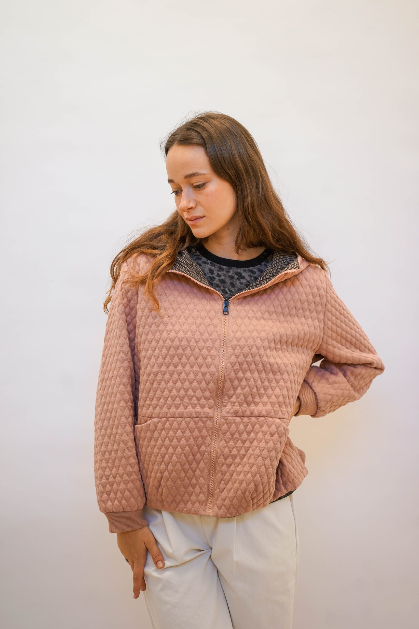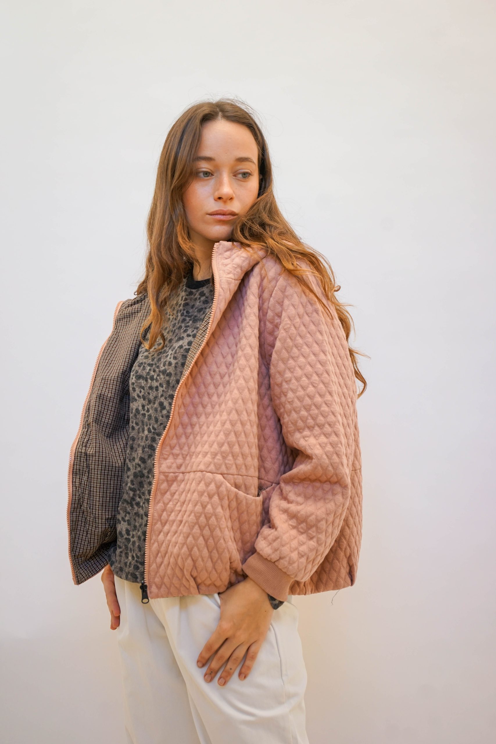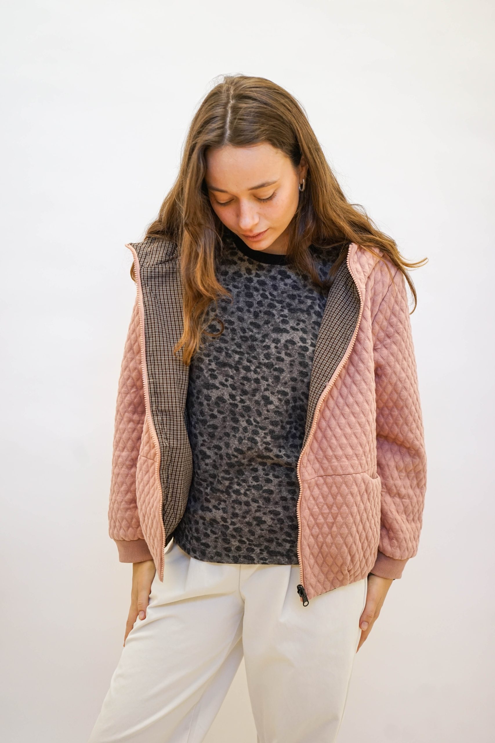מעיל קווילט מבד מפנק שירגיש כאילו לקחת את הפוך איתך לעבודה, בצבע ורוד לזריקת צבע ביום אפרפר וגשום.