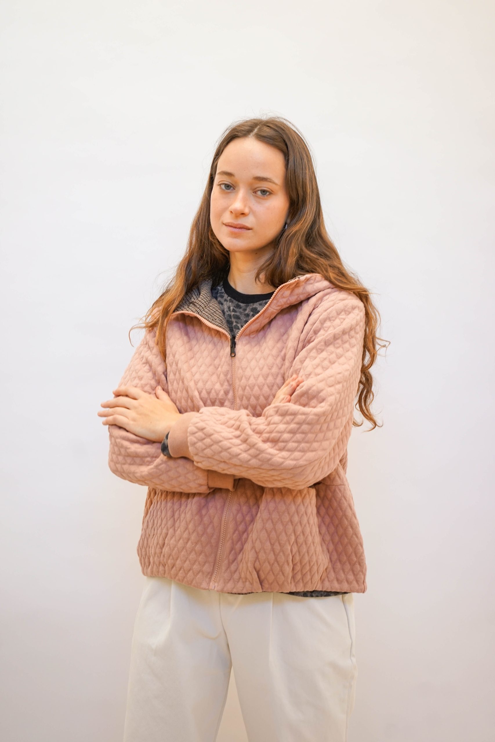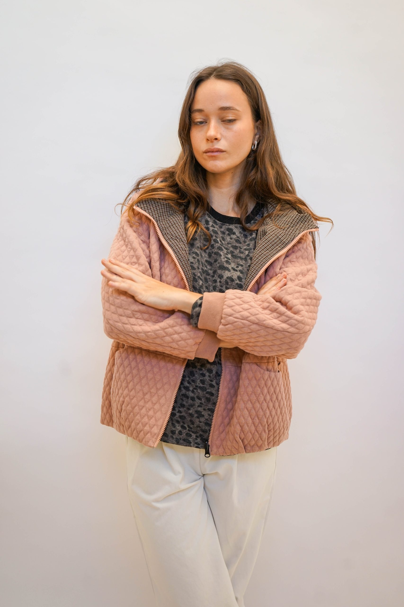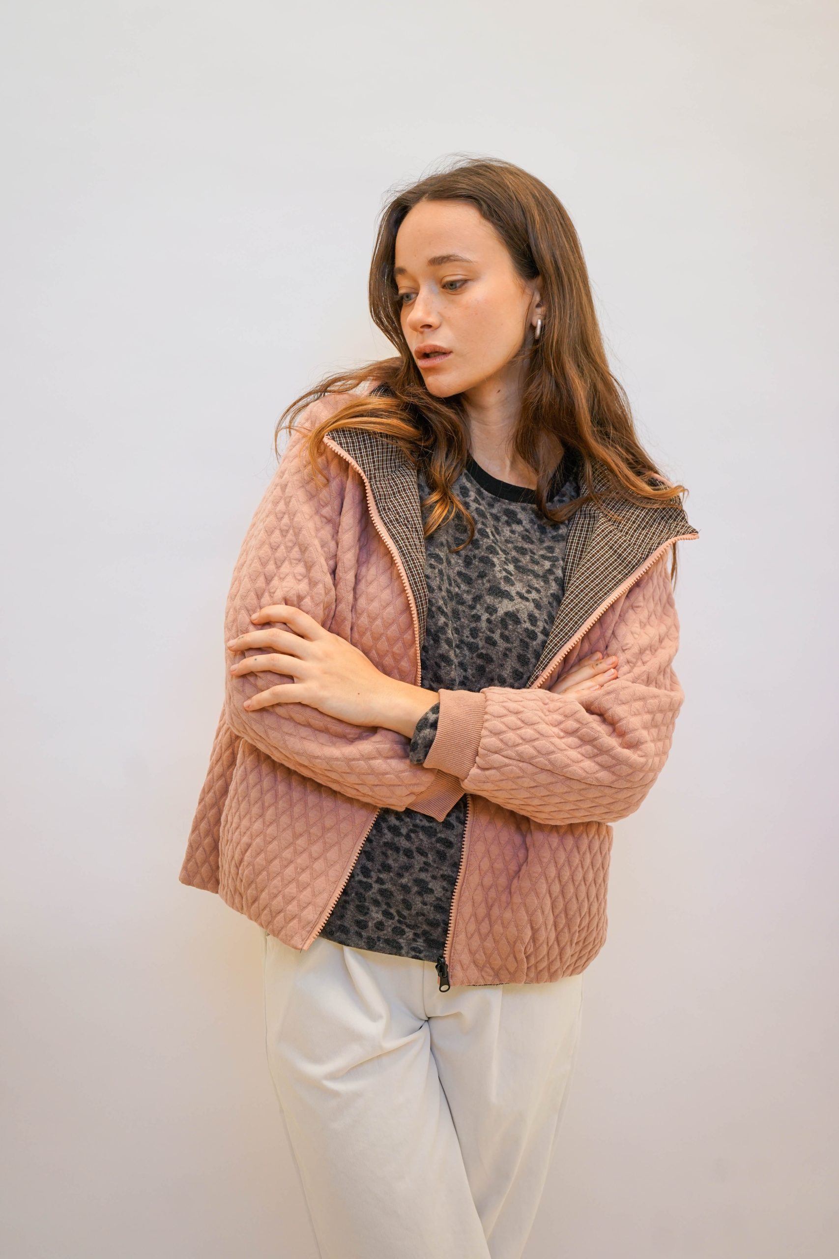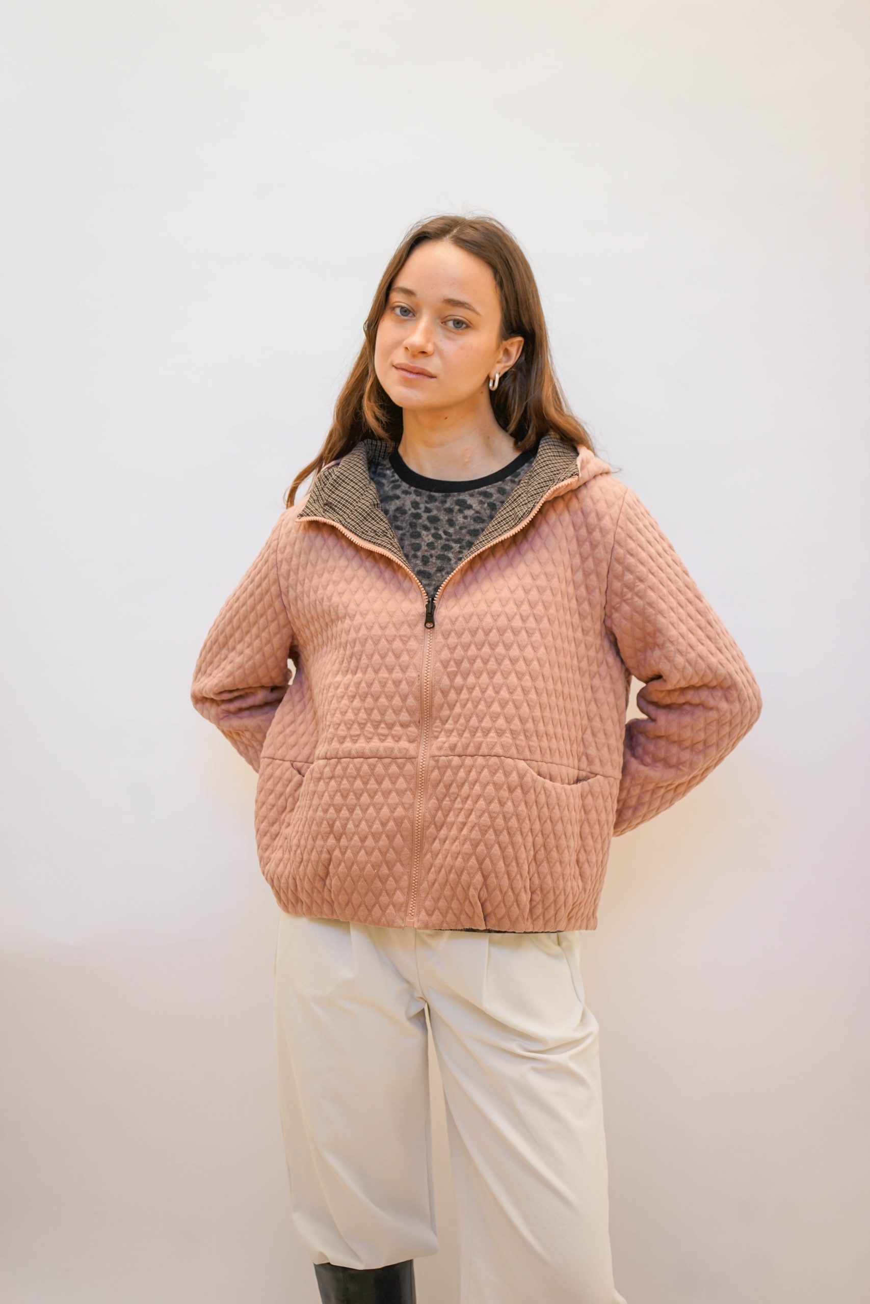 מעיל קווילט מבד מפנק שירגיש כאילו לקחת את הפוך איתך לעבודה, בצבע ורוד לזריקת צבע ביום אפרפר וגשום.
