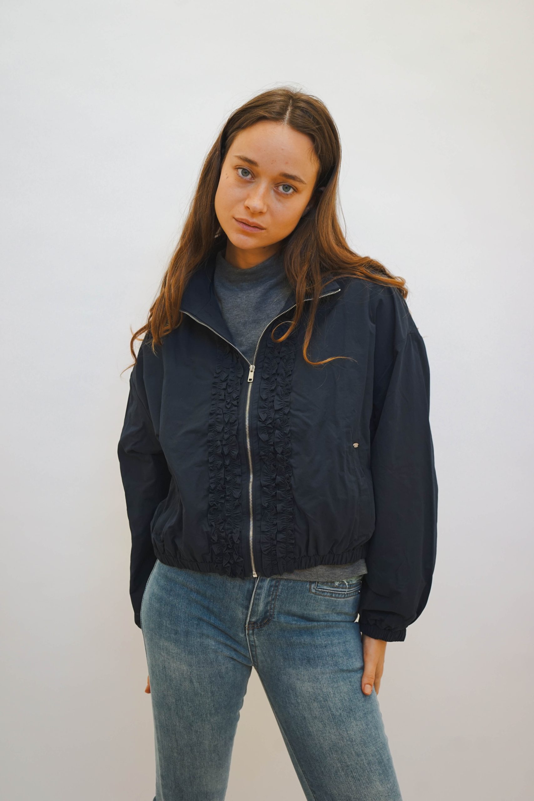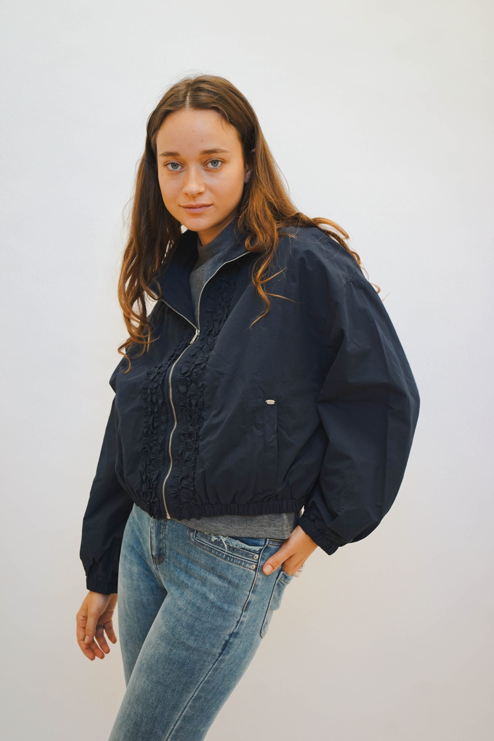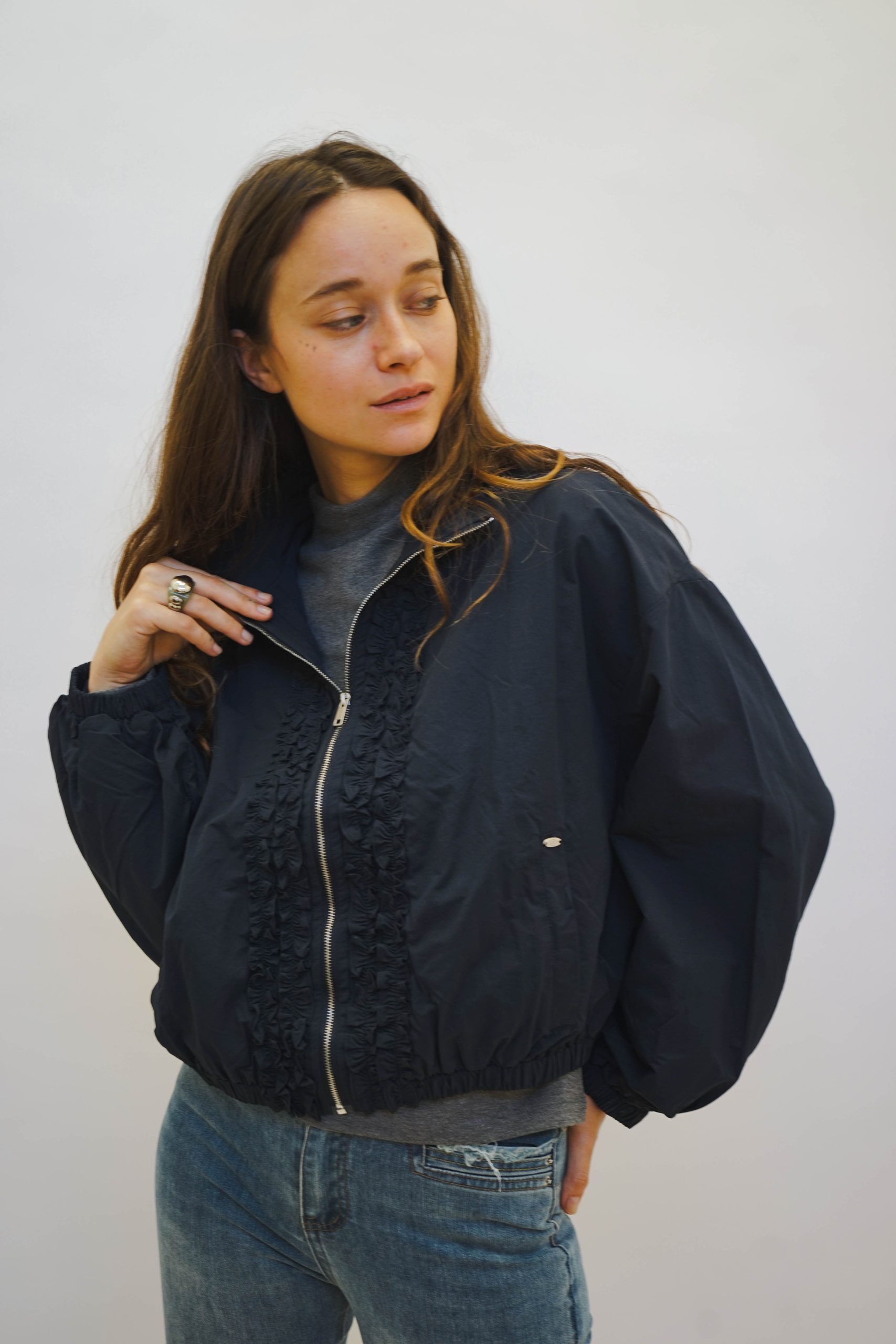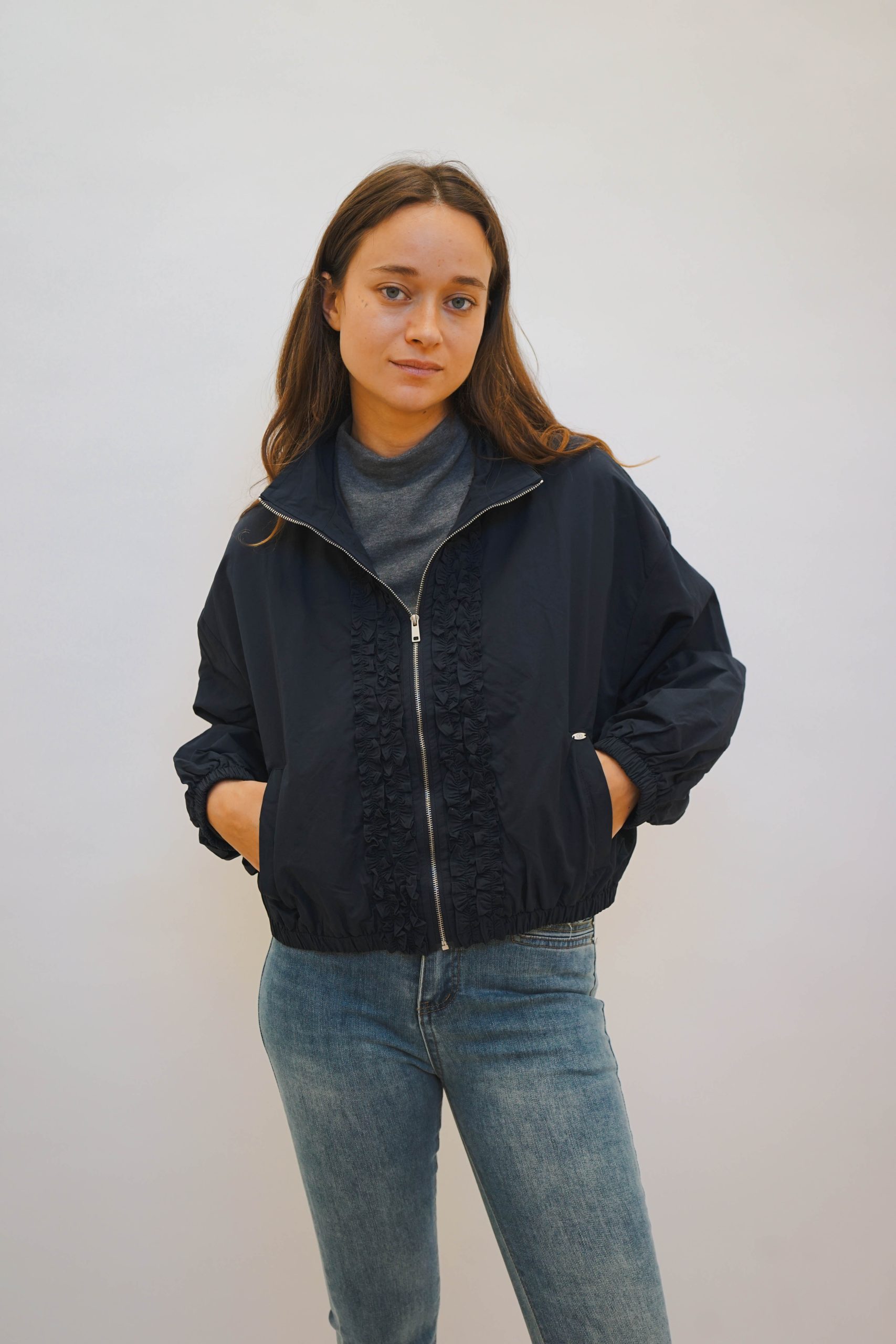 מעיל רוח בצבע אפור כהה עם רוכסן לכל אורכו ורקמת מלמלות בשני הצדדים, גזרה רחבה מהגוף ,ומגיע לקו המכנס. ניתן ללכת סגור/פתוח עם חולצת כפתורים ,טישרט קצר/ארוך או סריג דק ,מתאים לכל גווני הצבעים, עם ג'ינס, מכנס מחויט או חצאית למראה קליל או לערב.