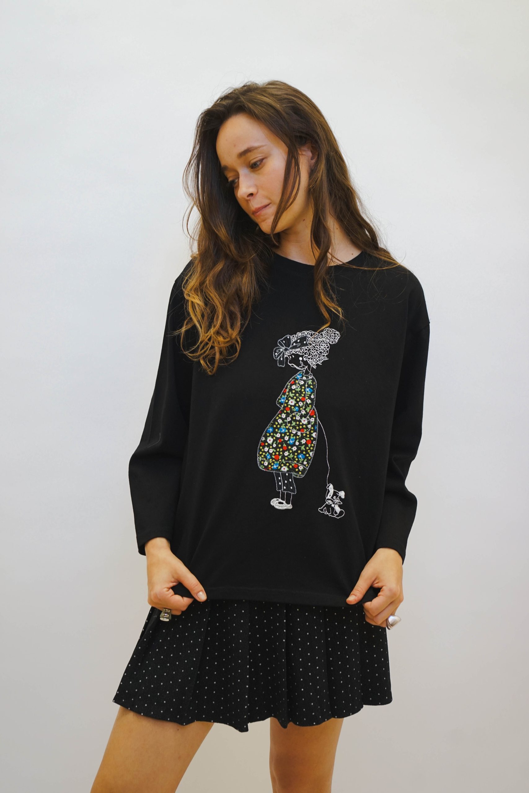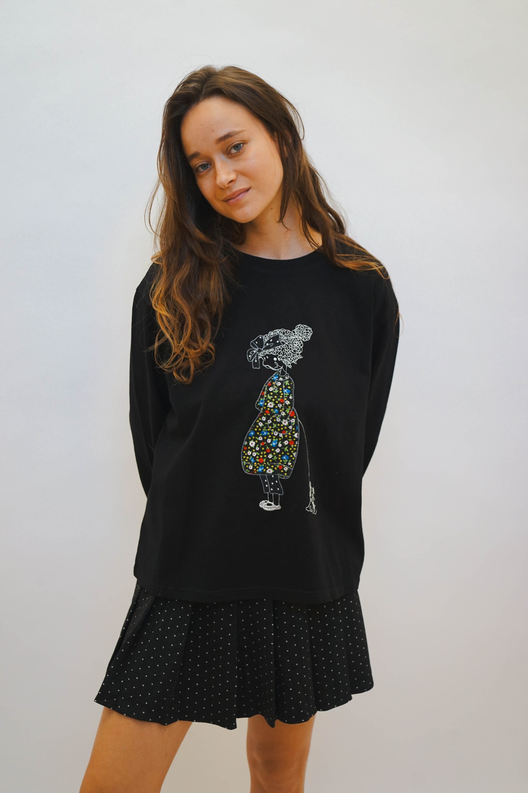 סווטישרט דק 100% כותנה שחור, עם רקמה צבעונית במרכז של ילדה . רחוקה מהגוף ונעימה ניתן ללכת עם ג'ינס בגזרת אוברזייס, עם מכנס מחוייט במגוון צבעים, עם חצאית מיני עם מגפיים עד הברך , שילוב מיוחד ומנצח זה עם החצאית תחרה שבאתר.