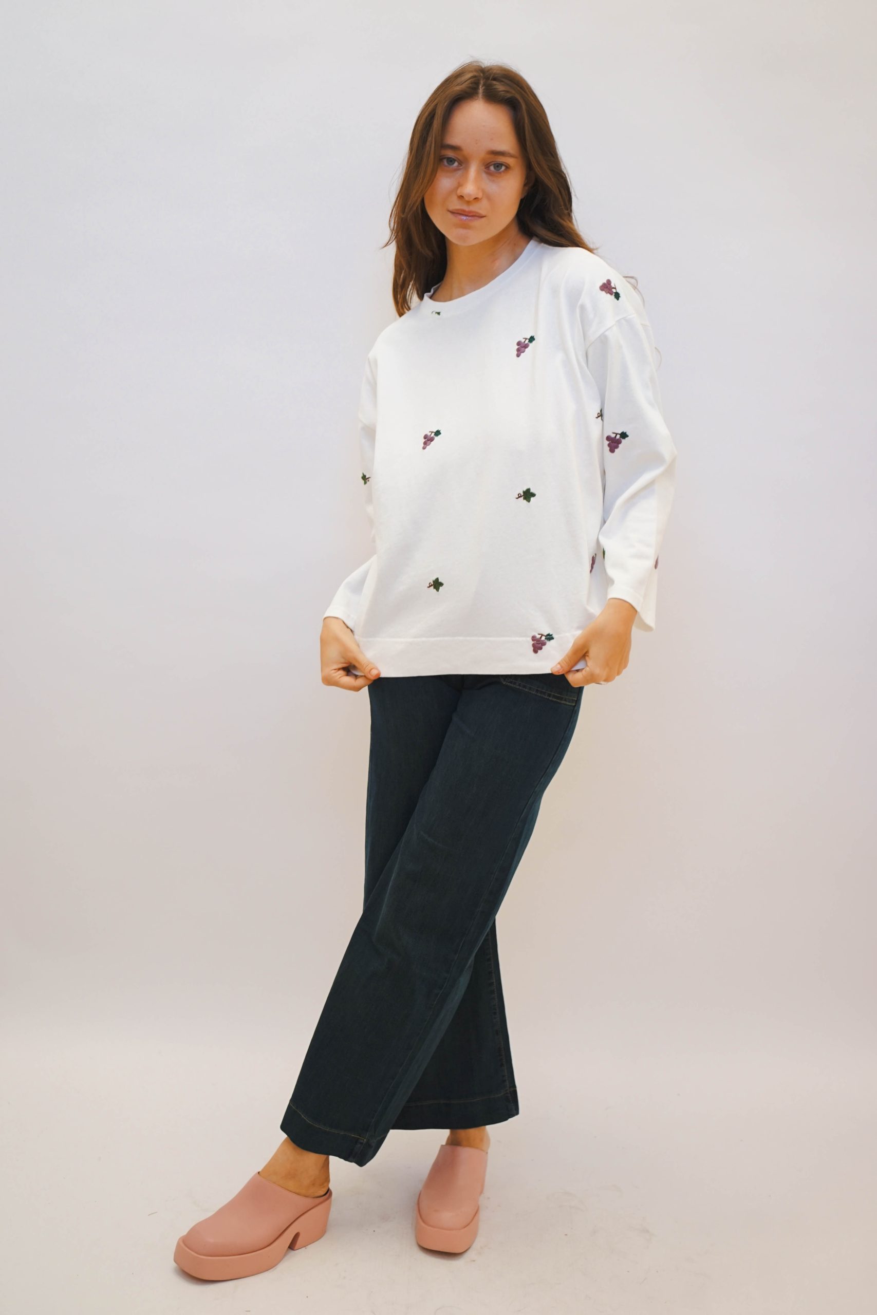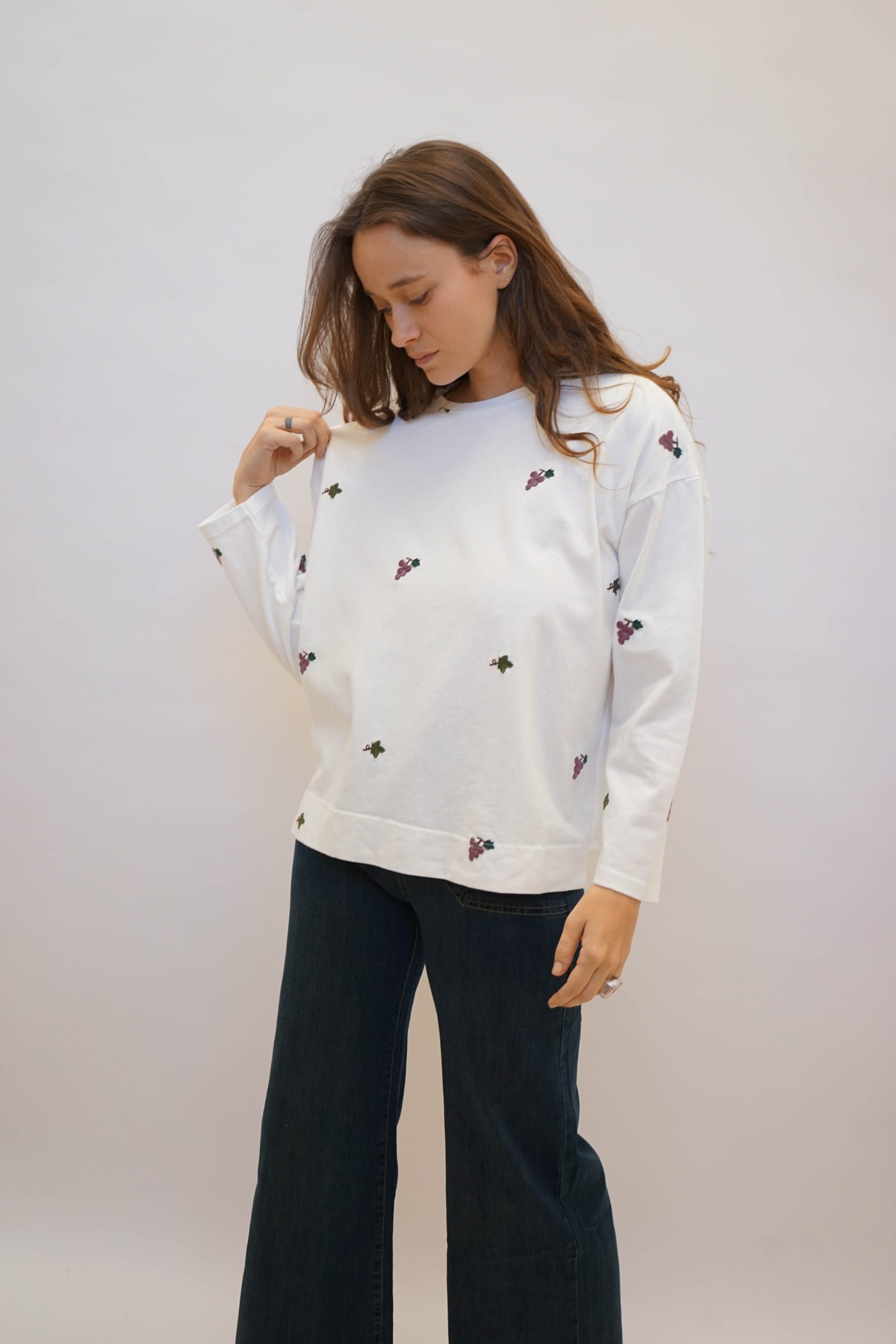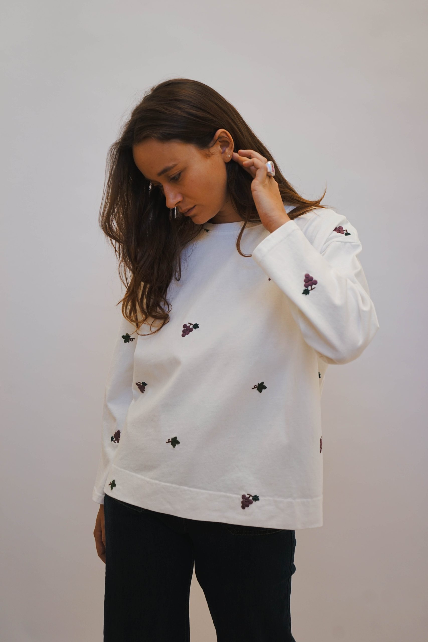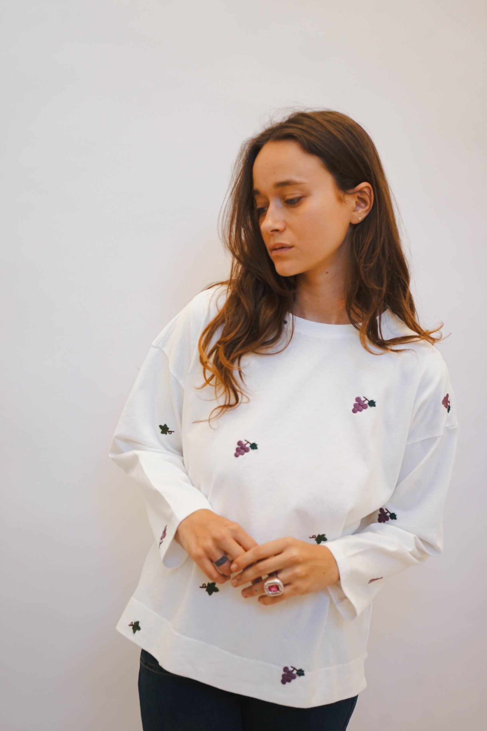 סווטשירט דק שחור 100% כותנה עם רקמת ענבים שמשולבת על כל החולצה בגוונים של סגלגל וירוק בגיזרה רחוקה מהגוף.למראה קליל עם ג'ינס,מכנסים מחוייטים, ניתן ללבוש מעל חולצה מכופתרת ארוכה או קצרה, מתחת לאפודה או ווסט עם חצאית למראה יותר קלאסי. אורך 60 היקף 114