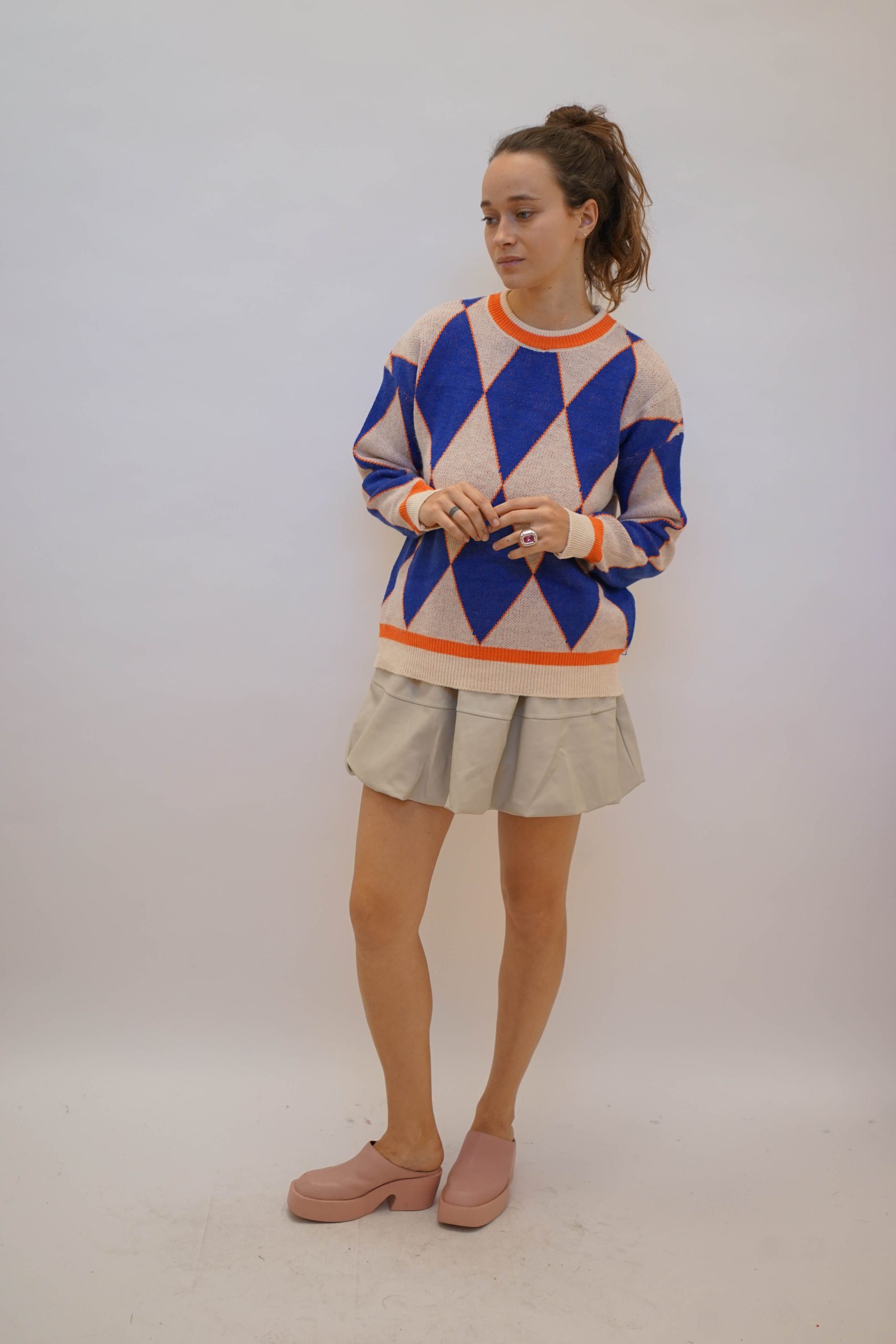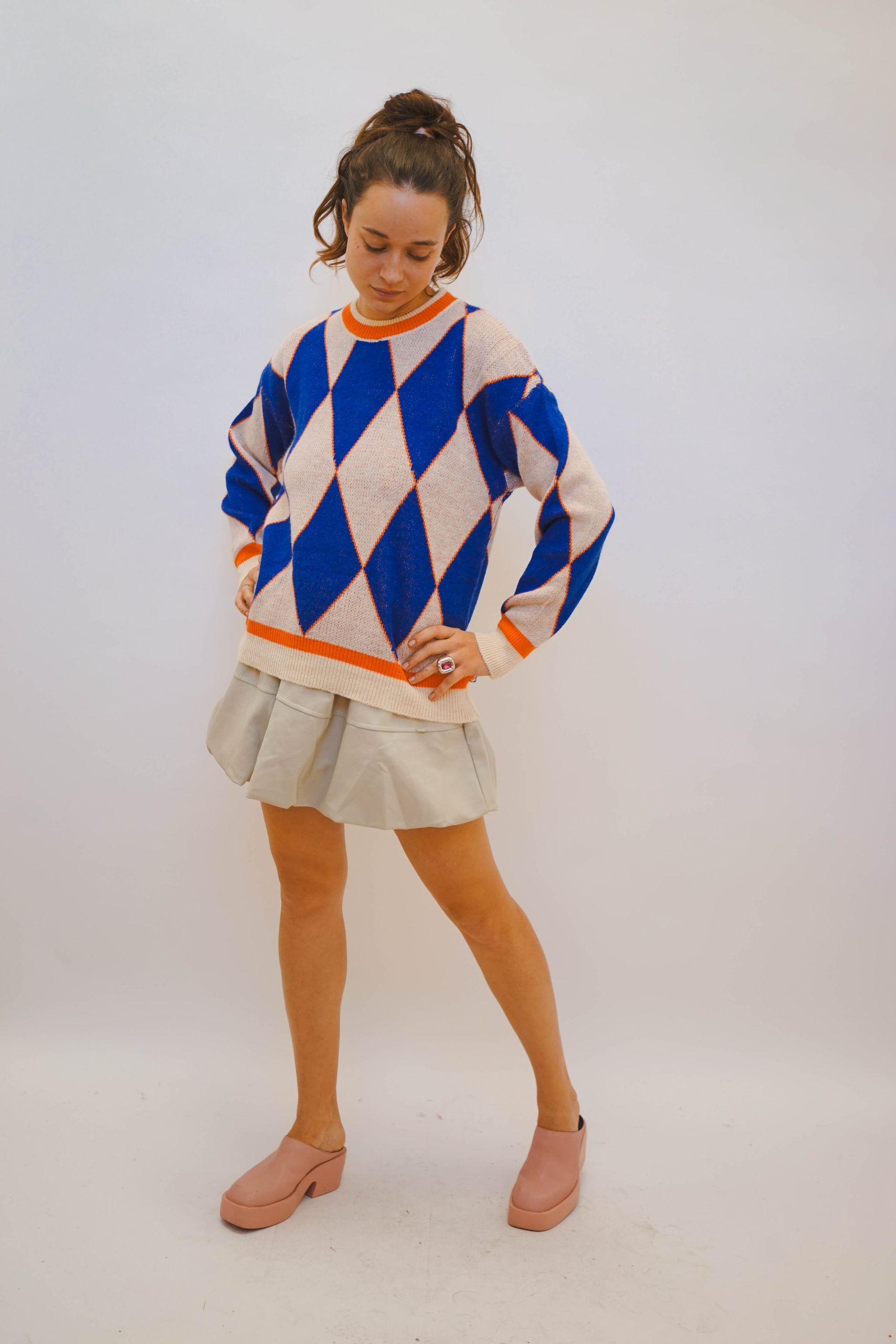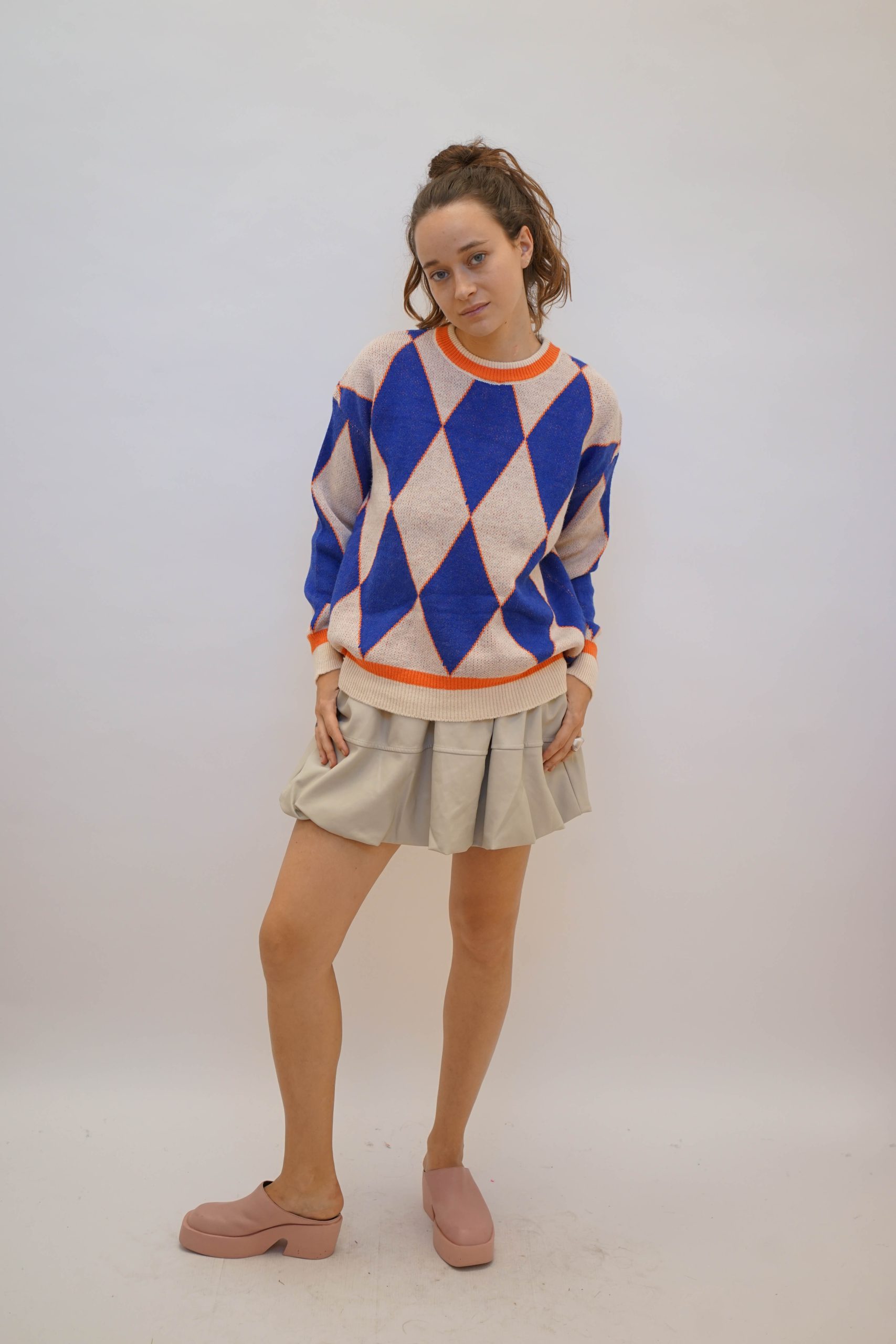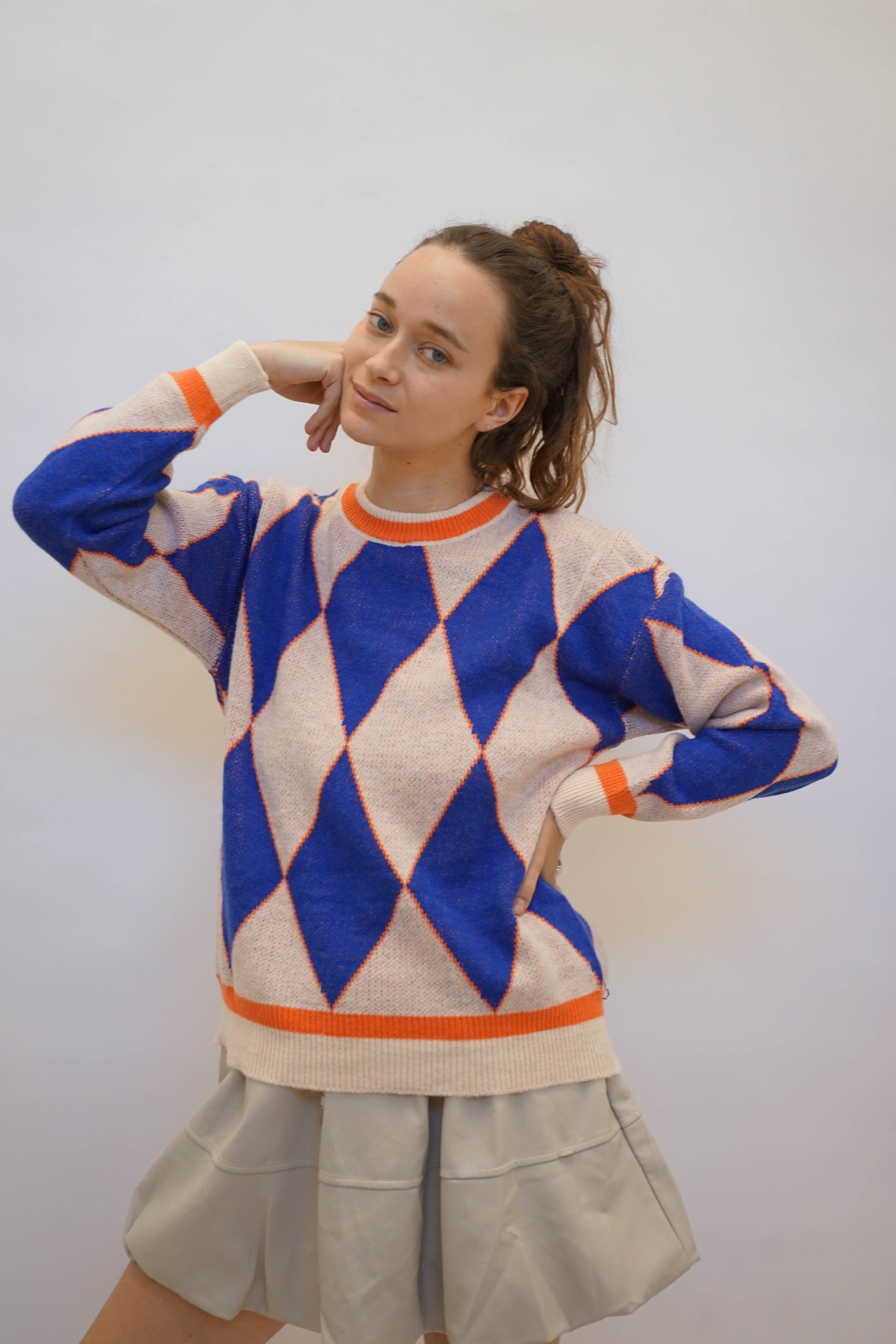 סריג מעויניים על רקע בז' וכחול בגזרת אוברסייז . יכולה להתאים לערב או למשרד עם ג'ינס או מכנסי שמנת,לבן,שחור ניתן לשלב עם חצאית בכל האורכים למראה קלאסי.