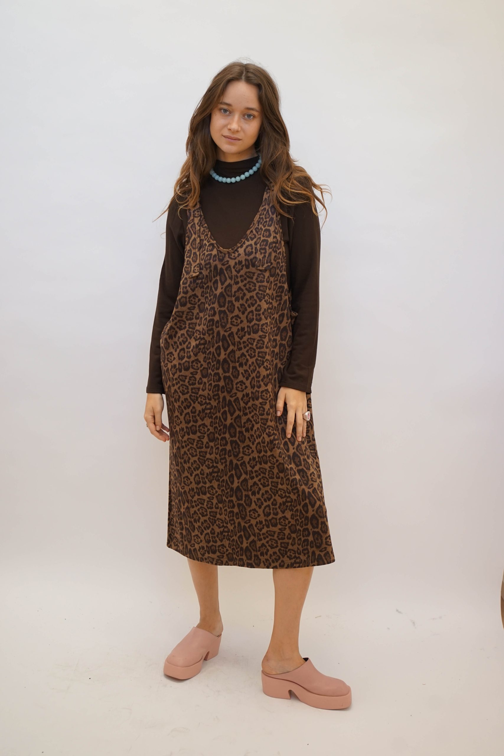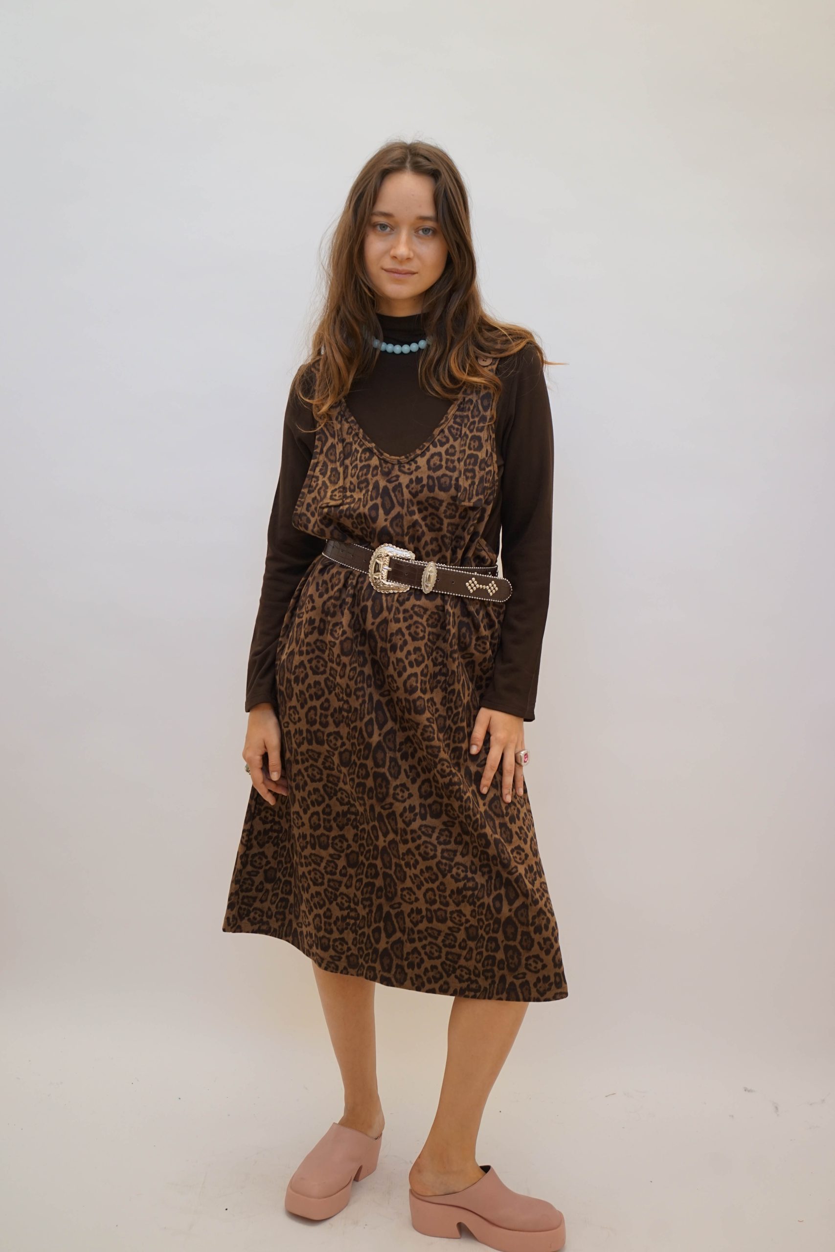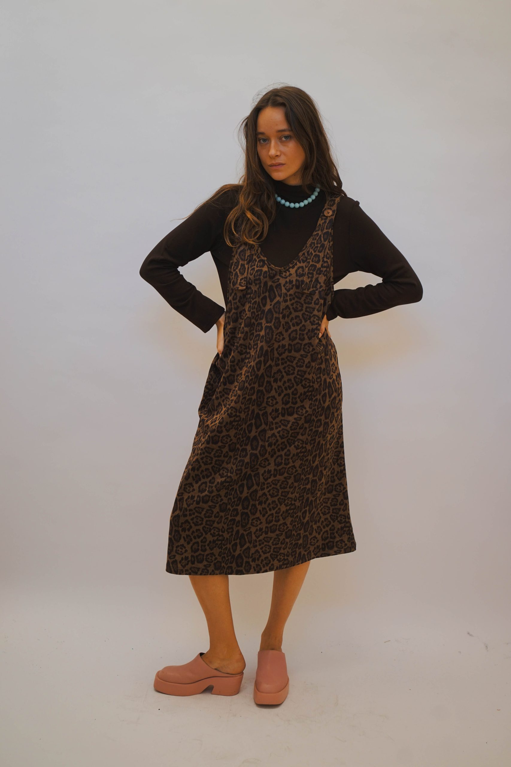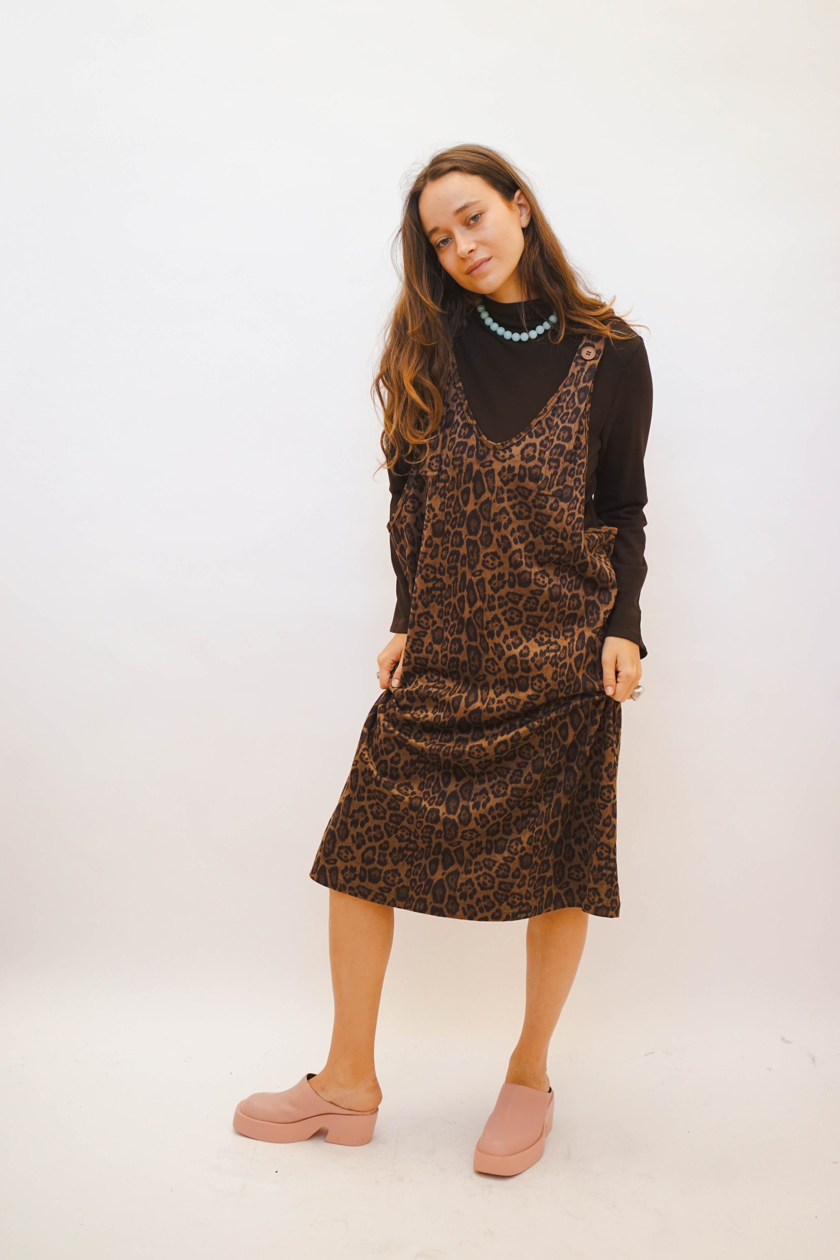 סרפן מנומר מבד זמשי בגזרה רחבה רחוקה מהגוף,ניתן להצמיד גם עם חגורת קאובוי חומה או כל חגורה שחורה אחרת צווארון עגול.כתפיות עם כפתורים ניתן ללבוש מתחת טישרט ארוכה או קצרה בצבע לבן/שחור, חולצת גולף למראה קליל יום יומי או