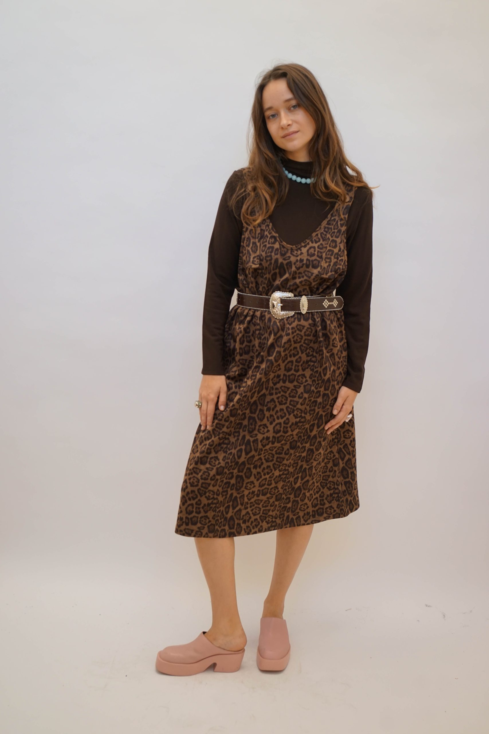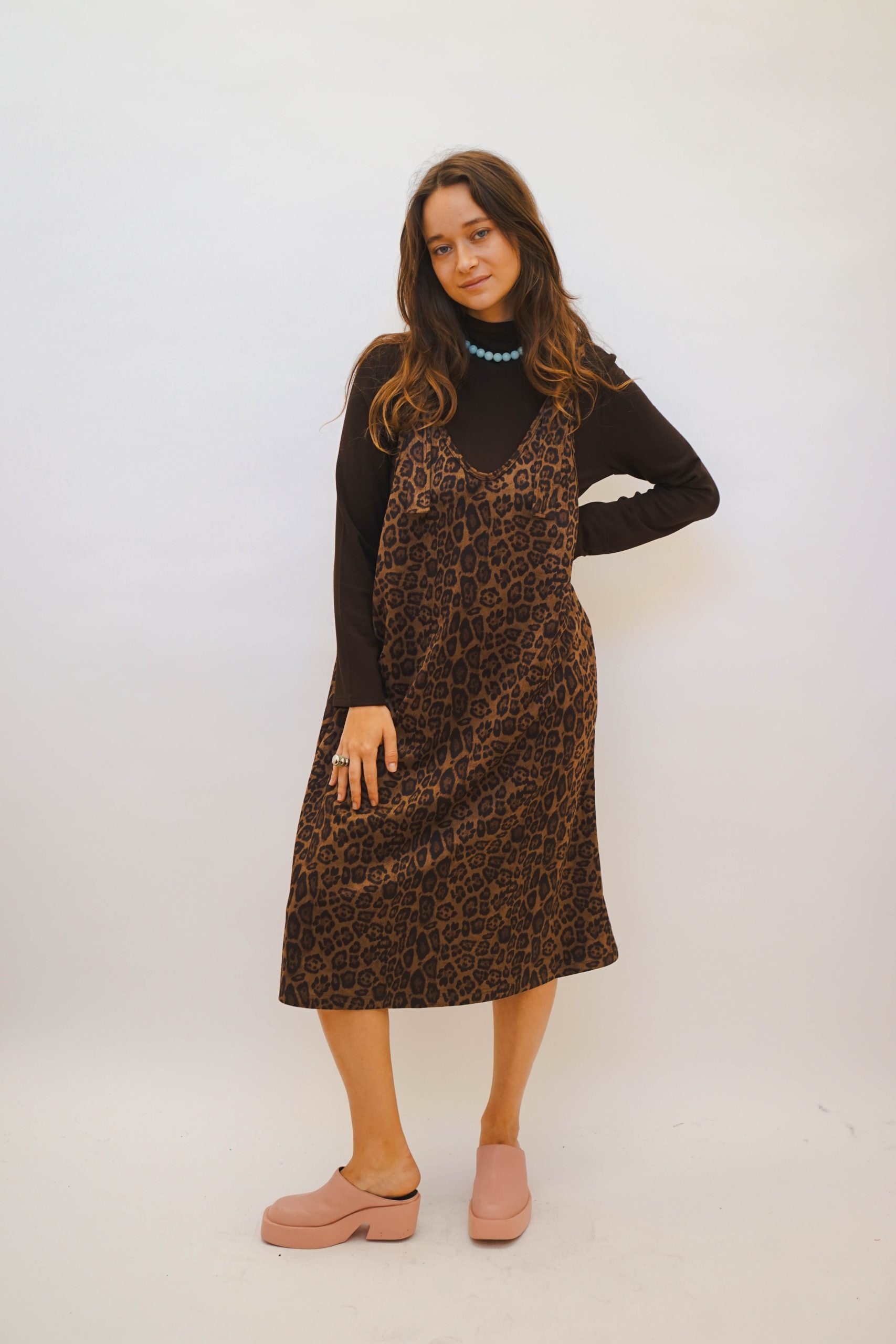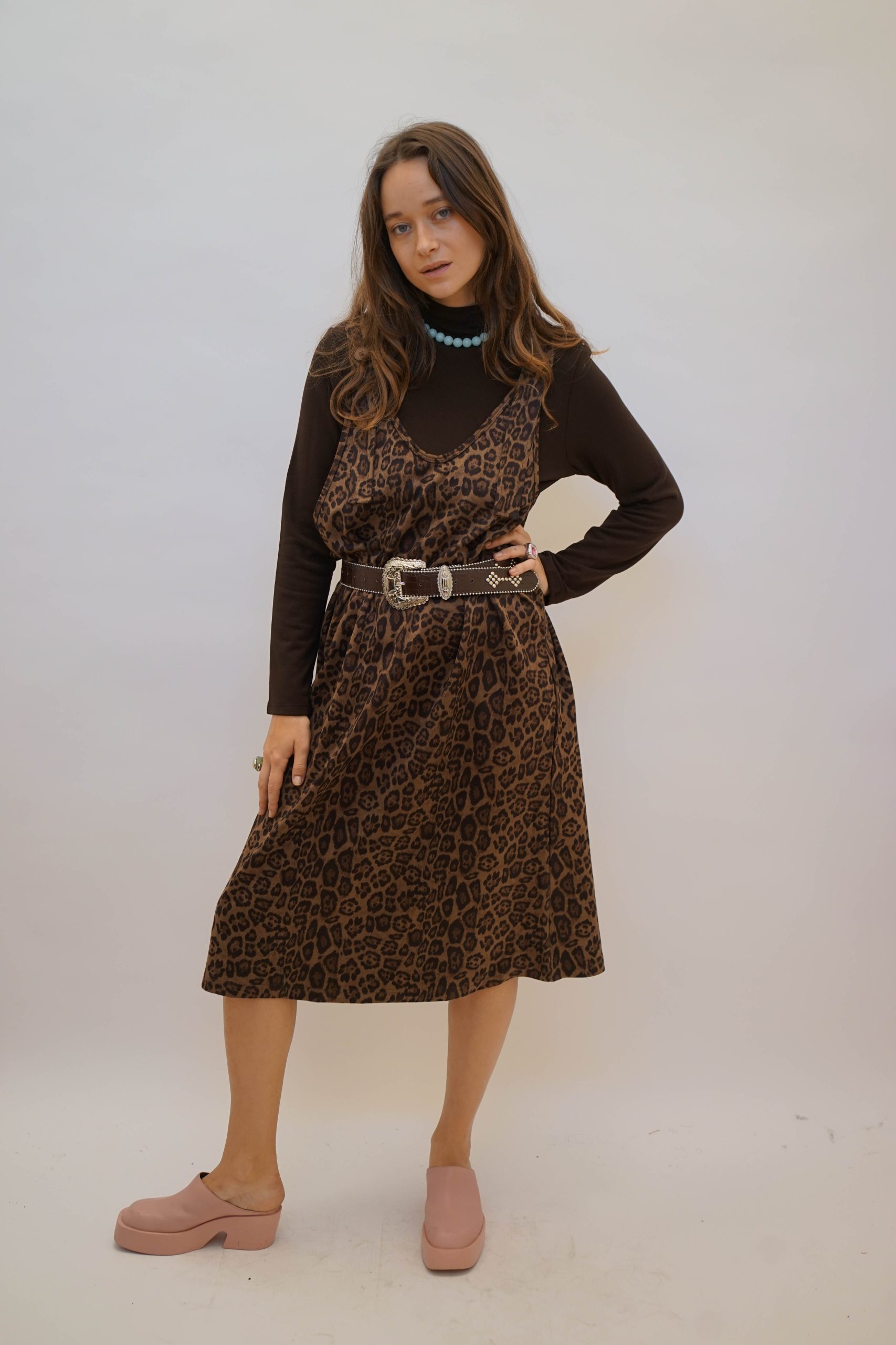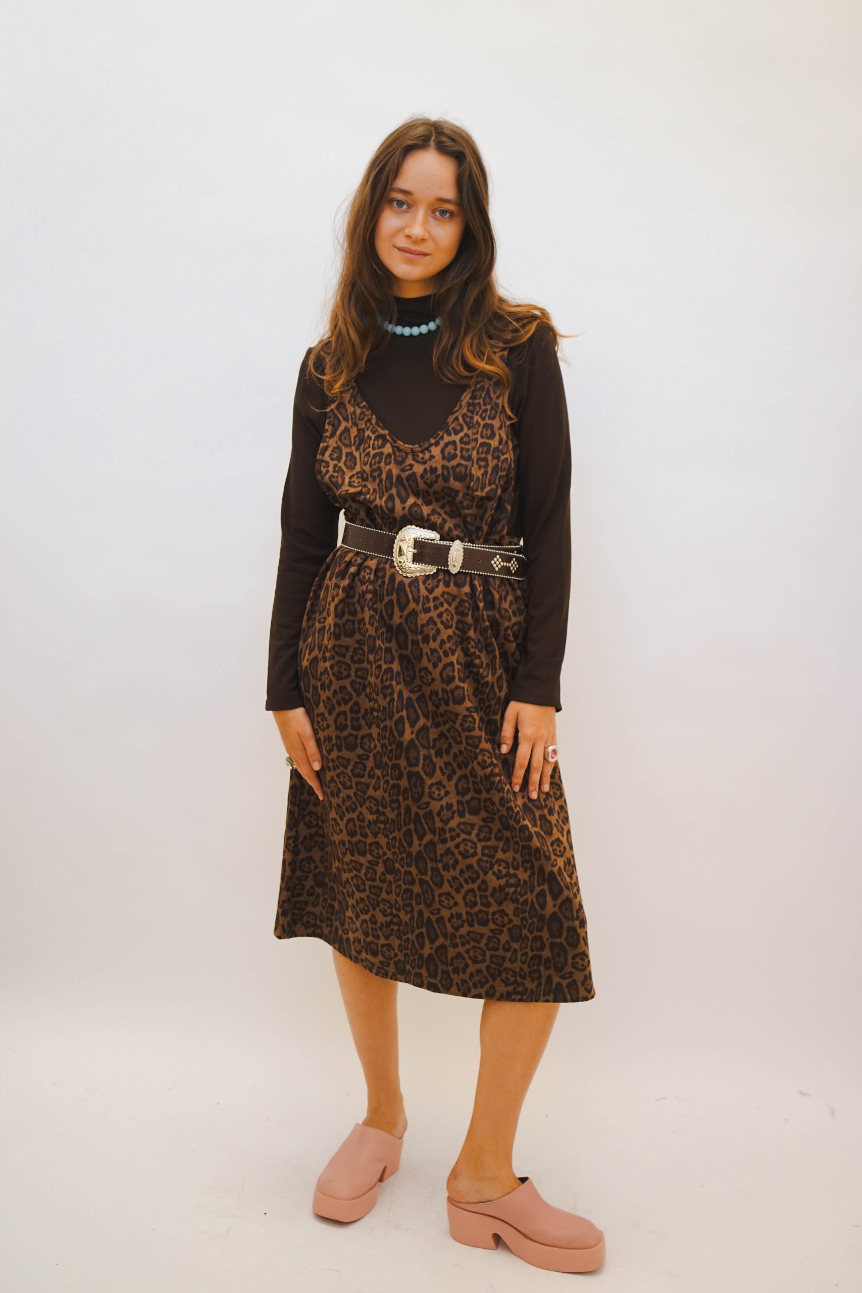סרפן מנומר מבד זמשי בגזרה רחבה רחוקה מהגוף,ניתן להצמיד גם עם חגורת קאובוי חומה או כל חגורה שחורה אחרת צווארון עגול.כתפיות עם כפתורים ניתן ללבוש מתחת טישרט ארוכה או קצרה בצבע לבן/שחור, חולצת גולף למראה קליל יום יומי או