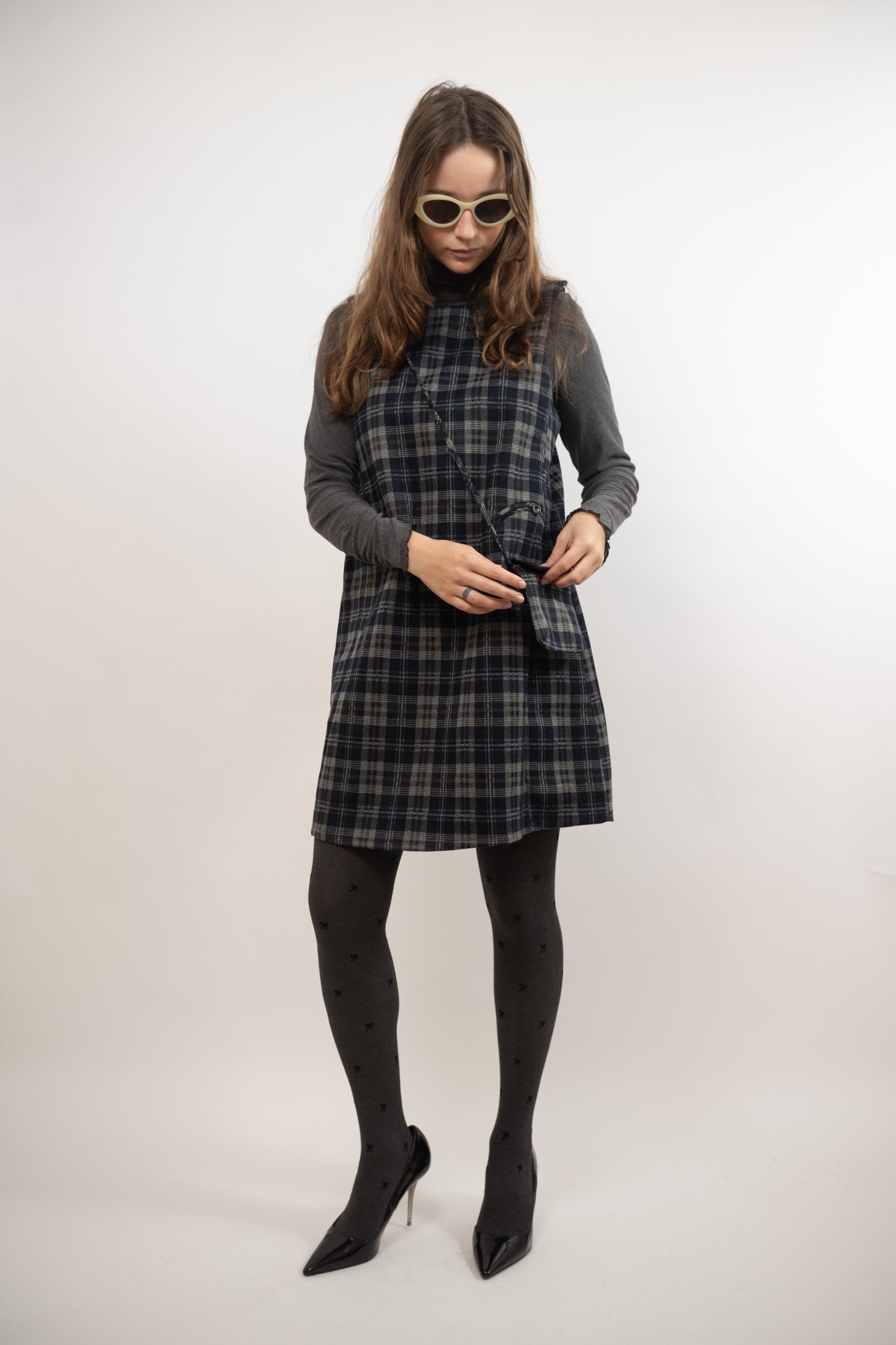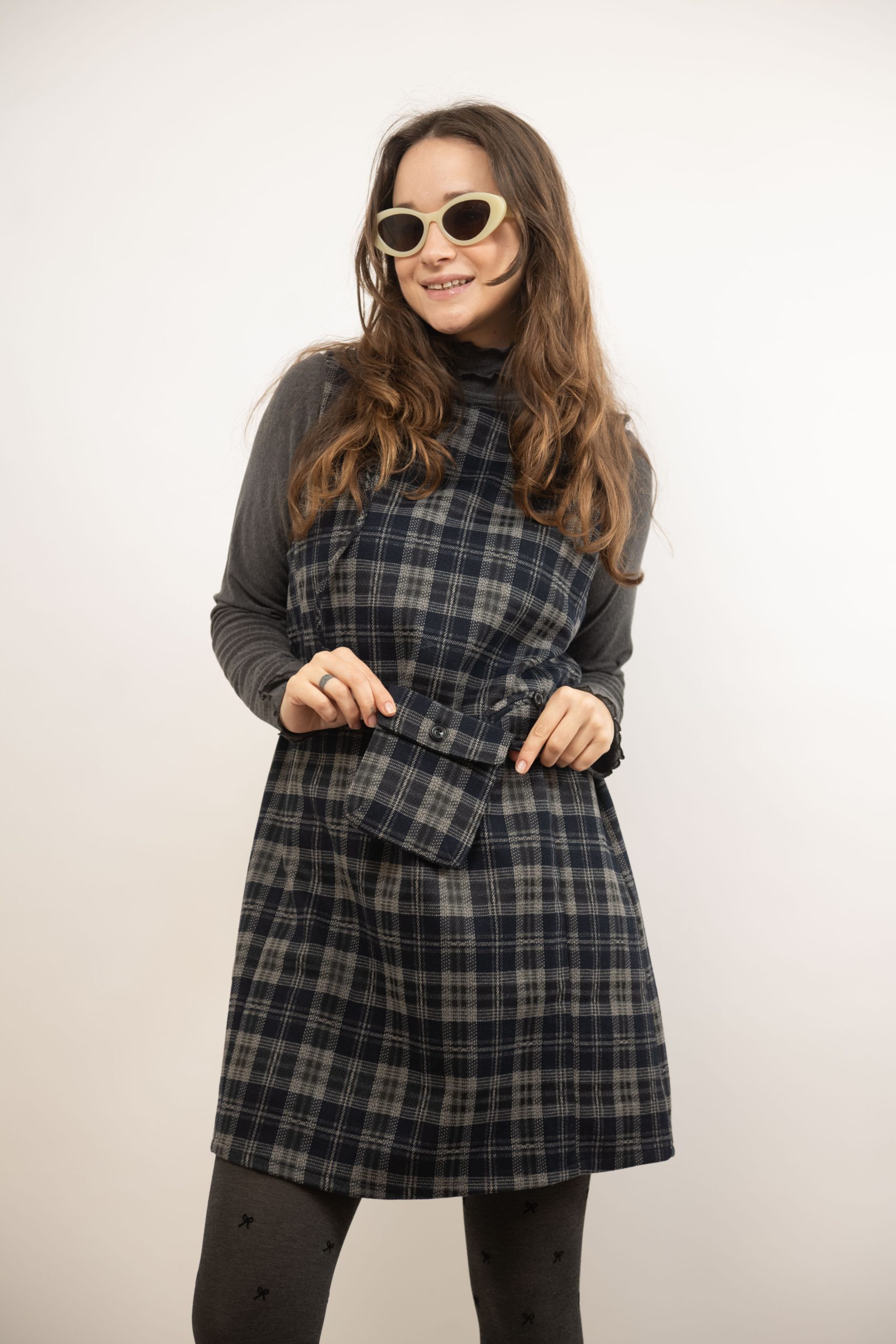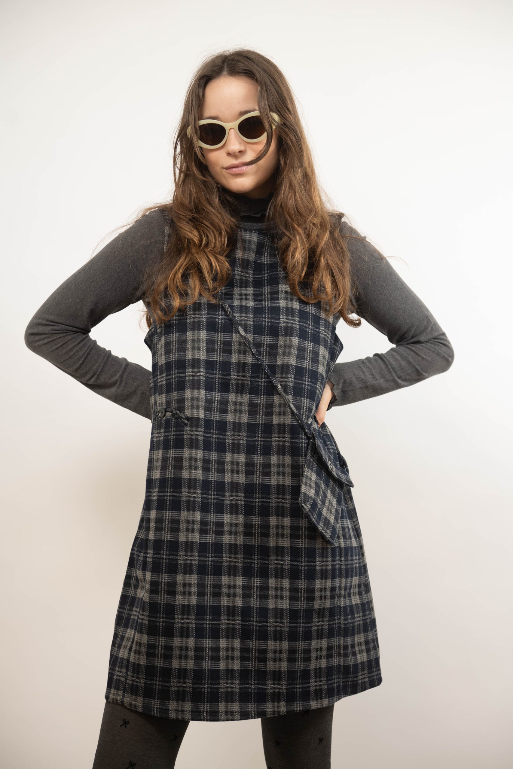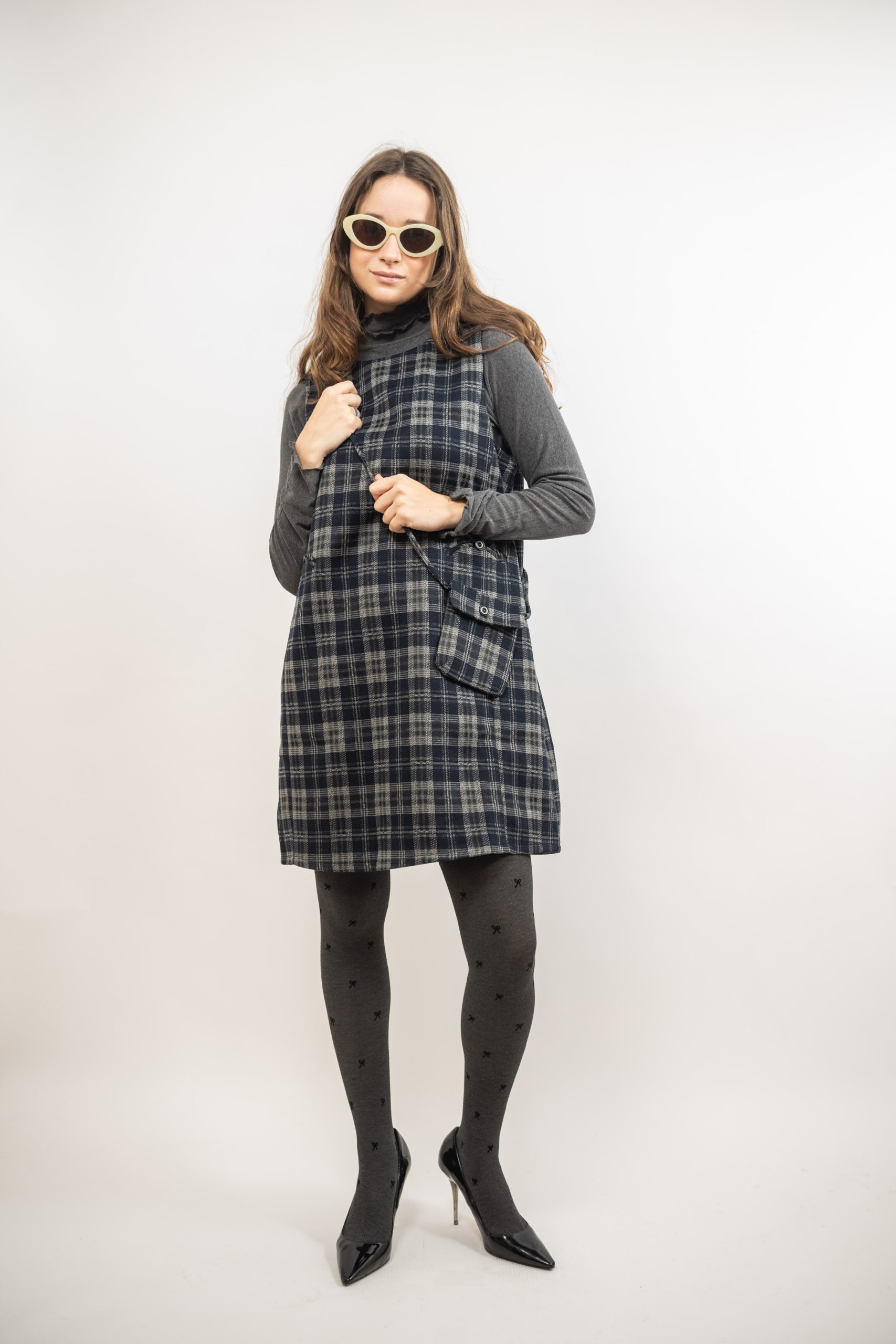 סרפן משובץ אפור כחול ללא שרוולים עם מפתח עגול רחוקה מהגוף באורך מיני. מתאים לשים מתחת חולצת כפתורים, טישרט קצר/ארוך במגוון צבעים, ניתן לשלב עם גרביון אטום או מעויינים בבד