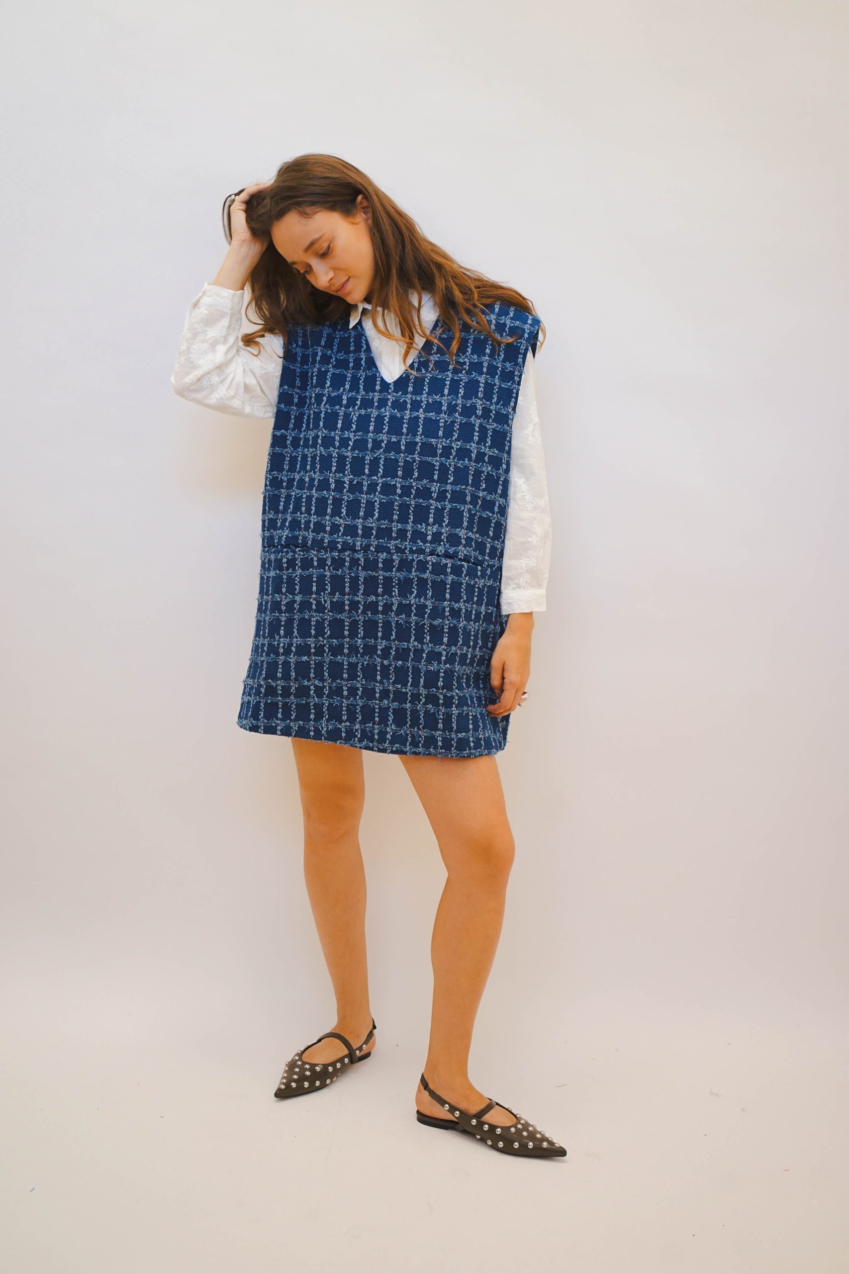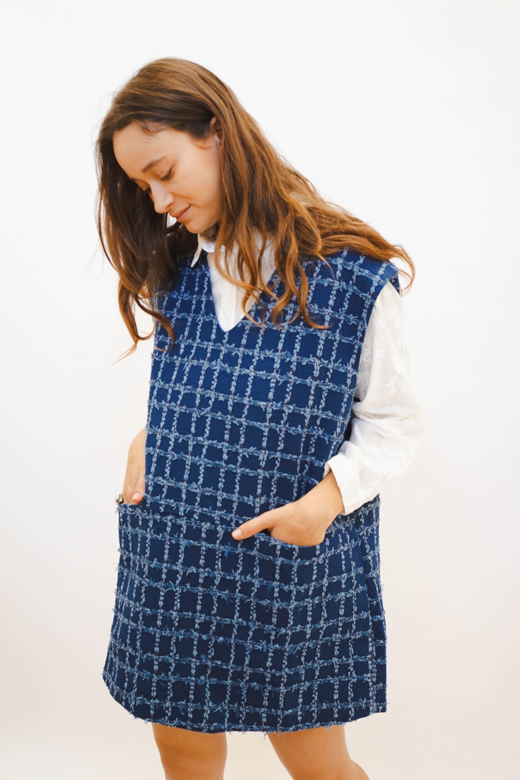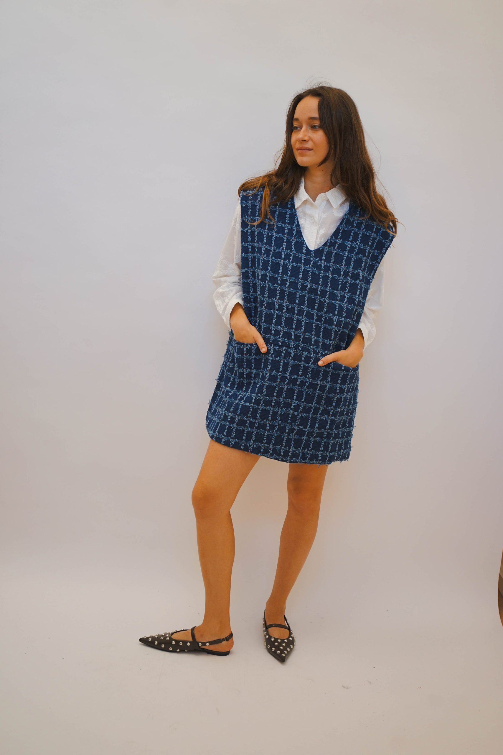 סרפן בד חורפי בדוגמת ריבועים פרנזיןם ללא שרוולים עם וי עמוק רחוקה מהגוף באורך מיני. מתאים לשים מתחת חולצת כפתורים, טישרט קצר/ארוך במגוון צבעים, ניתן לשלב עם גרביון אטום בצבעי הסתיו ולשלב מטפחת לצוואר למראה יותר קלאסי אורך 82 היקף 124