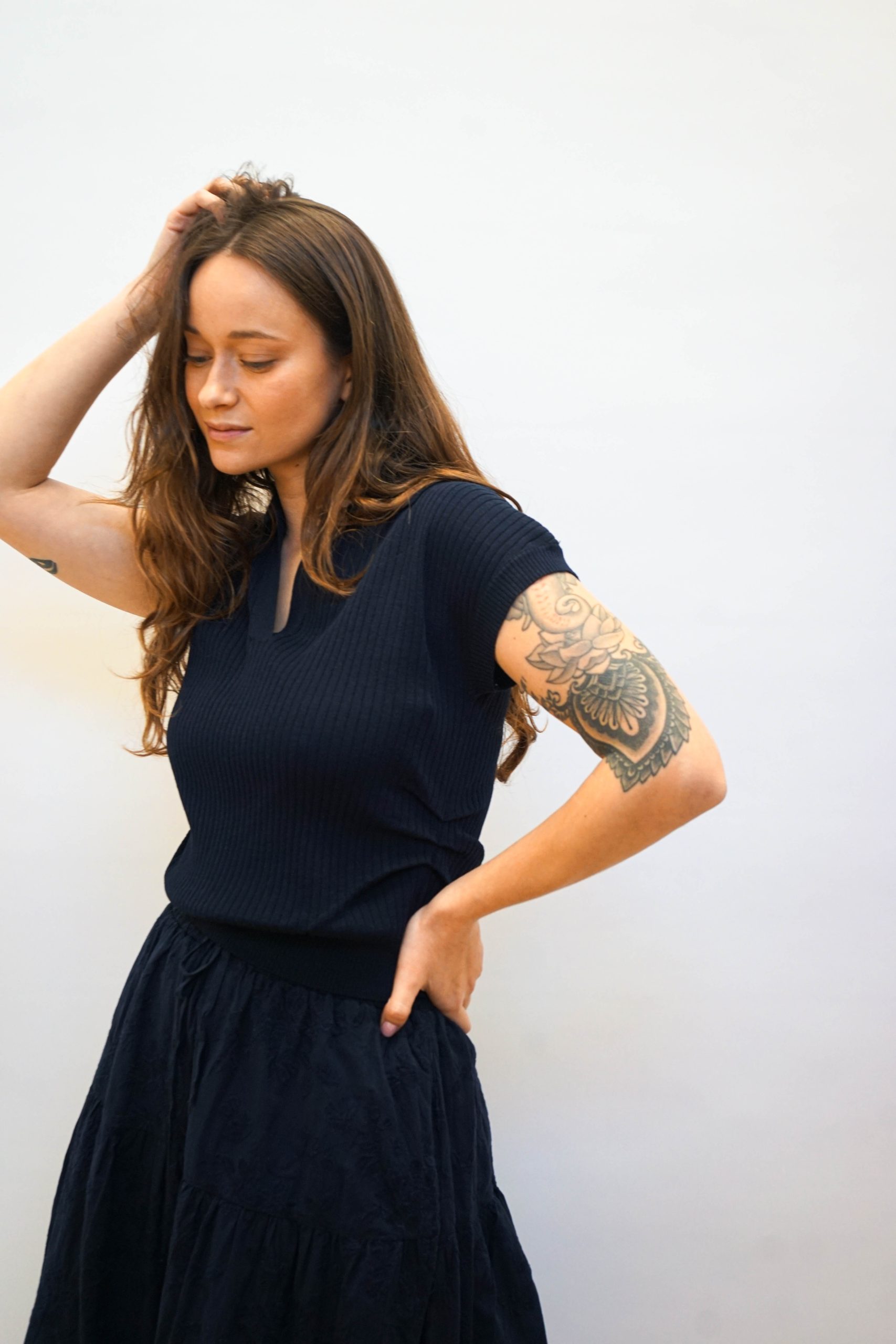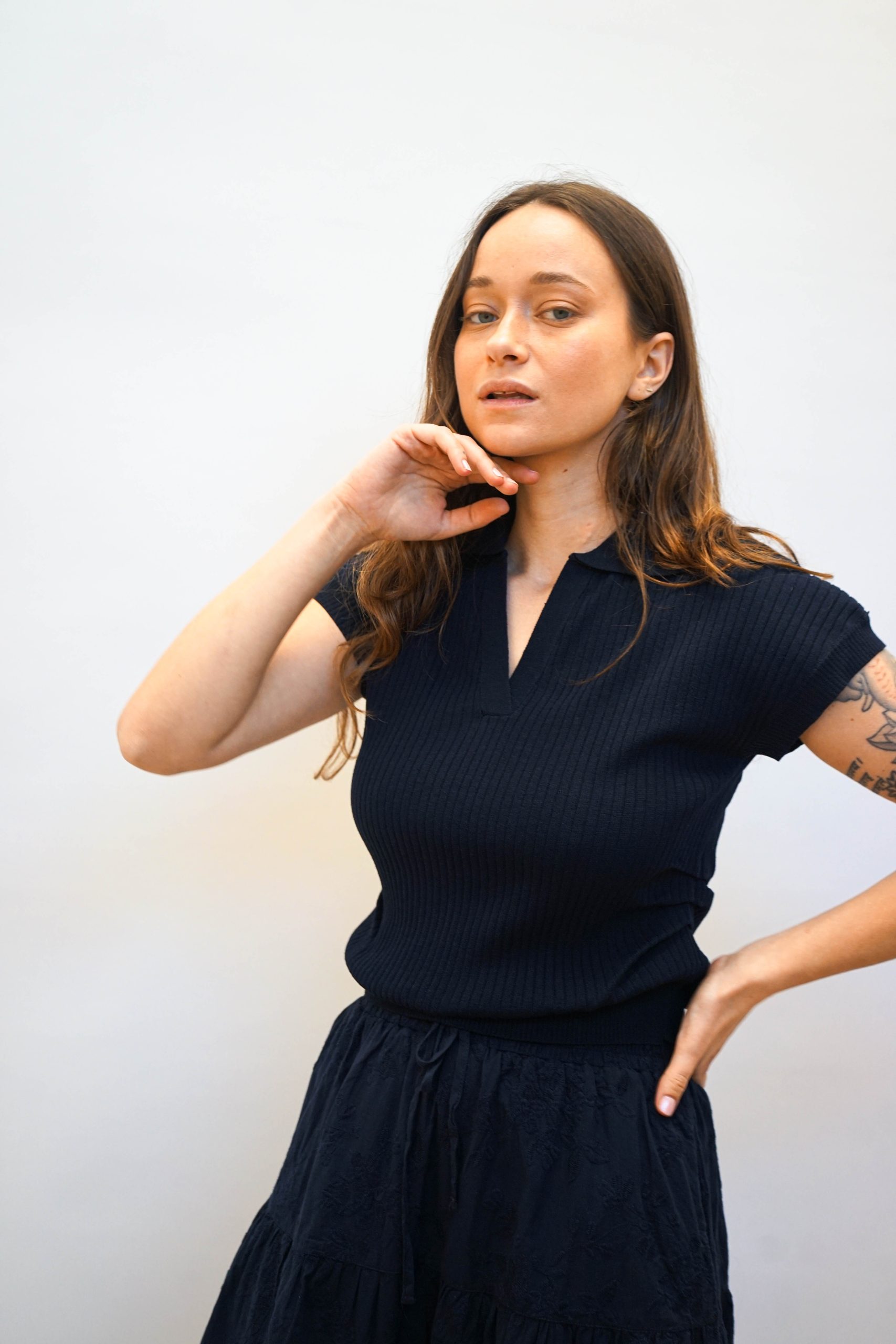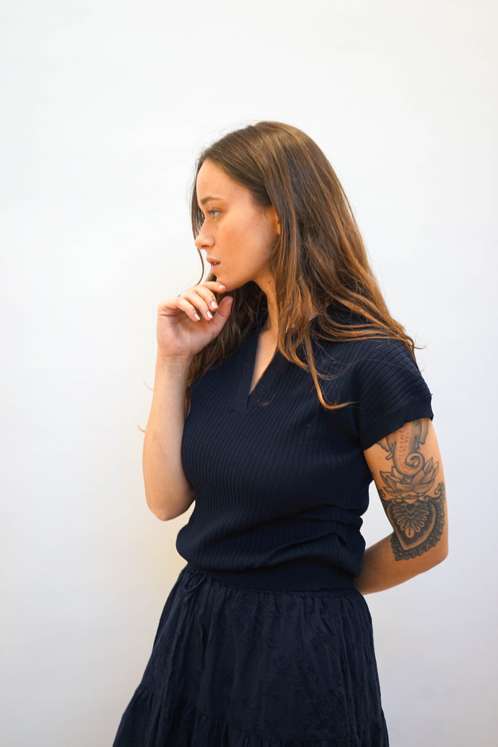 חולצת פולו סרוגה עם טקסטורת פסים לאורך בגזרה קרובה לגוף עם צווארון פולו ומחשוף V פתוח. עם כיווצים מחמיאים במותן וללא שרוולים. ניתן לשלב עם חצאית לוסי או חצאית פרחים בבד. היקף מטר אורך 54