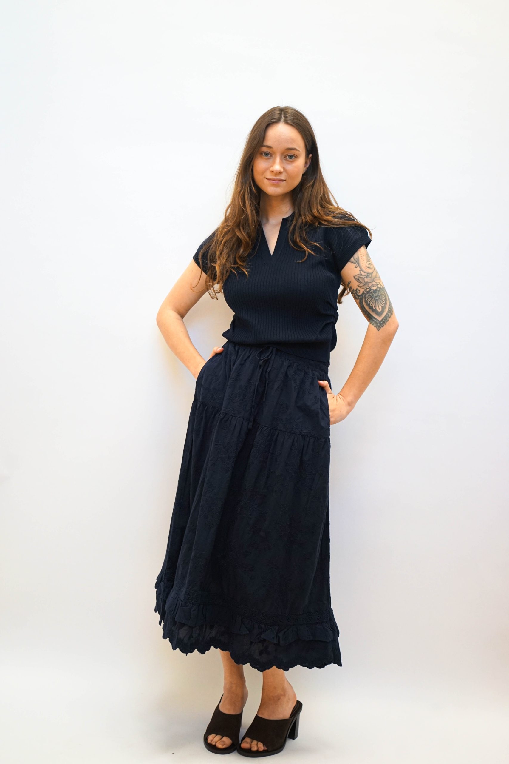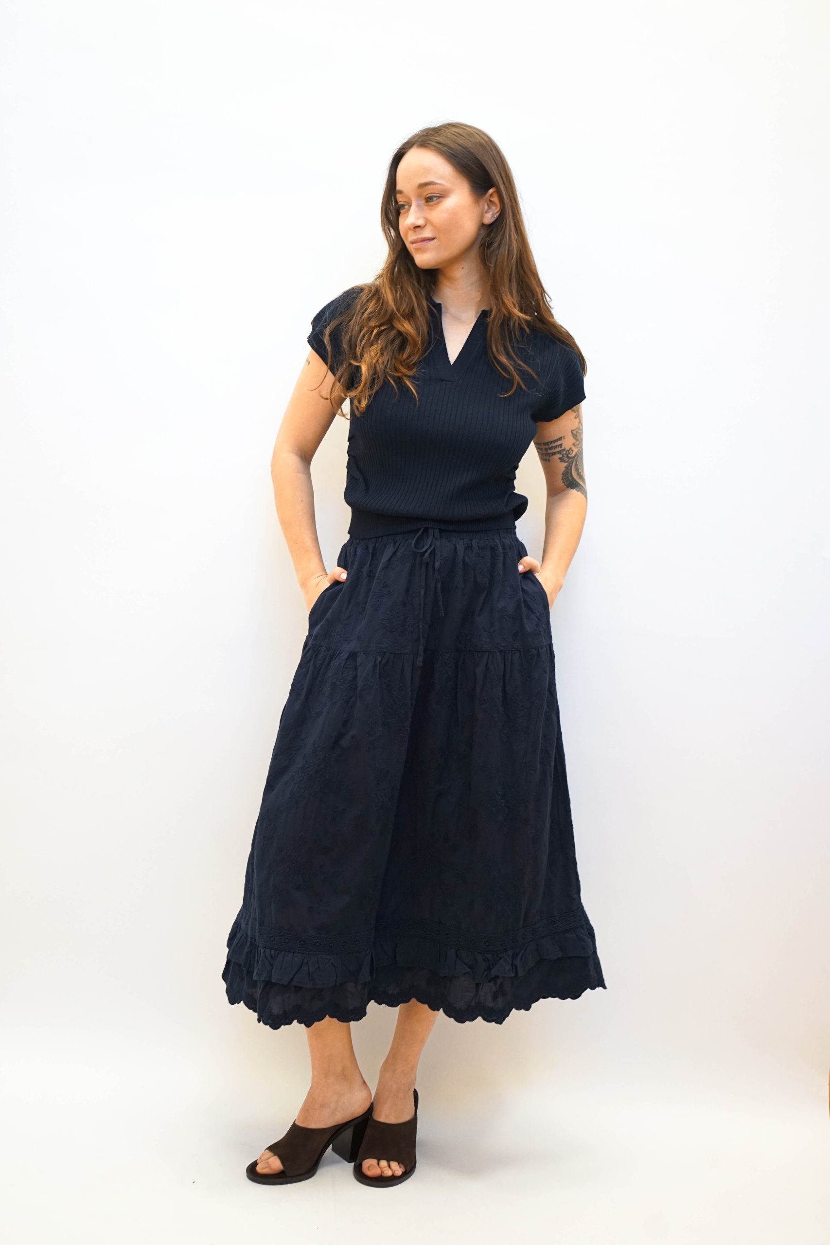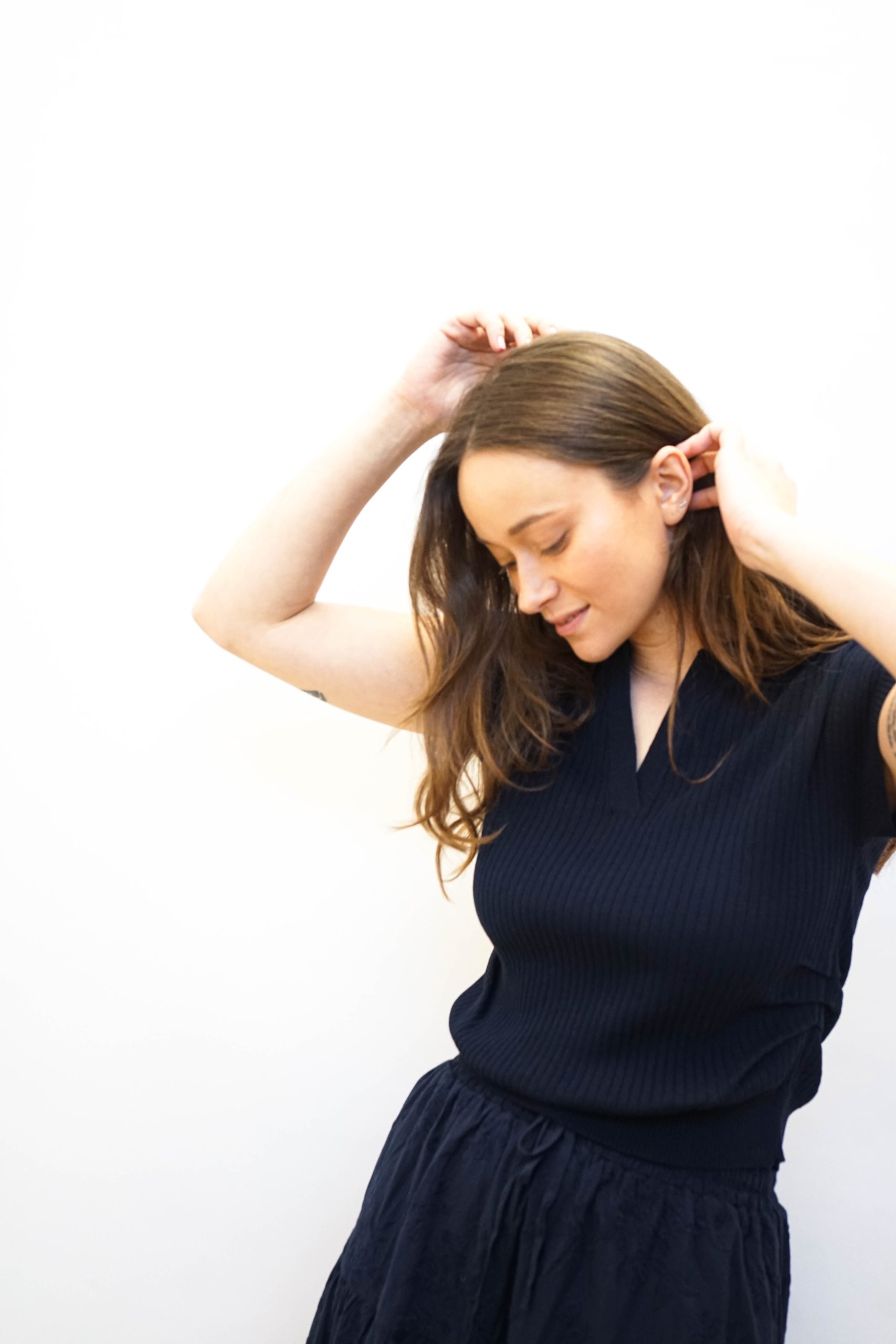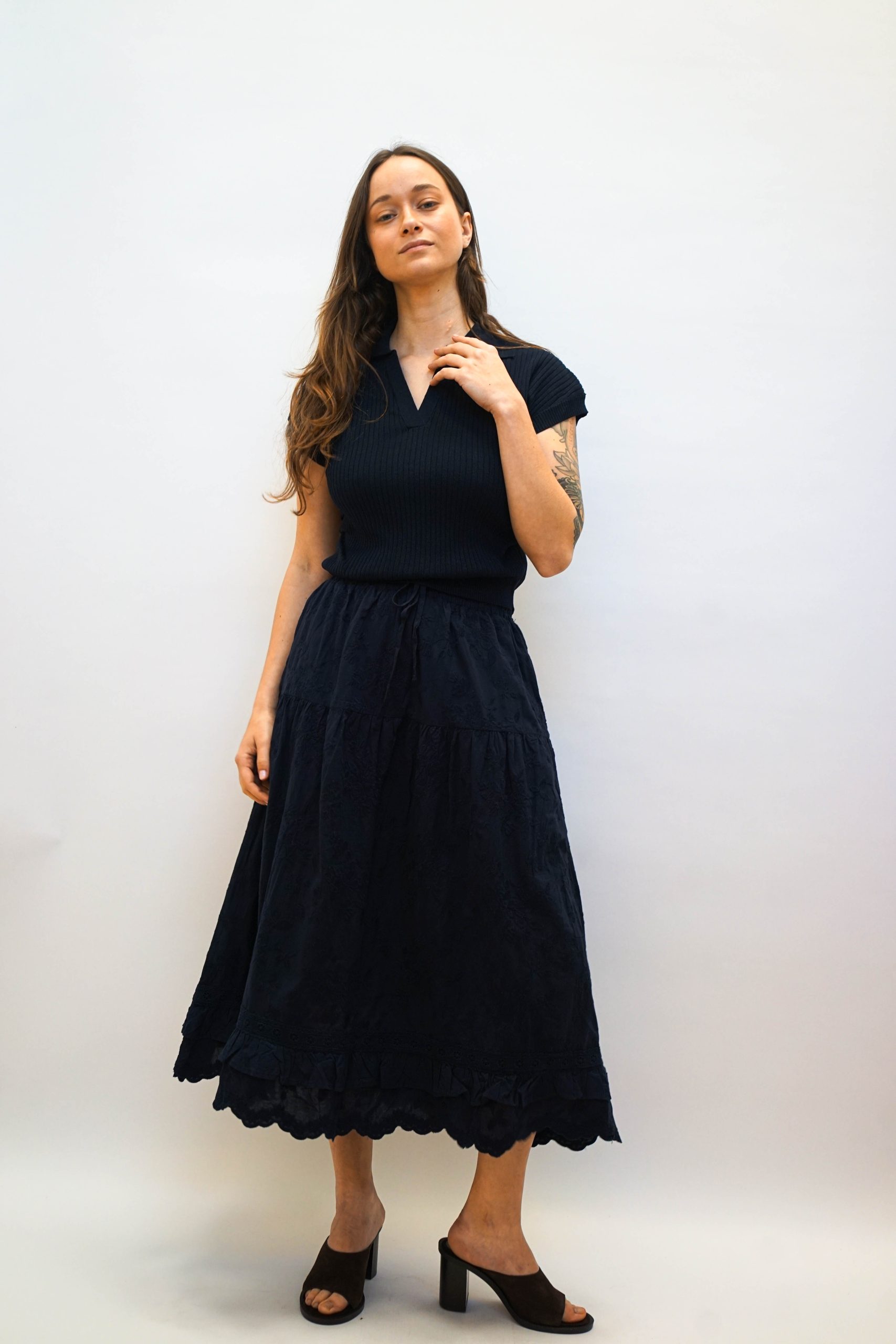 חולצת פולו סרוגה עם טקסטורת פסים לאורך בגזרה קרובה לגוף עם צווארון פולו ומחשוף V פתוח. עם כיווצים מחמיאים במותן וללא שרוולים. ניתן לשלב עם חצאית לוסי או חצאית פרחים בבד. היקף מטר אורך 54