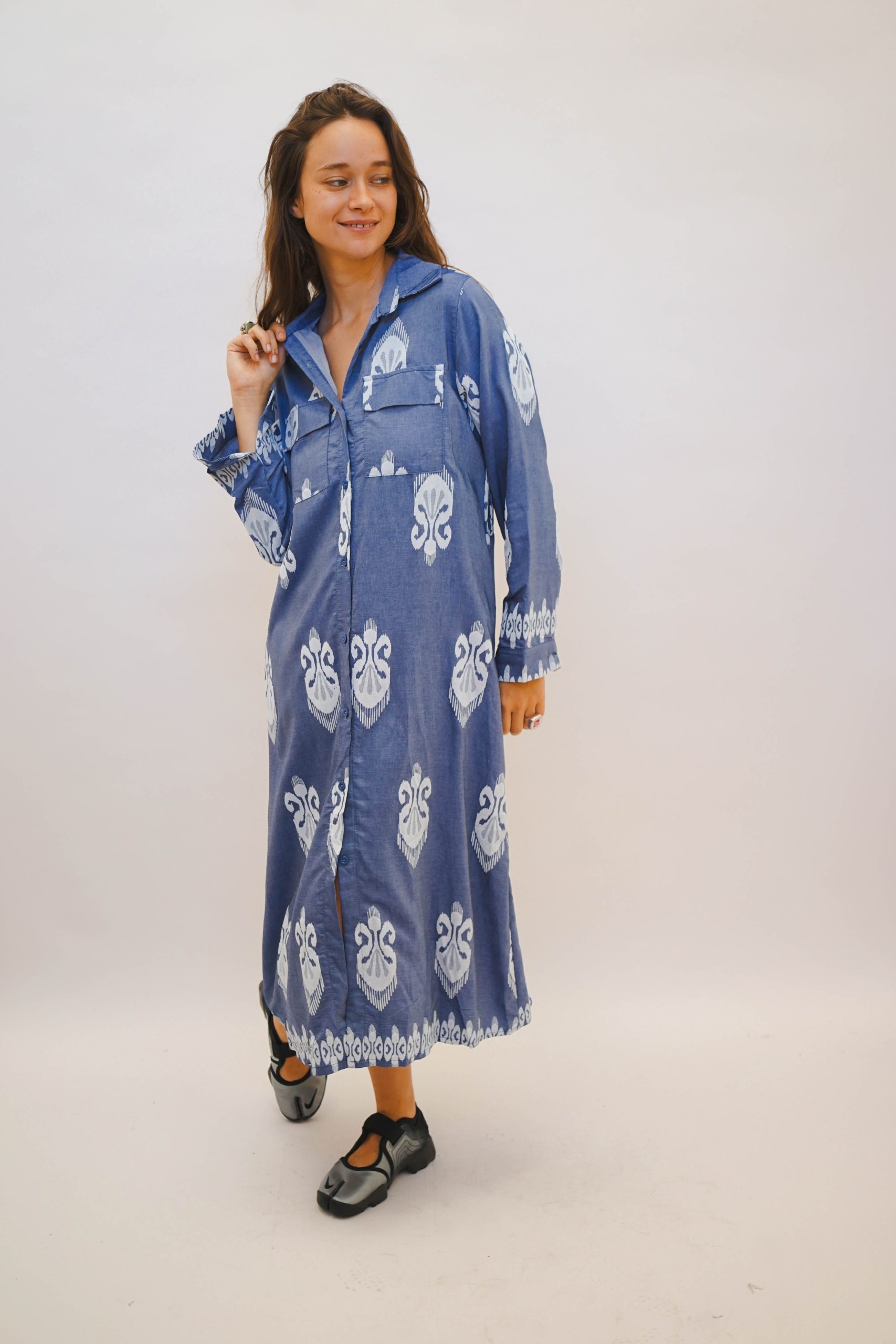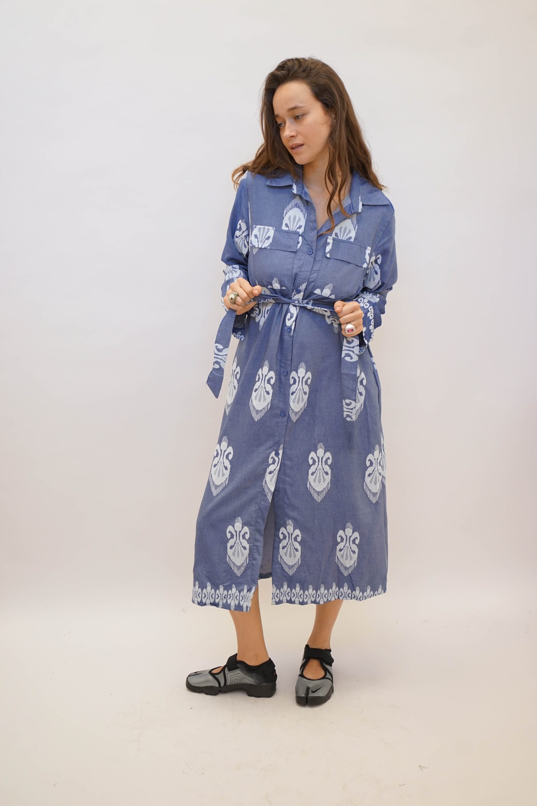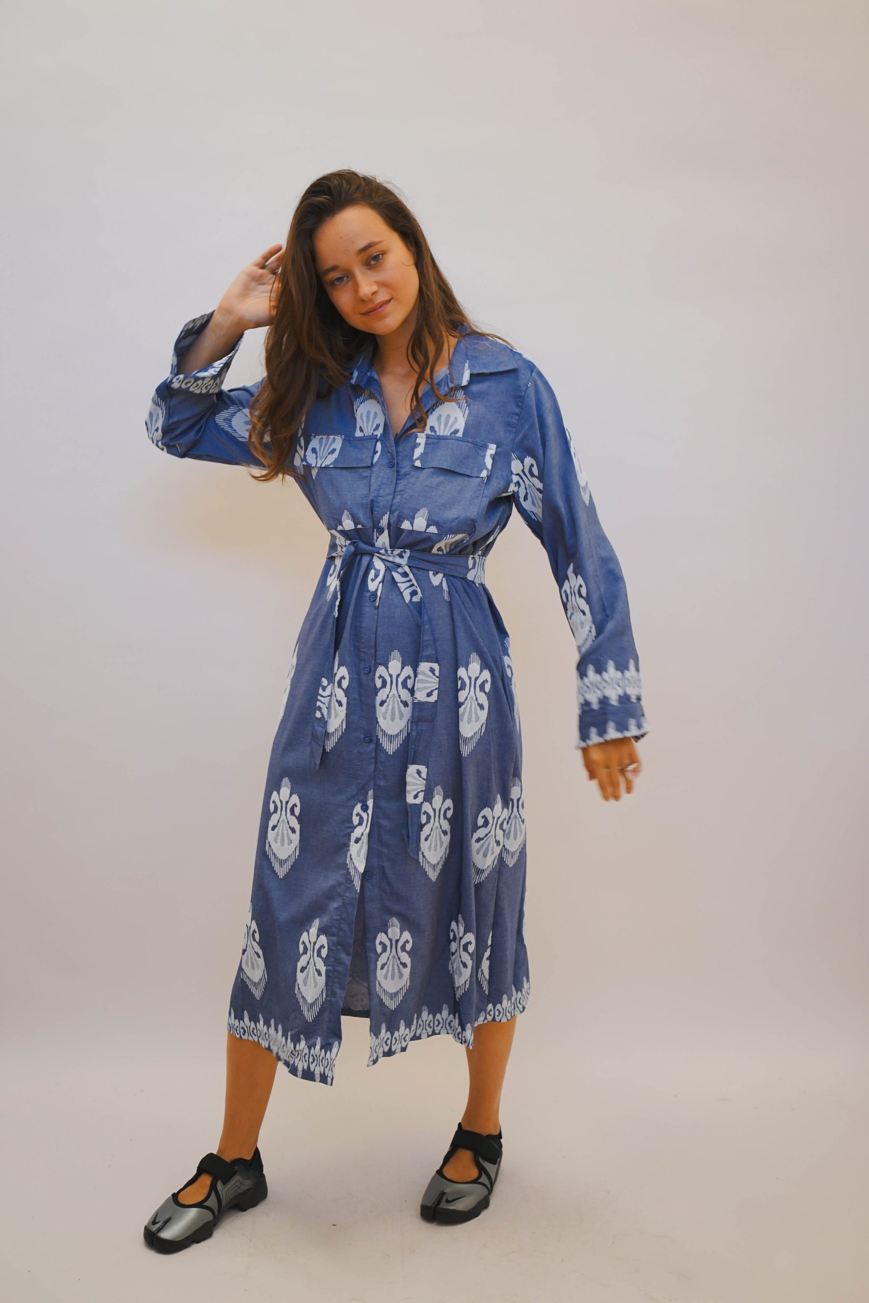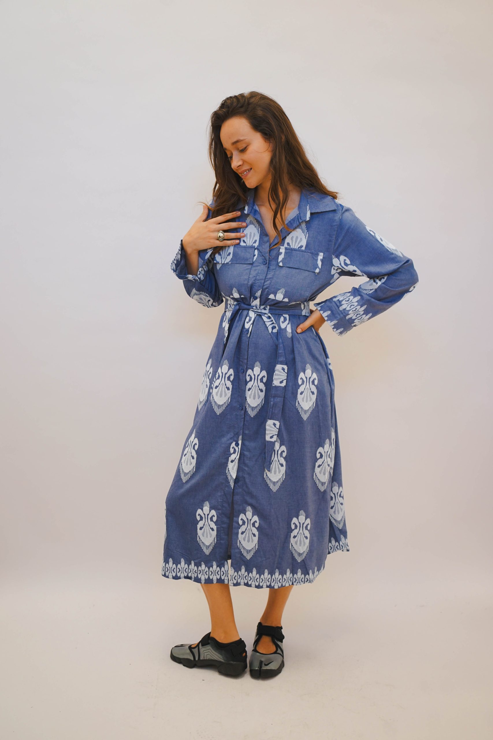 שמלת מידי עד מעל הברך כחולה בסגנון בוהו עם הדפס של תלתן בצבע לבן עם צווארון וקשירה מסביב למותן להדגשת הגזרה. תתאים לעונת הסתיו עם נעלי סניקרס למראה קליל, ניתן לשלב גם גרביון אטום ומגפיים עד הברך, או גרב עד הברך עם נעלי סניקרס או נעלי בובה למראה מיוחד.בחורף עם מעיל עבה יותר יהיה מושלם גם לארוע גם לערב או למשרד אורך 122 היקף 104