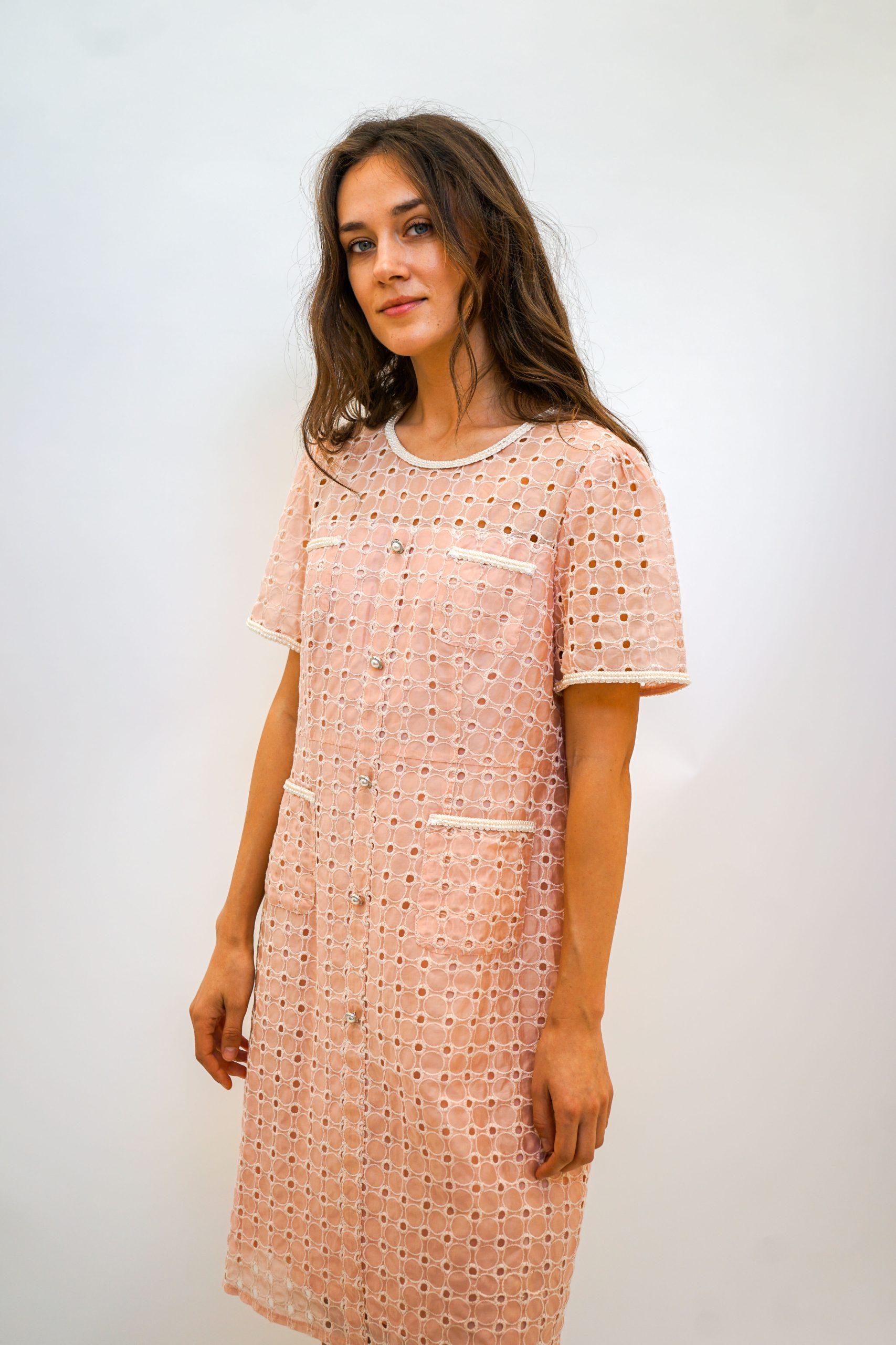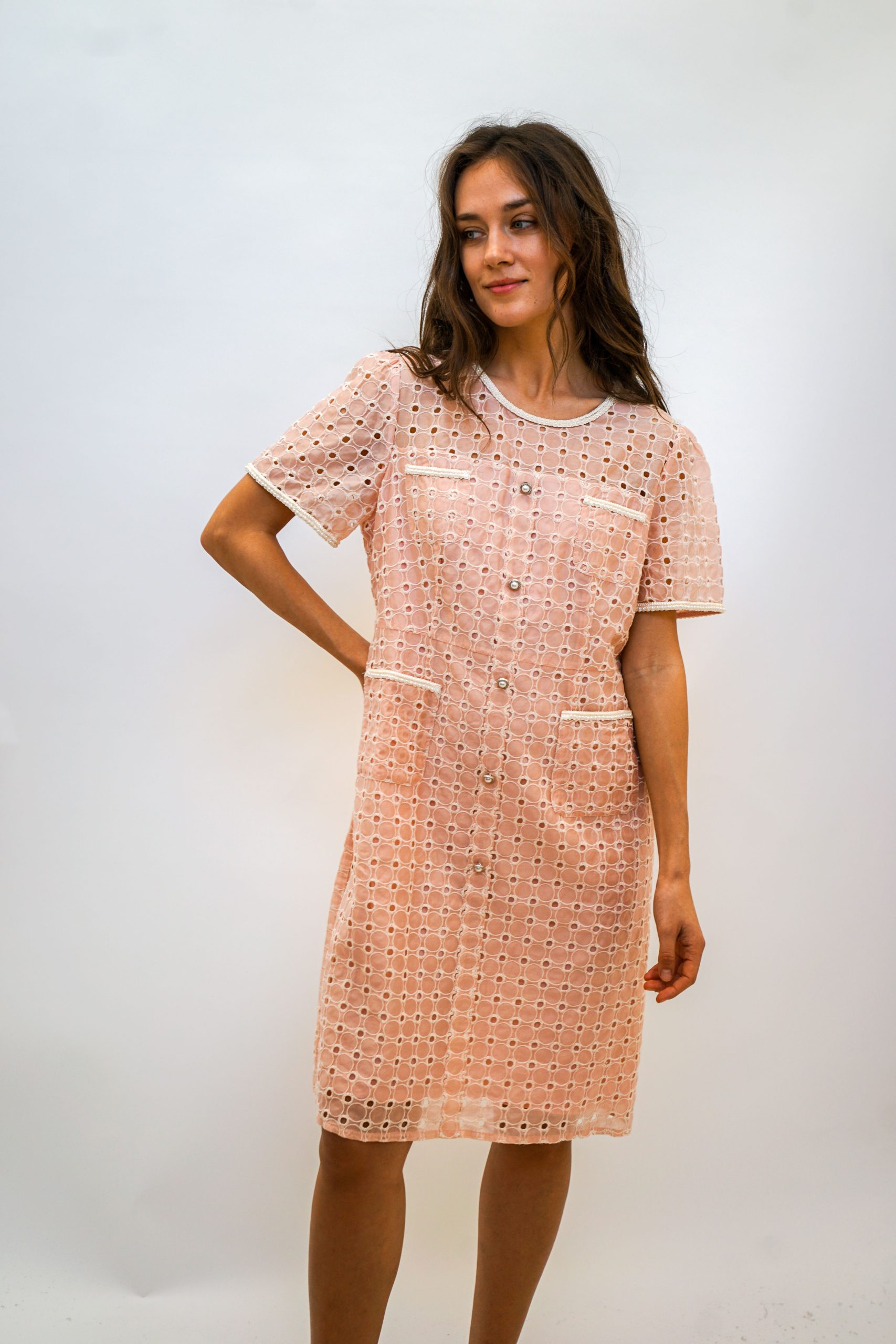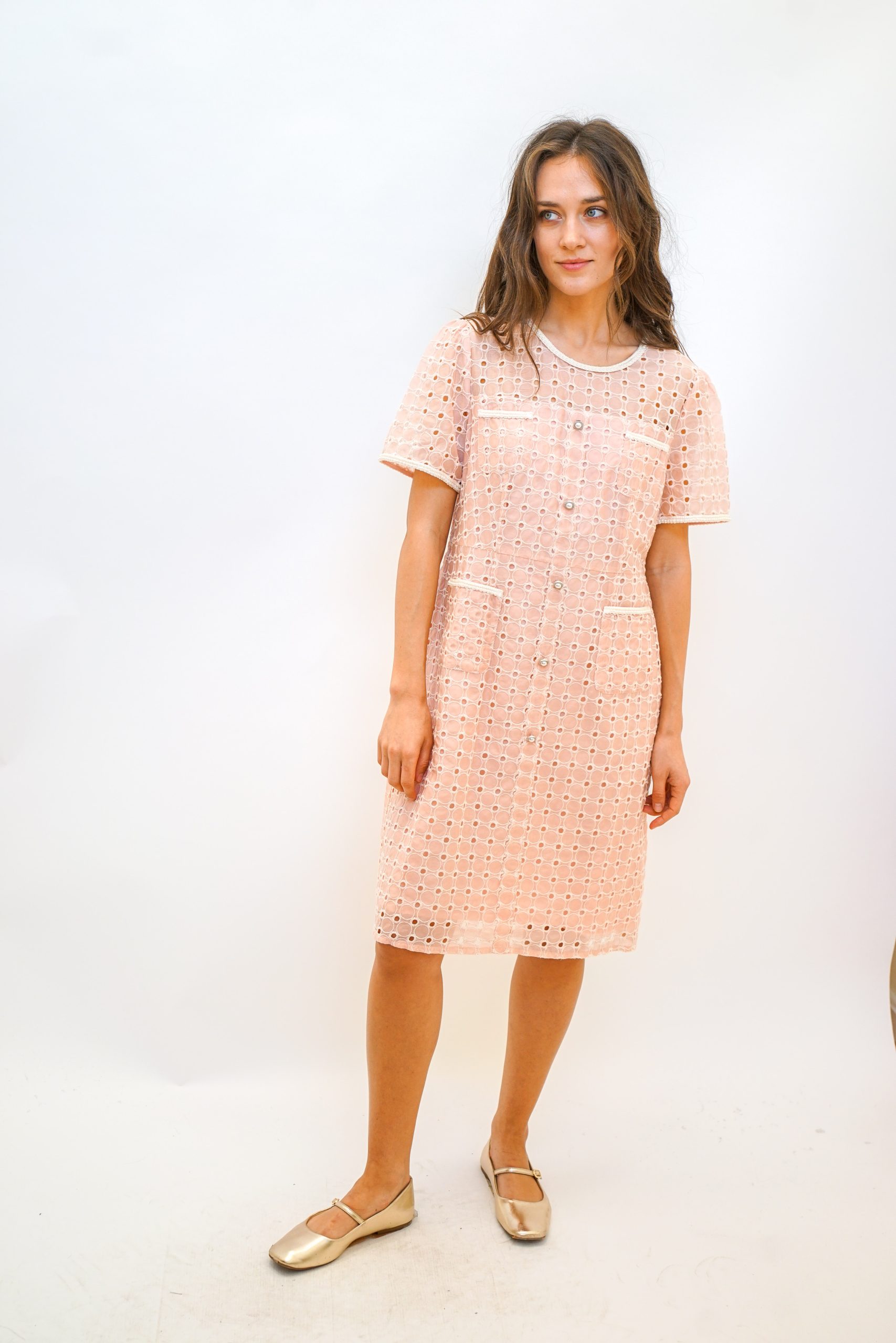 שמלה בסגנון שאנלי מתחרה ורודה עם תחתית ורודה לכן לא שקופה אורך השמלה מטר אחד כיסים כפתורי פנינה וחבלי שאנל מעטרים את הכיסים הכפתורים מוכספים שמלה מרשימה לחגים ובכלל ייחודית בסגנון ג'קי קנדי אורך 94 סמ