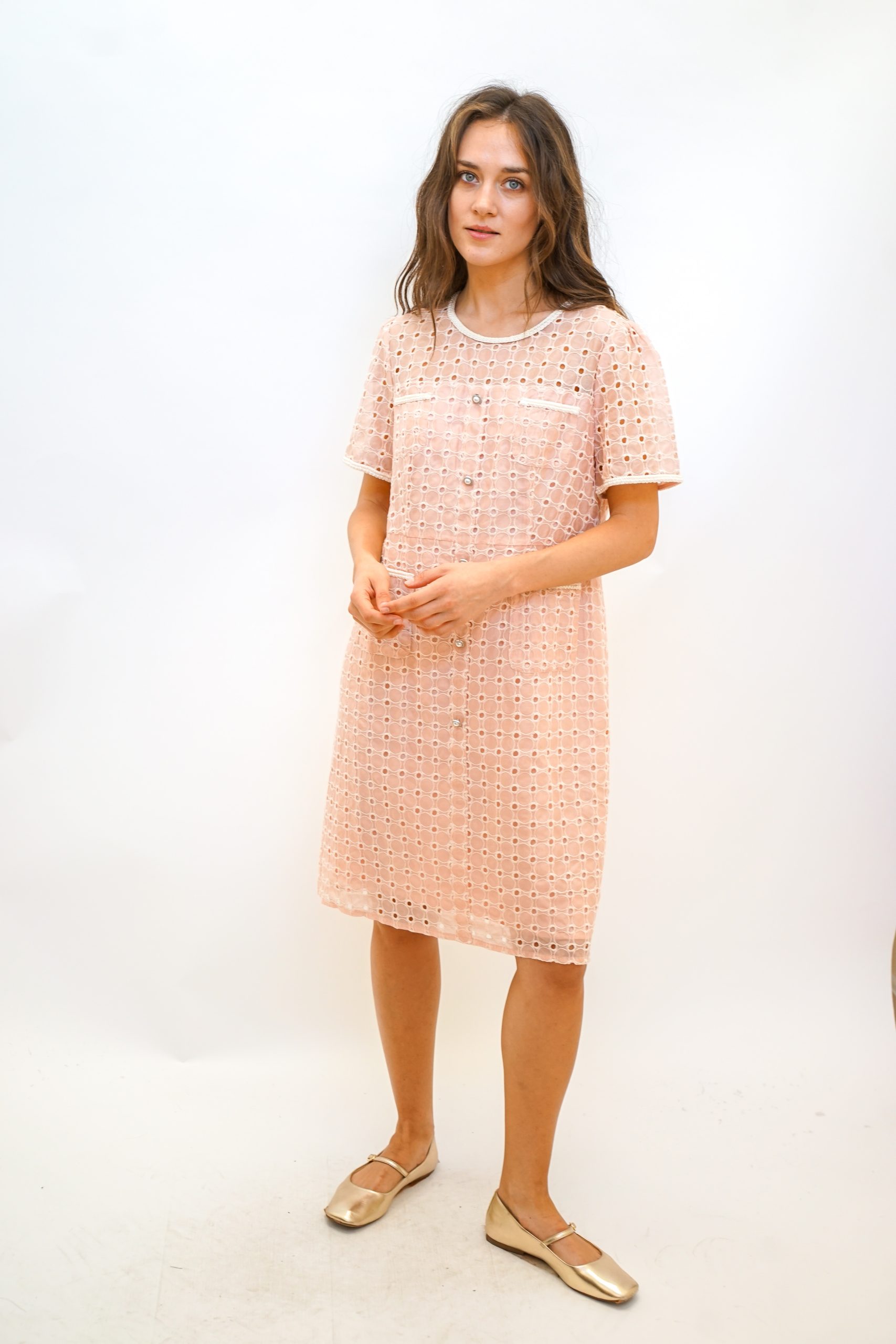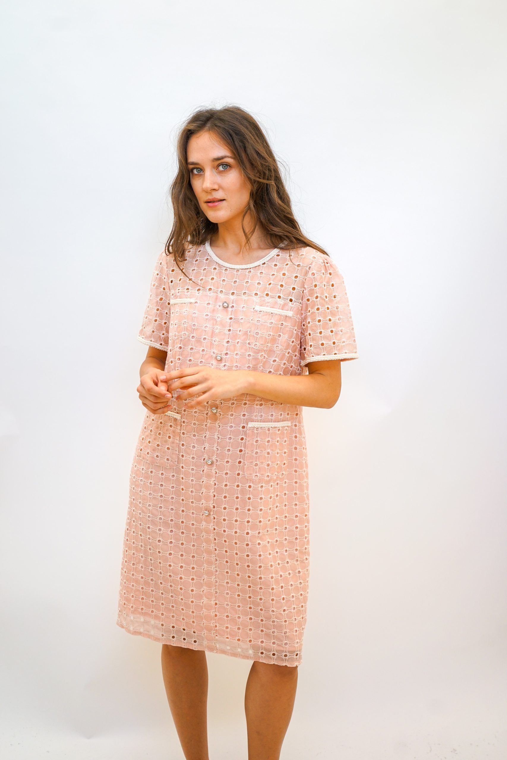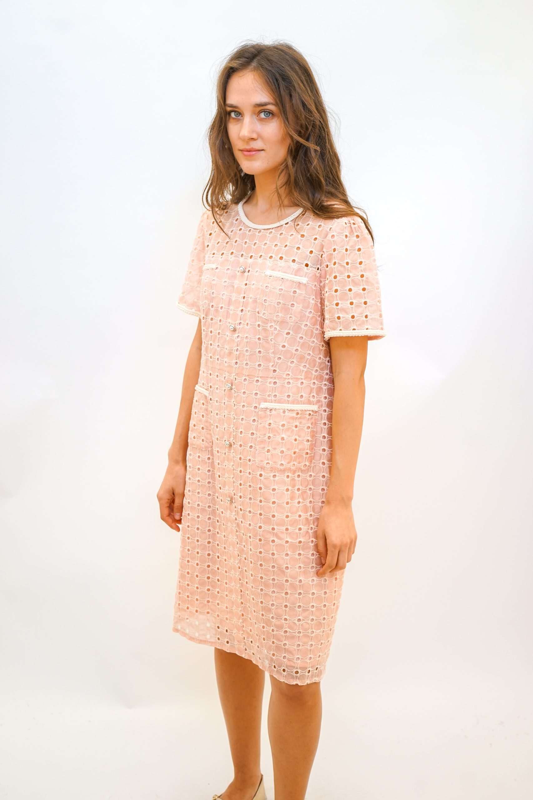 שמלה בסגנון שאנלי מתחרה ורודה עם תחתית ורודה לכן לא שקופה אורך השמלה מטר אחד כיסים כפתורי פנינה וחבלי שאנל מעטרים את הכיסים הכפתורים מוכספים שמלה מרשימה לחגים ובכלל ייחודית בסגנון ג'קי קנדי אורך 94 סמ